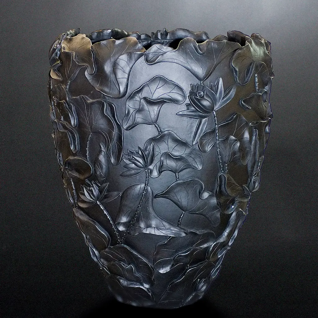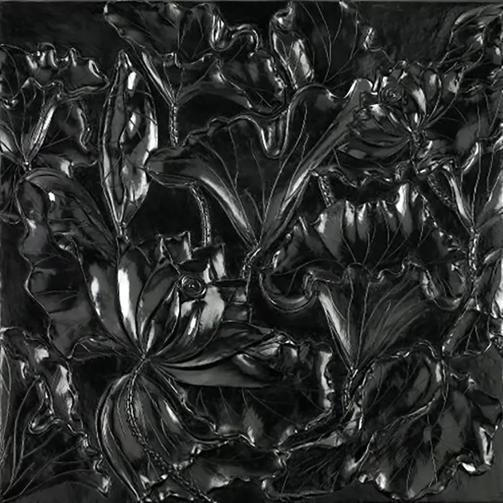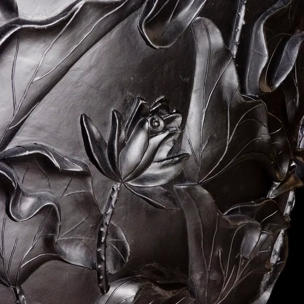 Masterfully handcrafted of matte black resin, this splendid vase will make a unique addition to a contemporary home. Its tall and capacious body is elegantly marked by hand-carved decorations of flowers lending a dynamic and textural character to the piece.