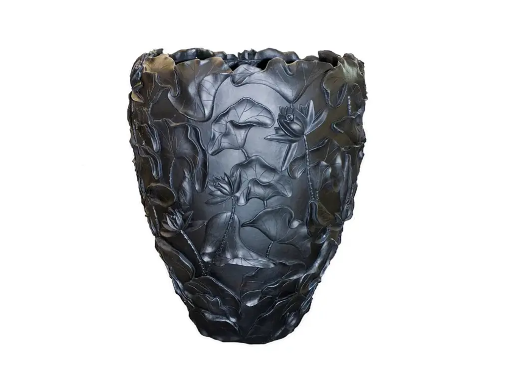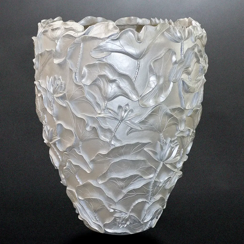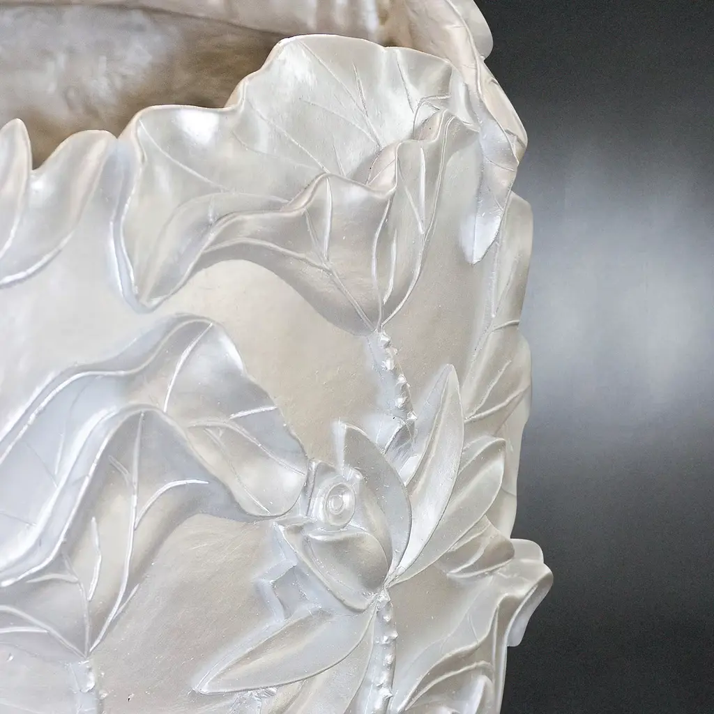 Characterized by fascinating and elegant hues, this resin vase flaunts a mother of pearl color that enhances the textural and floral decorations adorning it. A visually striking piece of functional decor, it will make a statement in a contemporary or minimalist living room or entryway console.