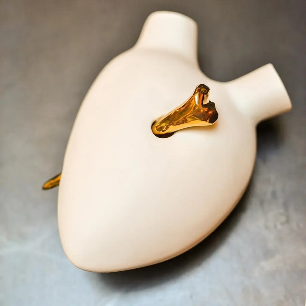 The heart collection is the result of the extravagant creativity of two innovative designers, who are inspired especially by the human body.This collection is made by 4 beautiful pieces all handmade in Italy. The hearts take up the symbolism of love, nature, human body and our feelings. Sometimes love can hurts, but it will always be the driving force of our lives. These Biscuit porcelain Hearts are not only sculptures, each one is a vase that you can hang on the wall and fullfill with fresh flowers or ornamental flowers.This collection is entirely handmade. The material used is porcelain, of Limoges (France) and German origin, fired at 1260 C. The shape of heart is made by casting in plaster moulds. The sculptures (thorns, coral, birds,..) are added to the heart immediately after finishing. The object is first fired at 980 C and then painted using metal oxides. Then glass is applied to the parts that need to be polished. After a second cooking, the piece is finished.The whole process is strictly handmade so small imperfections in shape and color and differences in gloss are due to the manual processing.