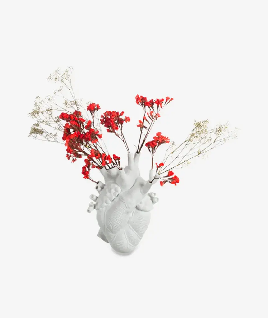 Anatomically correct human heart made of porcelain. Vase can be hung on wall or sit on any flat surface. Stand included.