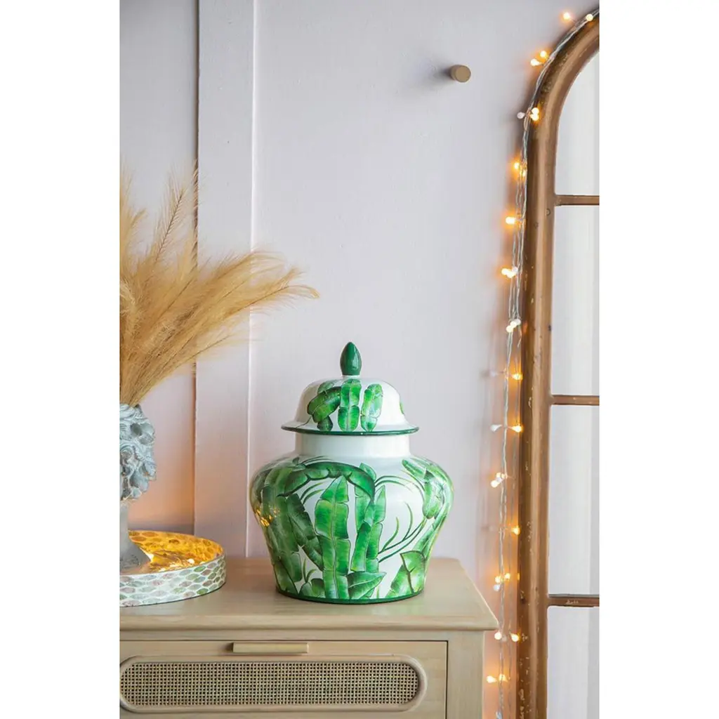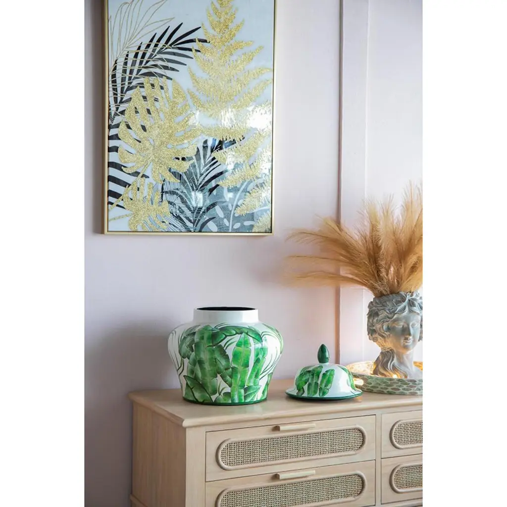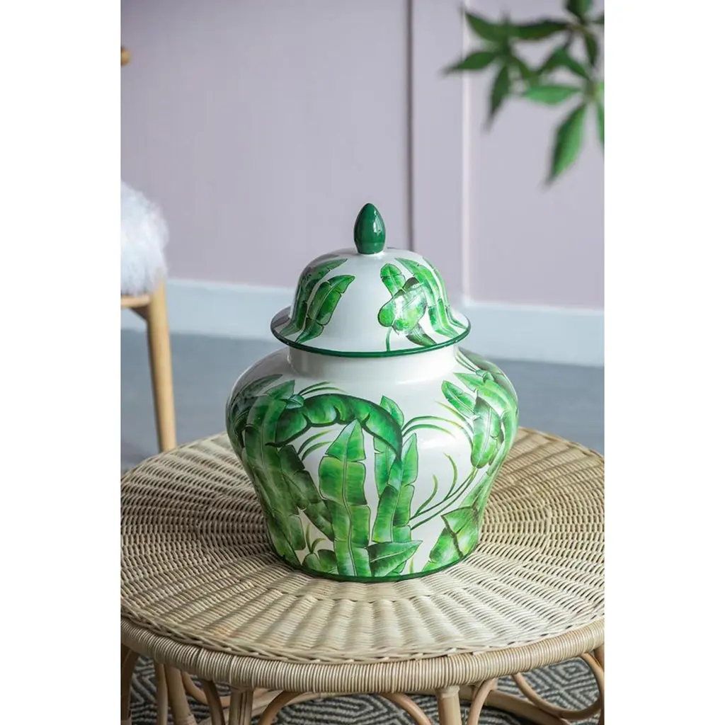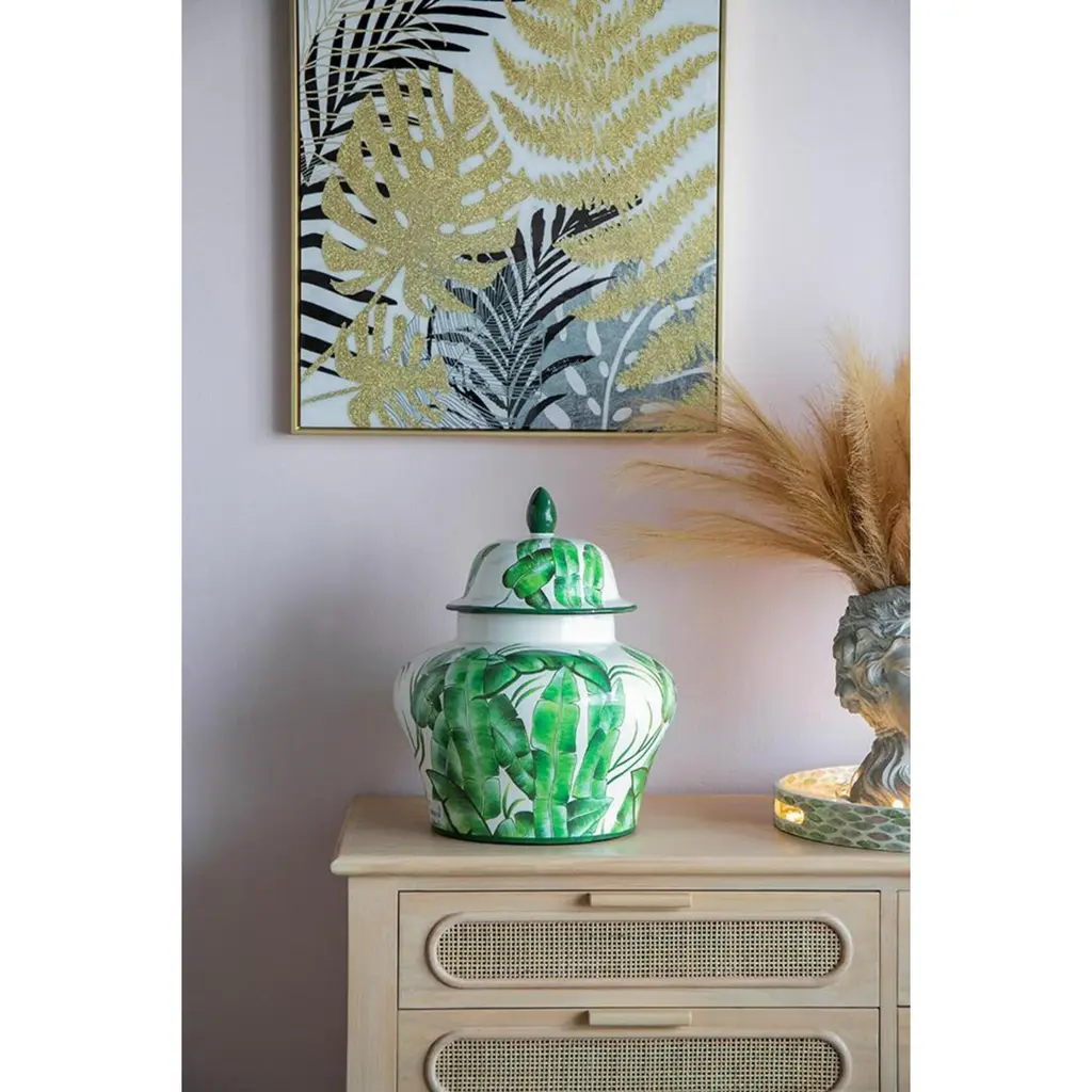 This wide Lovise Palm Lidded Urn features a classic shape with carefully painted palm leaves for a graceful, sleek look that complements a variety of spaces. Add this piece to a tropical sunroom, beach house kitchen, or airy master bathroom to provide convenient storage and beautiful style. This urn enhances any room with its crisp, verdant look.
