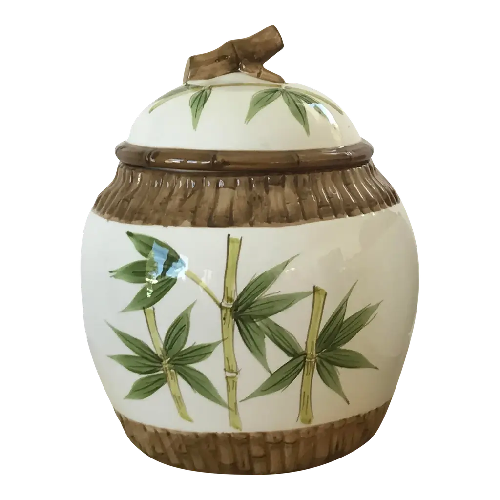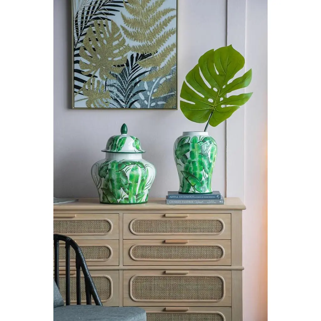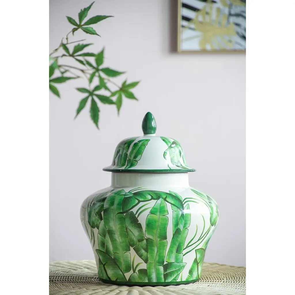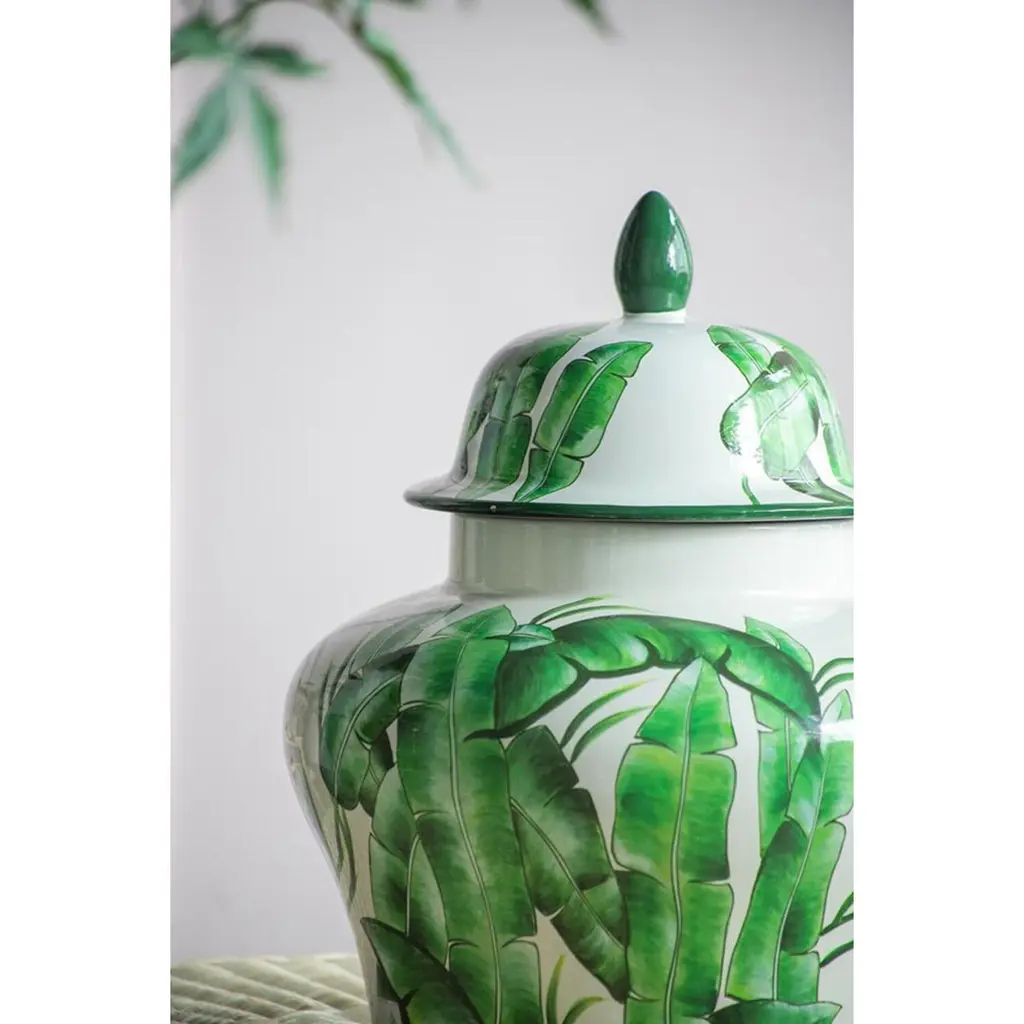 This wide Lovise Palm Lidded Urn features a classic shape with carefully painted palm leaves for a graceful, sleek look that complements a variety of spaces. Add this piece to a tropical sunroom, beach house kitchen, or airy master bathroom to provide convenient storage and beautiful style. This urn enhances any room with its crisp, verdant look.