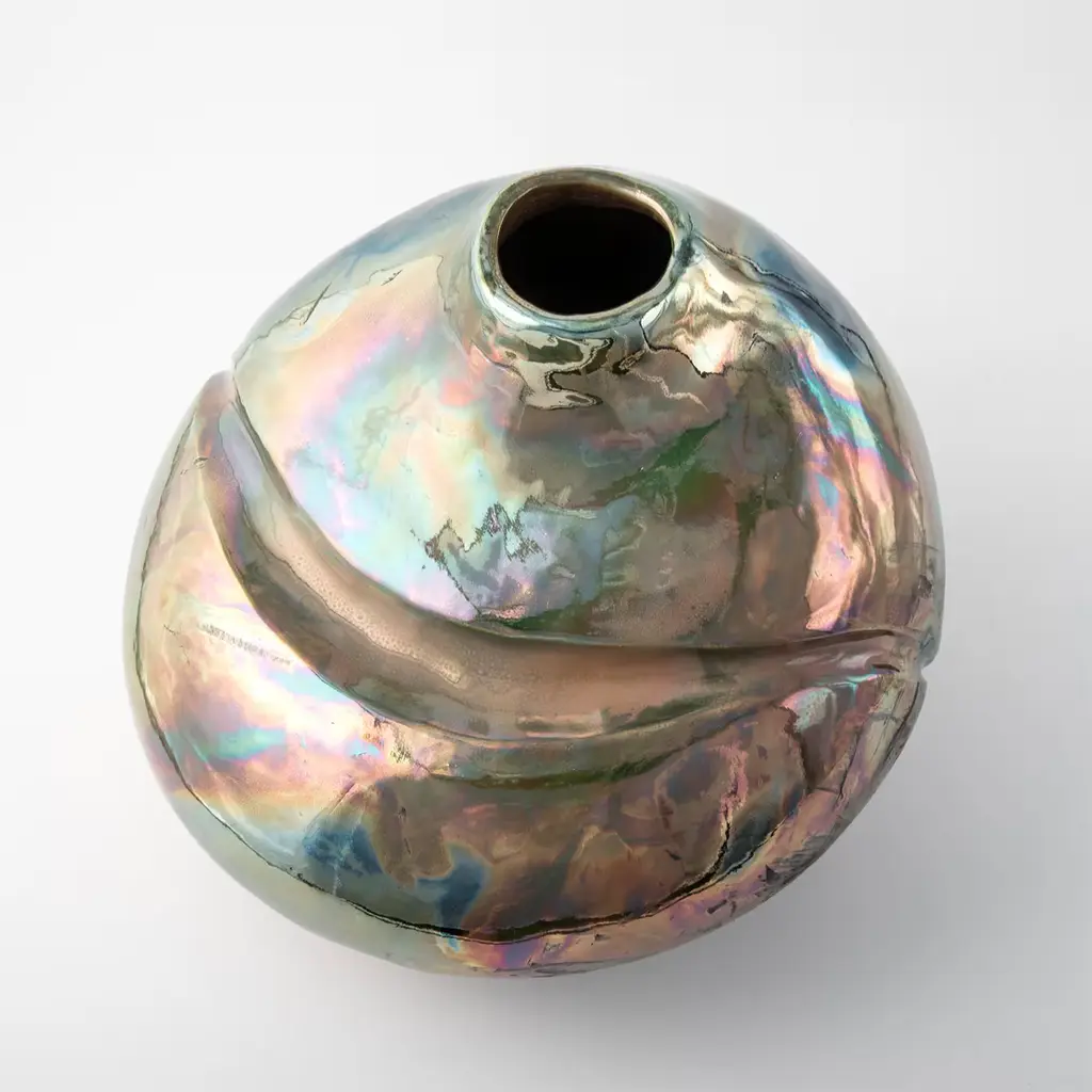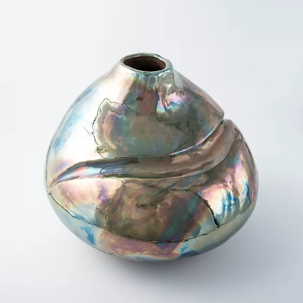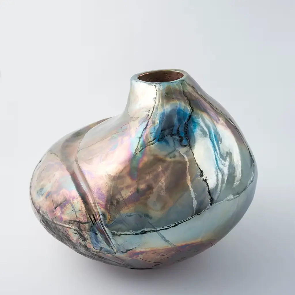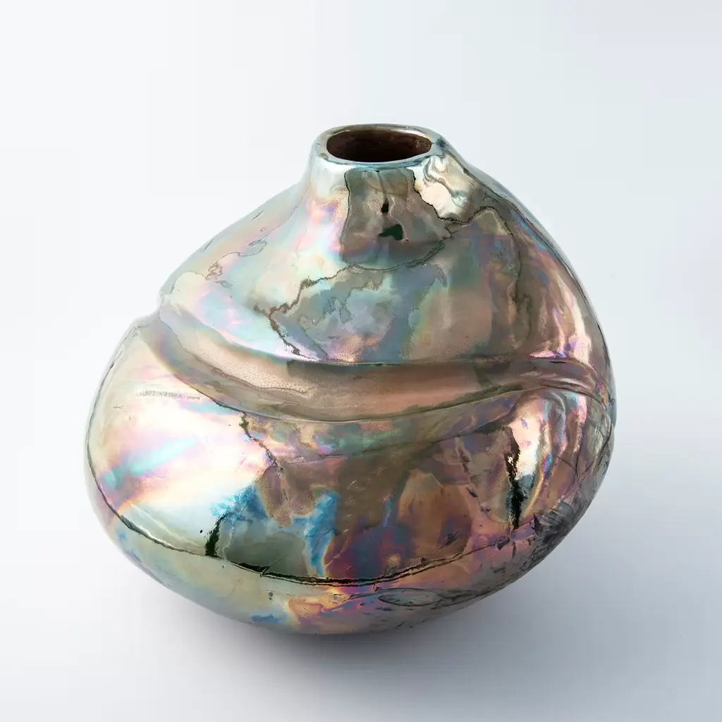 Named after the poetic suggestion of lights illuminating a small square on the island of Capri, this singular vase in glazed ceramic never fails to seduce with its sensual sculptural silhouette. A spectacular metallic finish rich in iridescent effects characterizes the piece, which Nino Basso minutely molded by hand combining the coiling and Japanese Raku methods. Enriched with a bold groove enhancing its fluidity, each piece is followed by care instructions and an authenticity certificate.
