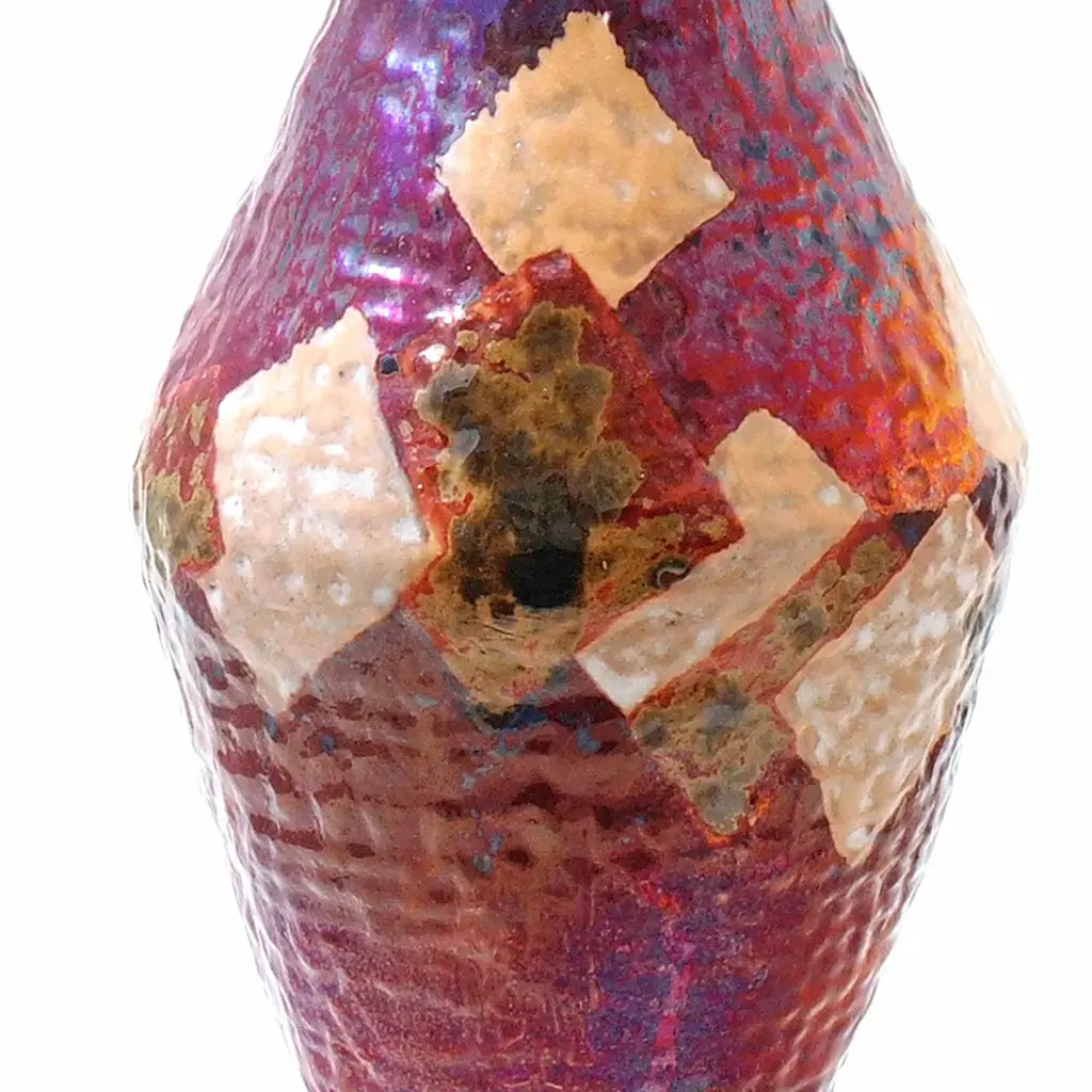 Entirely one-of-a-kind, this superb vase evokes a spontaneous sense of astonishment. The hammered silhouette boasts a mix of iridescent shades with a distinctive luster finish obtained with a reduction firing at high temperature that vitrifies the olive green, silver nitrate, and cobalt. Free geometric shapes enliven the center of the vase that undergoes a final firing at 950°. Differences are to be expected from the pictured version due to the handcrafted quality of each piece.