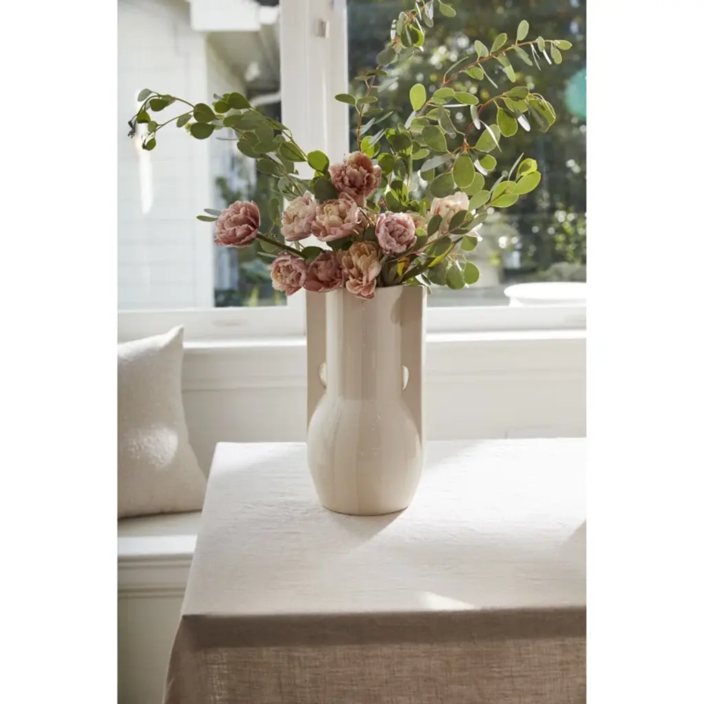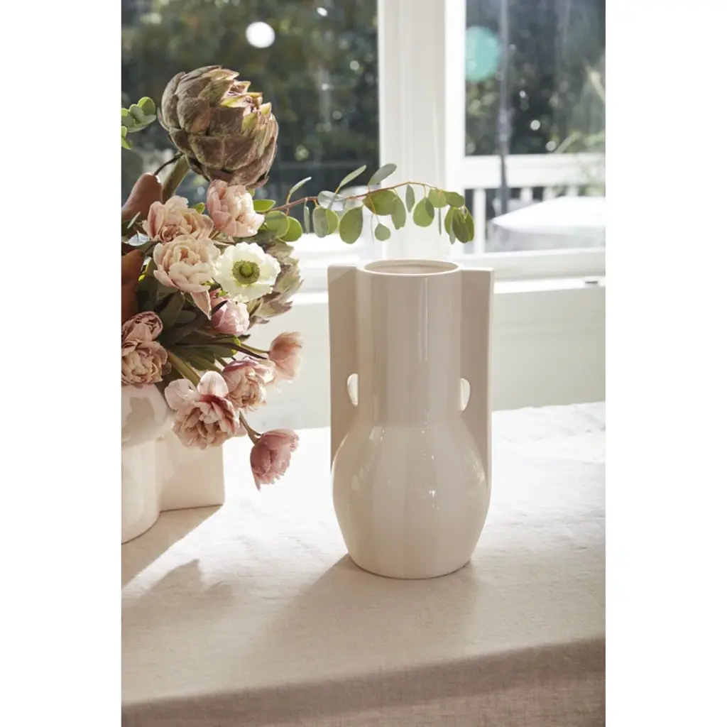 The creative possibilities are endless with the ceramic Luis Vase, whether used as a decorative accent piece or floral vessel. This minimalist, watertight vase features unique flat handles for modern flair on the classic vase shape & alternating glossy & matte stripes on natural white clay. With its neutral hues & interesting design, this sculptural vase adds eye-catching dimension to any room & complements bright fresh or dried florals.