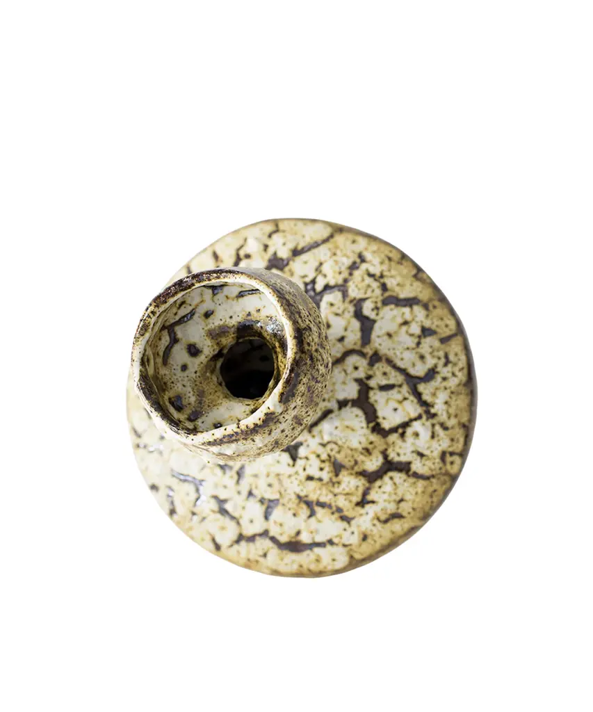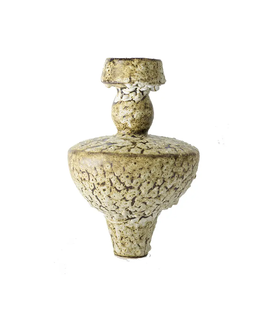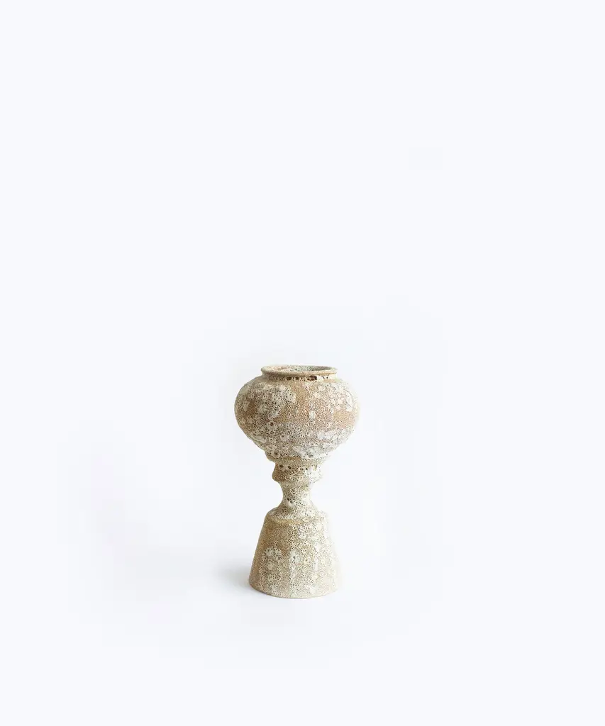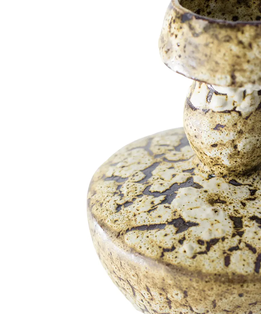 The N.3 series results from analyzing the different types of vases found in the Mediterranean basin, especially from Ancient Greece and Rome. The collection combines ancient forms and shapes with experimental surface treatments featuring glazes and contemporary elements. These pieces are made of stoneware with grog from Manises (Valencia), using the plaster casting technique. Their surfaces are obtained by applying self-formulated glazes in various layers. The stoneware vase in handmade to order by the Valencia-based studio, Canoa Lab.