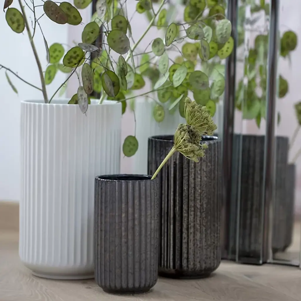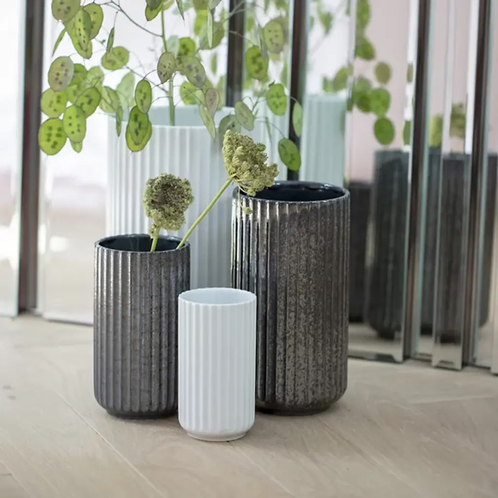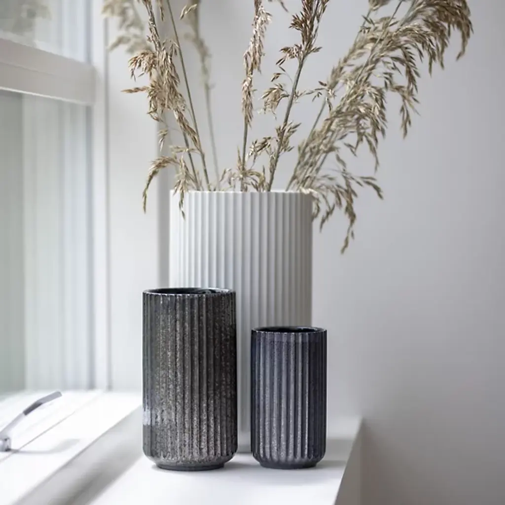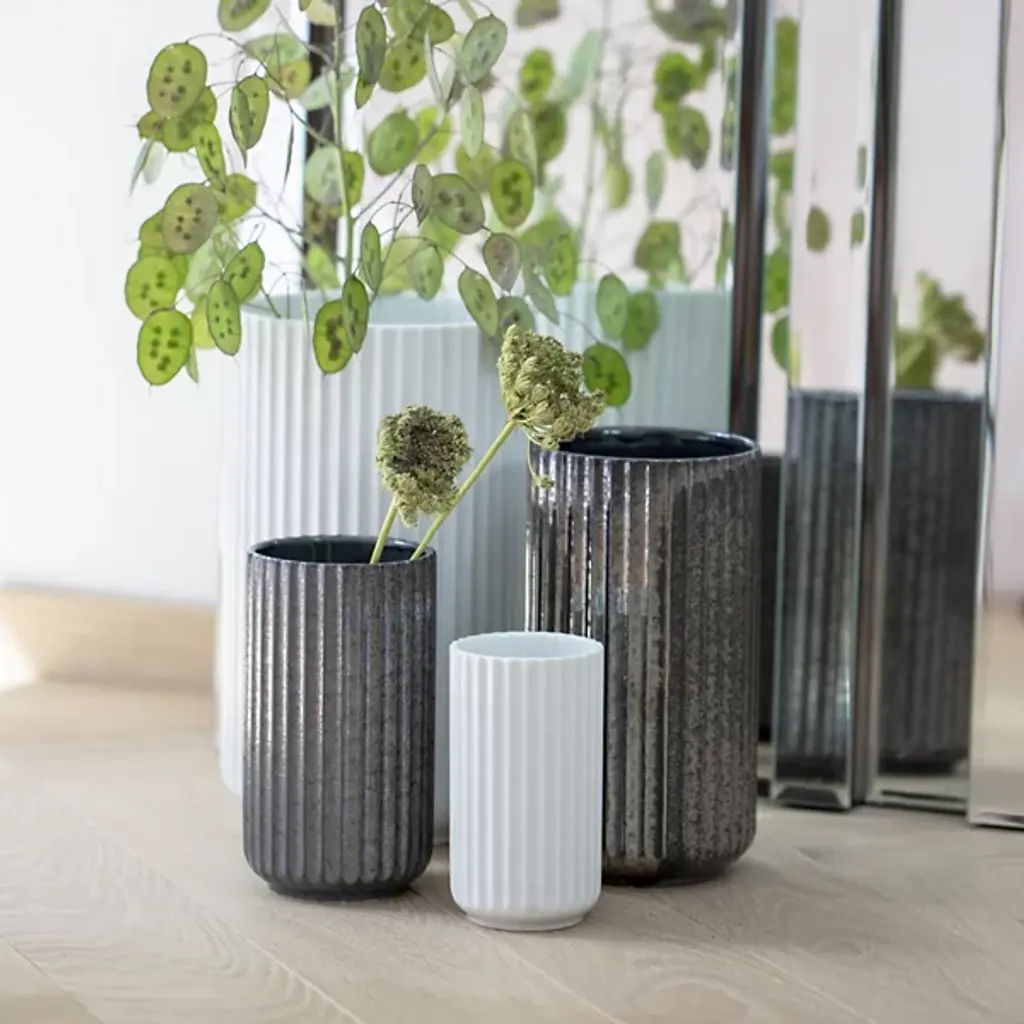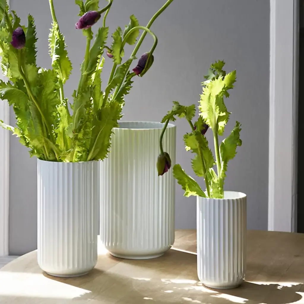 The Lyngby Porcelain Vase from Lyngby Porcelæn stands as a recognized Danish design classic with its vertical ribbing that runs from base to rim. Designed by Karakter Copenhagen, this vessel achieves both visual impact and practical purpose through its clean, cylindrical form. Each ridge catches light individually, creating subtle variations in brightness that enhance the porcelain material quality. The proportions balance height with stability, making it suitable for both fresh and dried arrangements. This enduring design has graced Danish homes for decades, proving its timeless appeal through minimalist functionality.