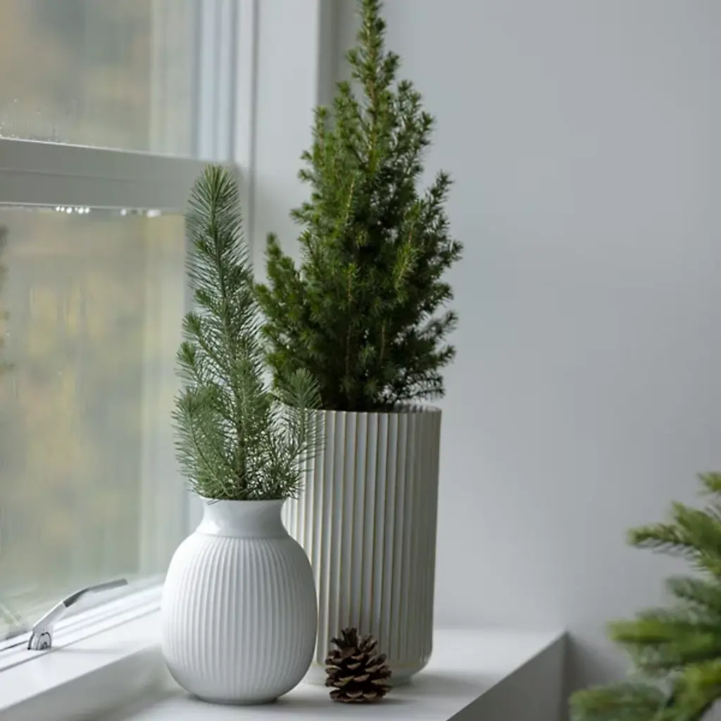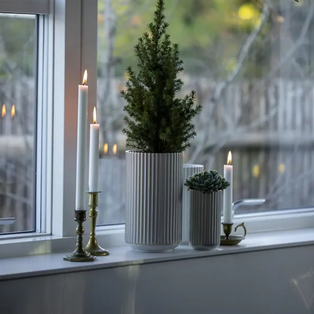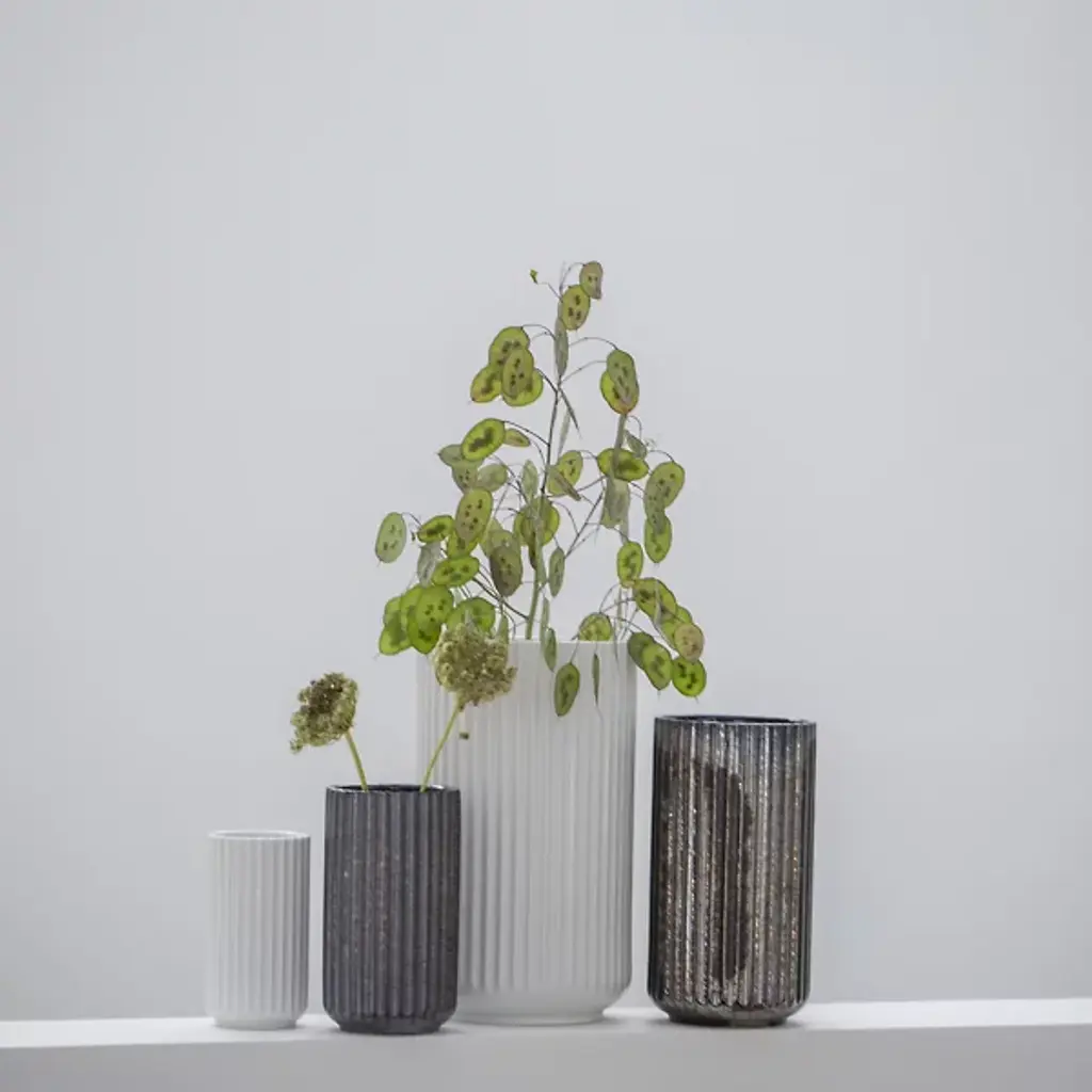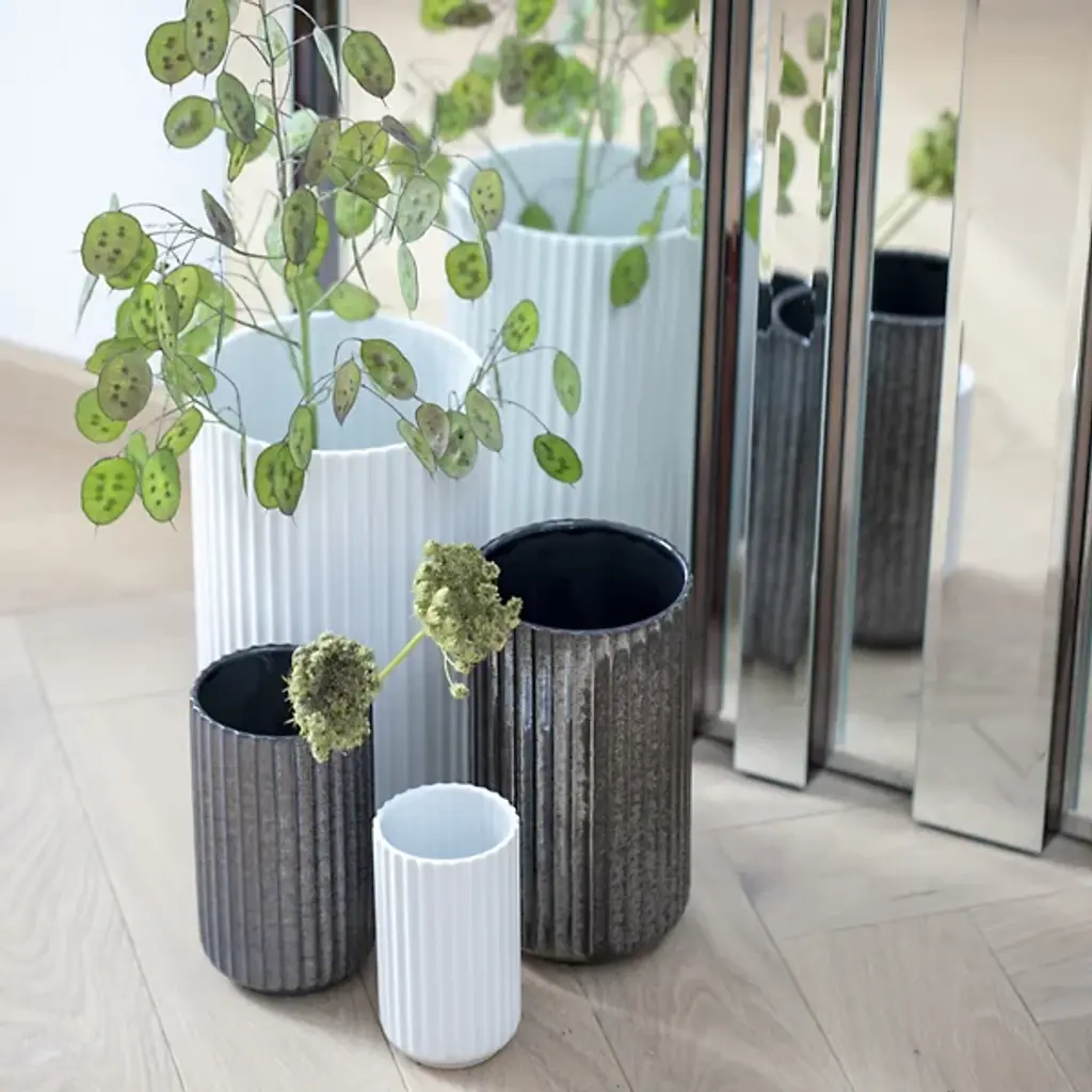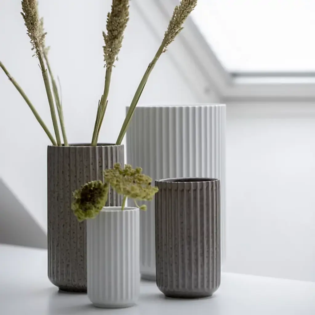 The Lyngby Porcelain Vase from Lyngby Porcelæn stands as a recognized Danish design classic with its vertical ribbing that runs from base to rim. Designed by Karakter Copenhagen, this vessel achieves both visual impact and practical purpose through its clean, cylindrical form. Each ridge catches light individually, creating subtle variations in brightness that enhance the porcelain material quality. The proportions balance height with stability, making it suitable for both fresh and dried arrangements. This enduring design has graced Danish homes for decades, proving its timeless appeal through minimalist functionality.