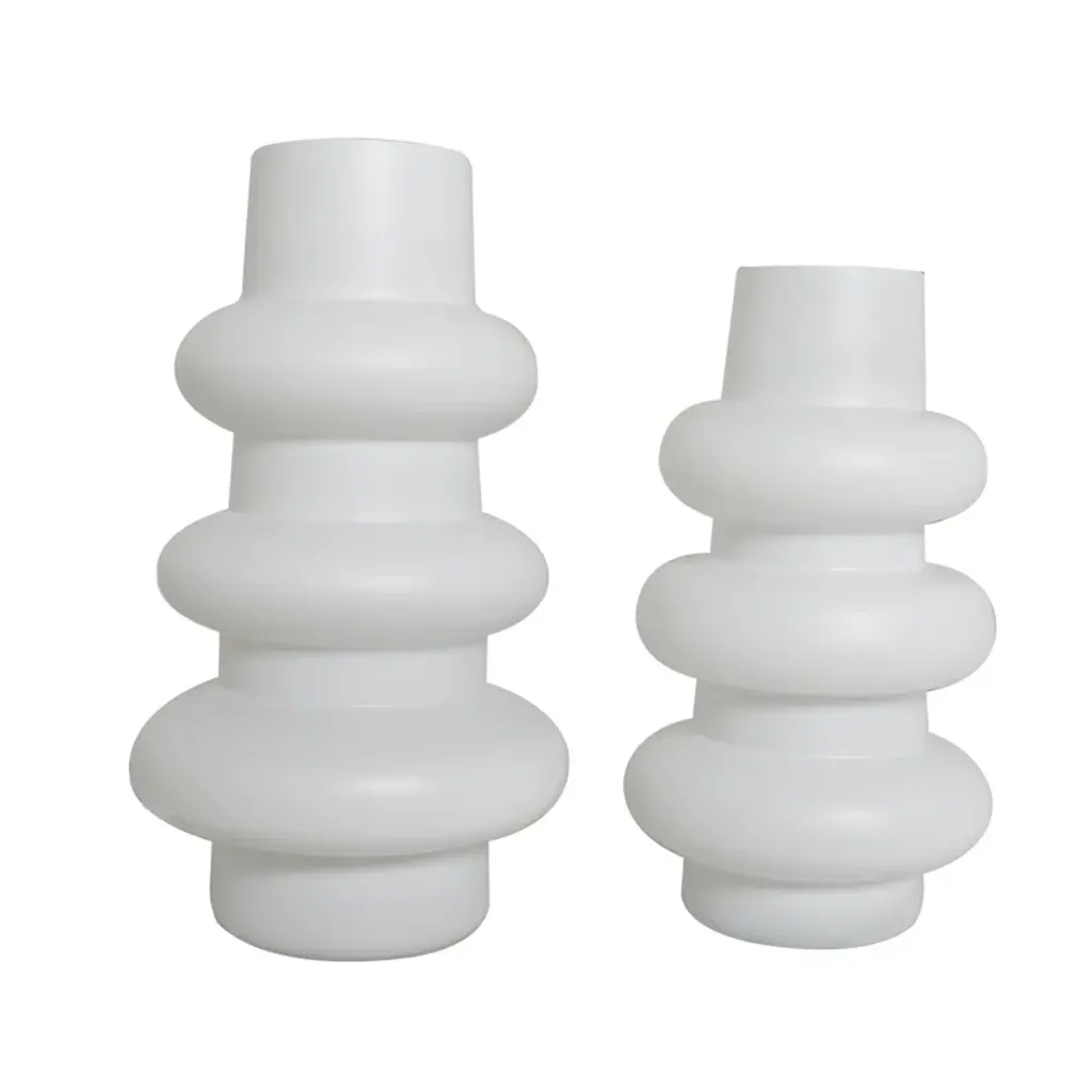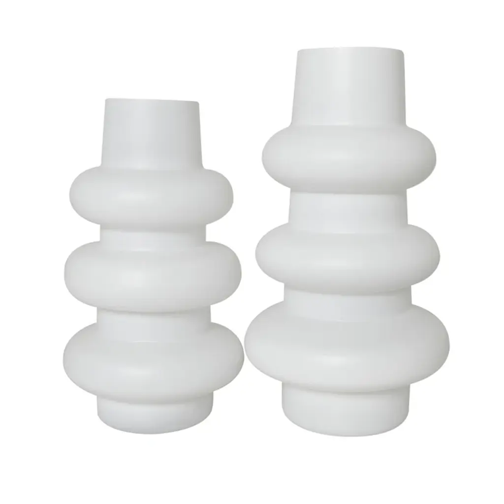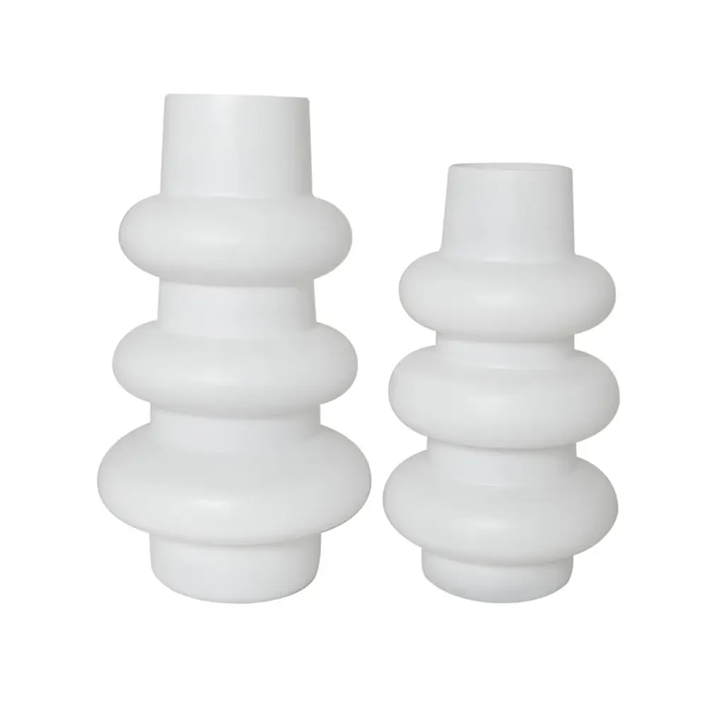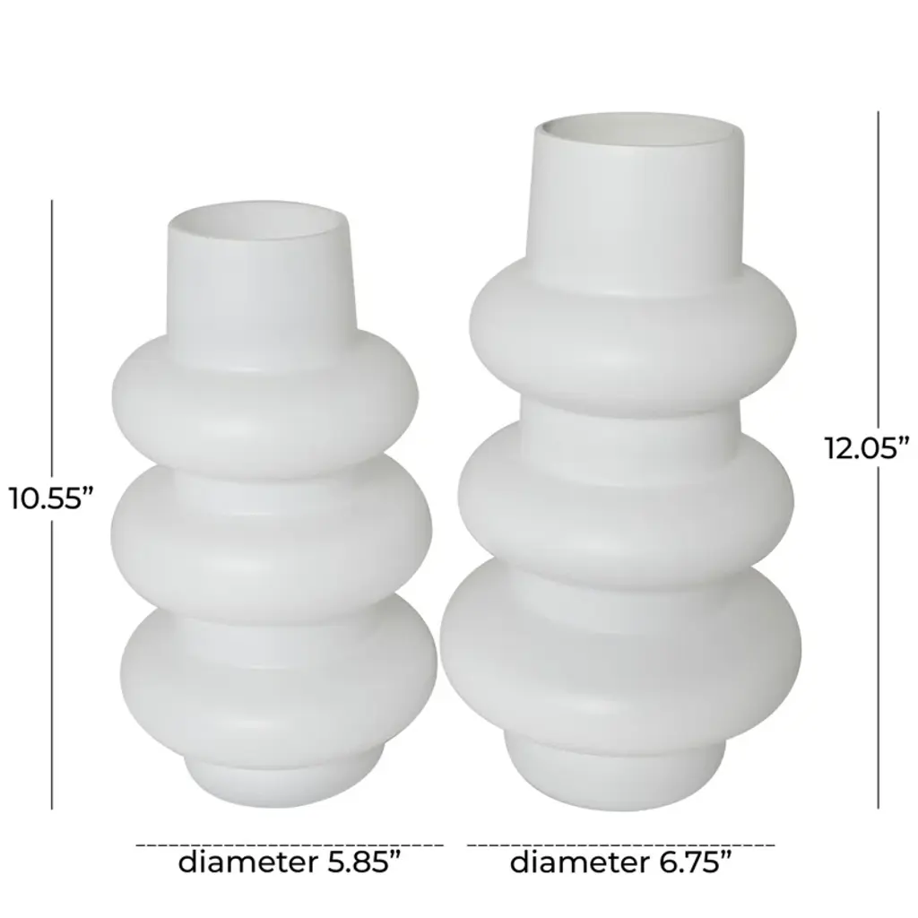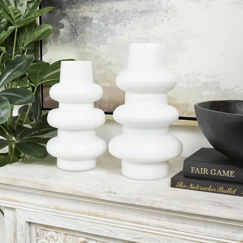 Use these vases as stand-alone pieces or group them together in your living space for a bold statement piece. Designed with felt or rubber stoppers at the base that prevent scratching furniture and table tops, as well as sliding around. This item ships in 1 carton. The glass vase makes a great gift for any occasion. Suitable for indoor use only. This item ships fully assembled in one piece. Made in India. This black or white colored vase comes as a set of 2. Modern style. Vases have 3 in and 2.5 in mouth openings.