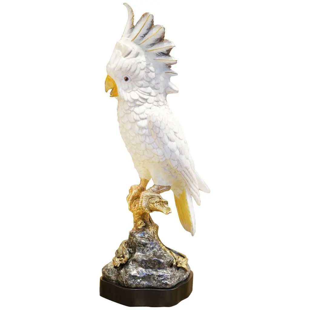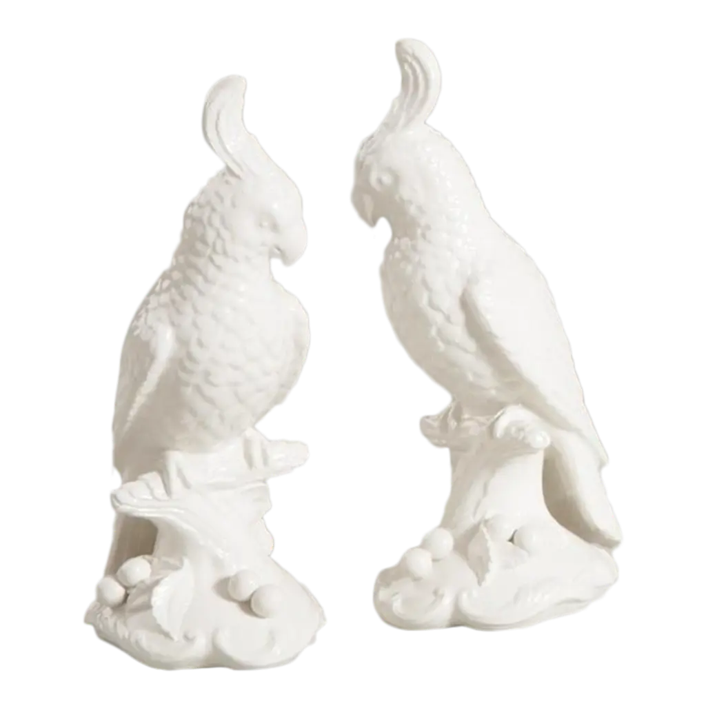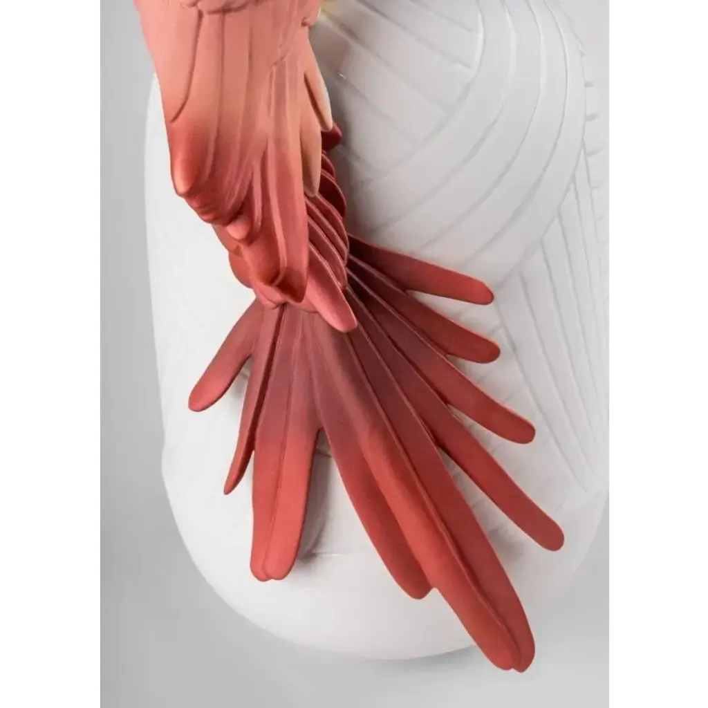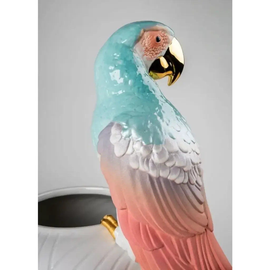Porcelain vase featuring a big, brightly colored macaw. An iconic Spanish brand, Lladro is a world leader in the creation of porcelain art. Started by brothers Juan, Jose and Vicente Lladro in 1953, the ceramic figurines were initially inspired by the works of great European manufacturers like Meissen and Sevres. Over time, a unique style was forged, consisting of elongated lines, a revolutionary single-firing method, and soft pastel tones.