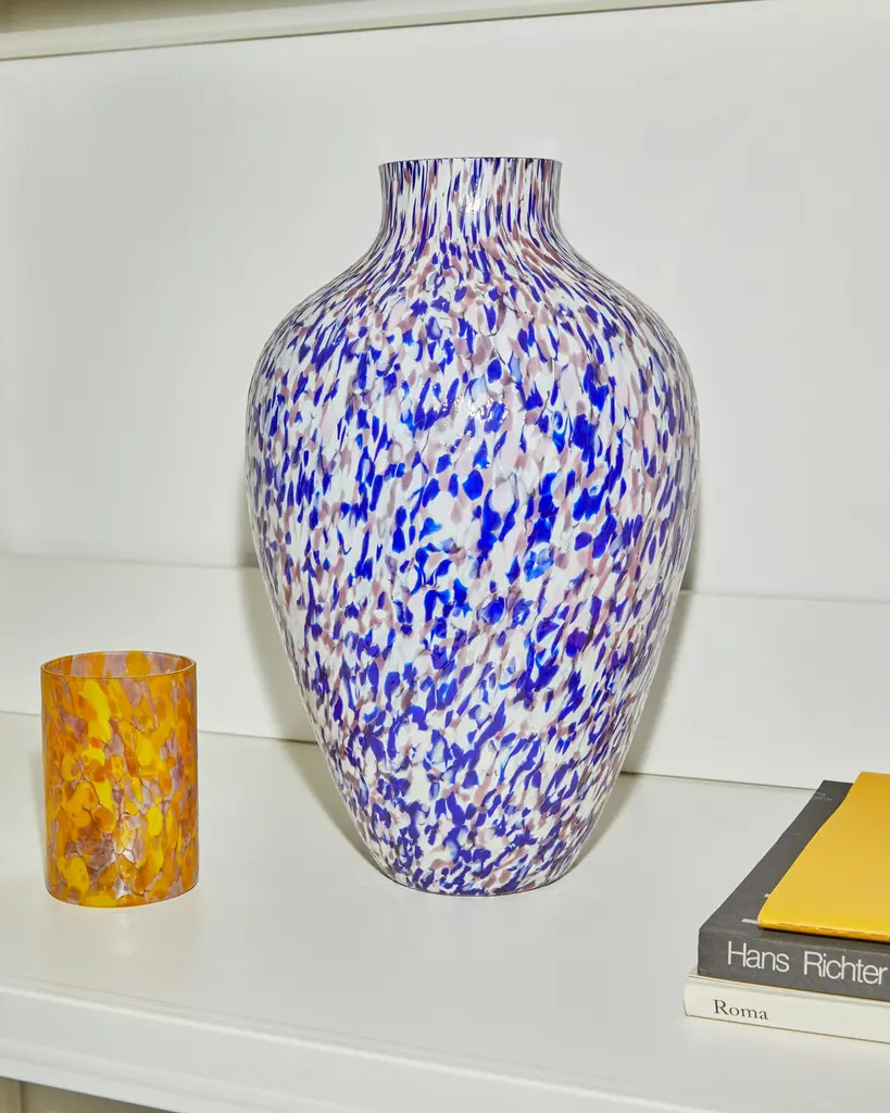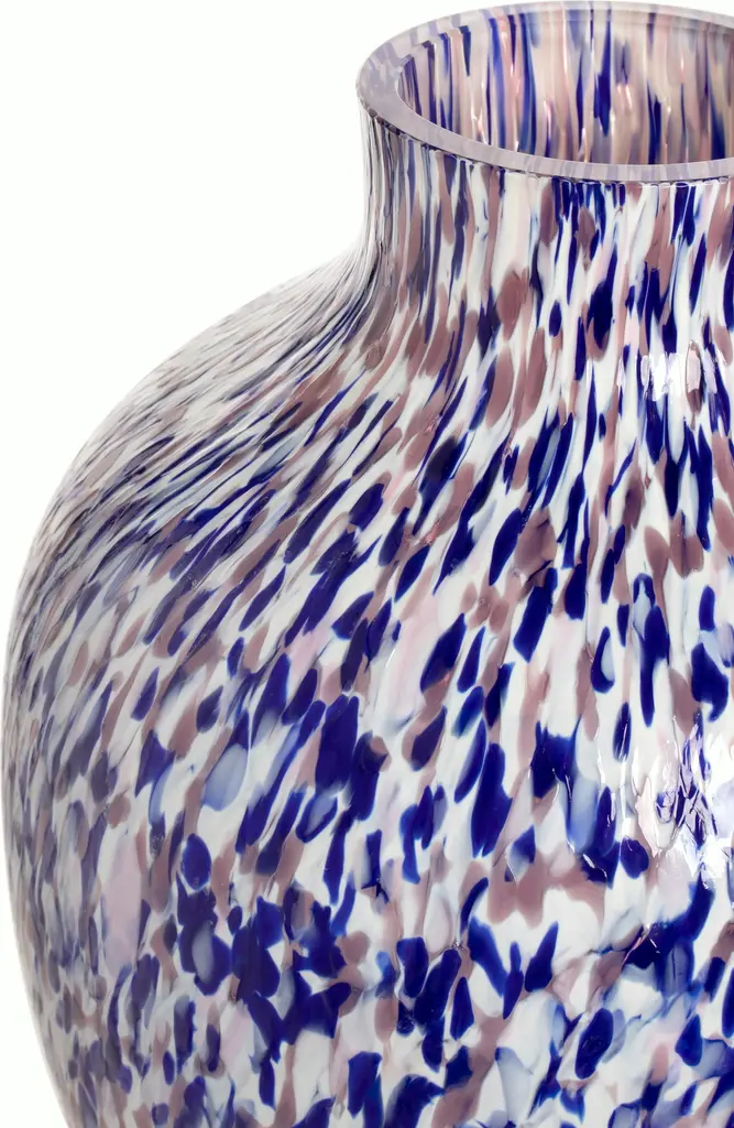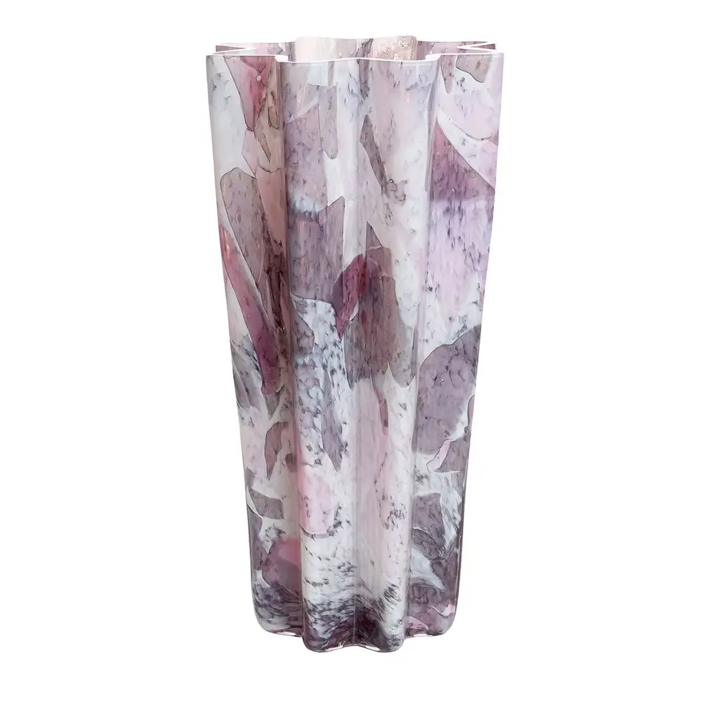 Tradition meets today in the Macchia Olla Tall Vase (2024) by Stories of Italy. Colorful pieces of mouth-blown Murano glass are meticulously fused with a vitreous opaque white to create modern, one-of-a-kind vessels that preserve the region's centuries-old glassmaking heritage. Macchia features a beautiful terrazzo-like pattern across its curved form for dramatic effect, whether filled with flowers or serving as an objet d'art. Made in Italy.