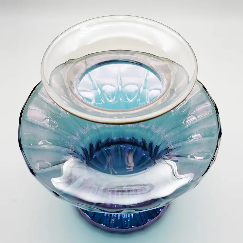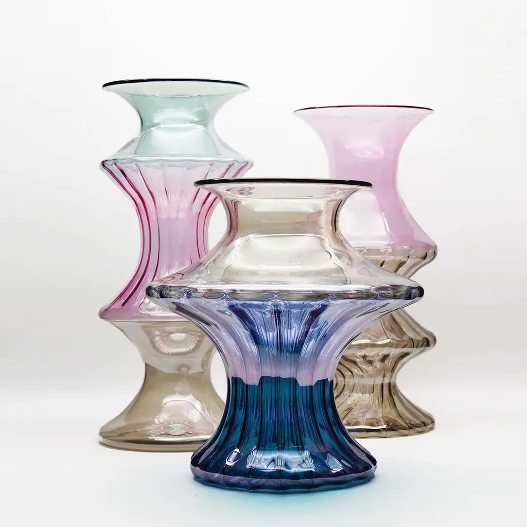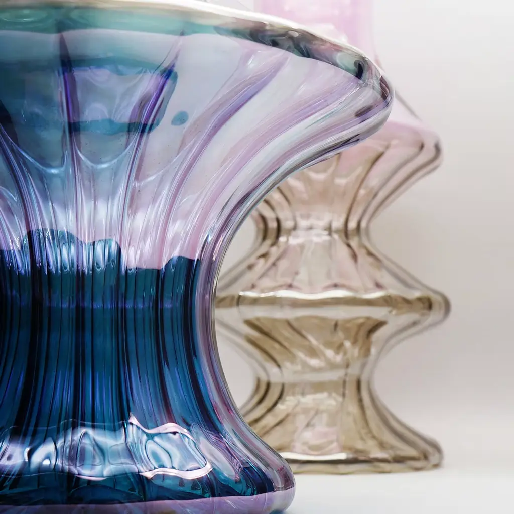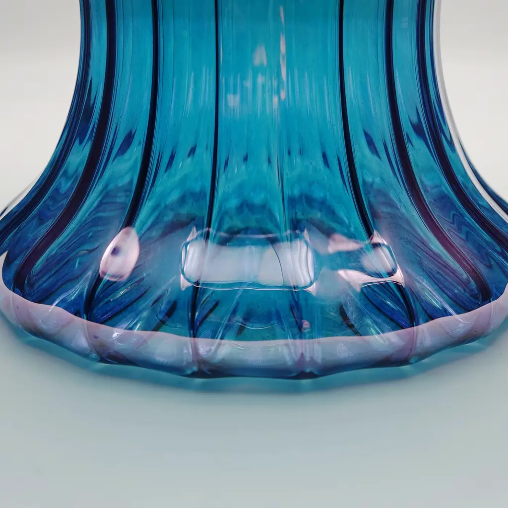 An authentic artwork of borosilicate glass mouth-blown by Venetian glassblowers, this vase reinterprets traditional vases with their characteristic flared shape. Colored in blue with the aid of a brush, it reveals its strong personality also thanks to concave lines tracing its profile. Any slight difference from the picture is to be expected and cherished as proof of its artisan quality.