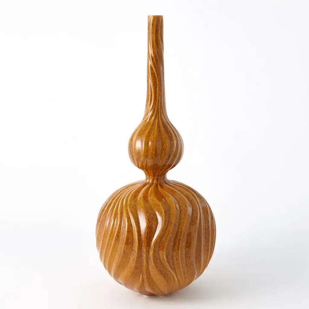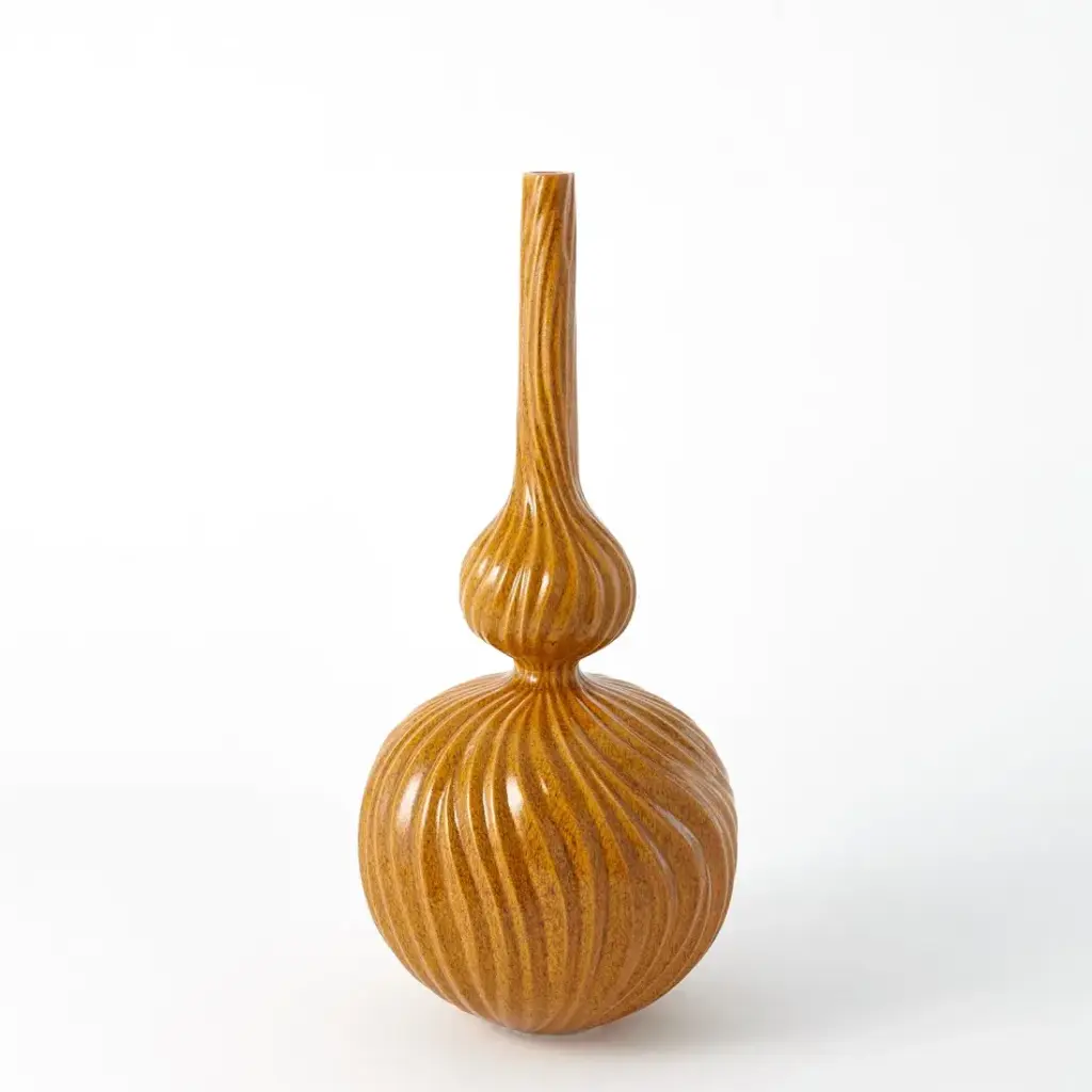 Swirled ridges give texture to this solid colored ceramic piece. Our mandarin Magura Vase is a textural wonder that will add to the visual interest of any room. From a fashion forward perspective, Global Views offers accessories, furniture, statement lighting, and an assortment of rugs and mirrors to add beauty and joy to your home.