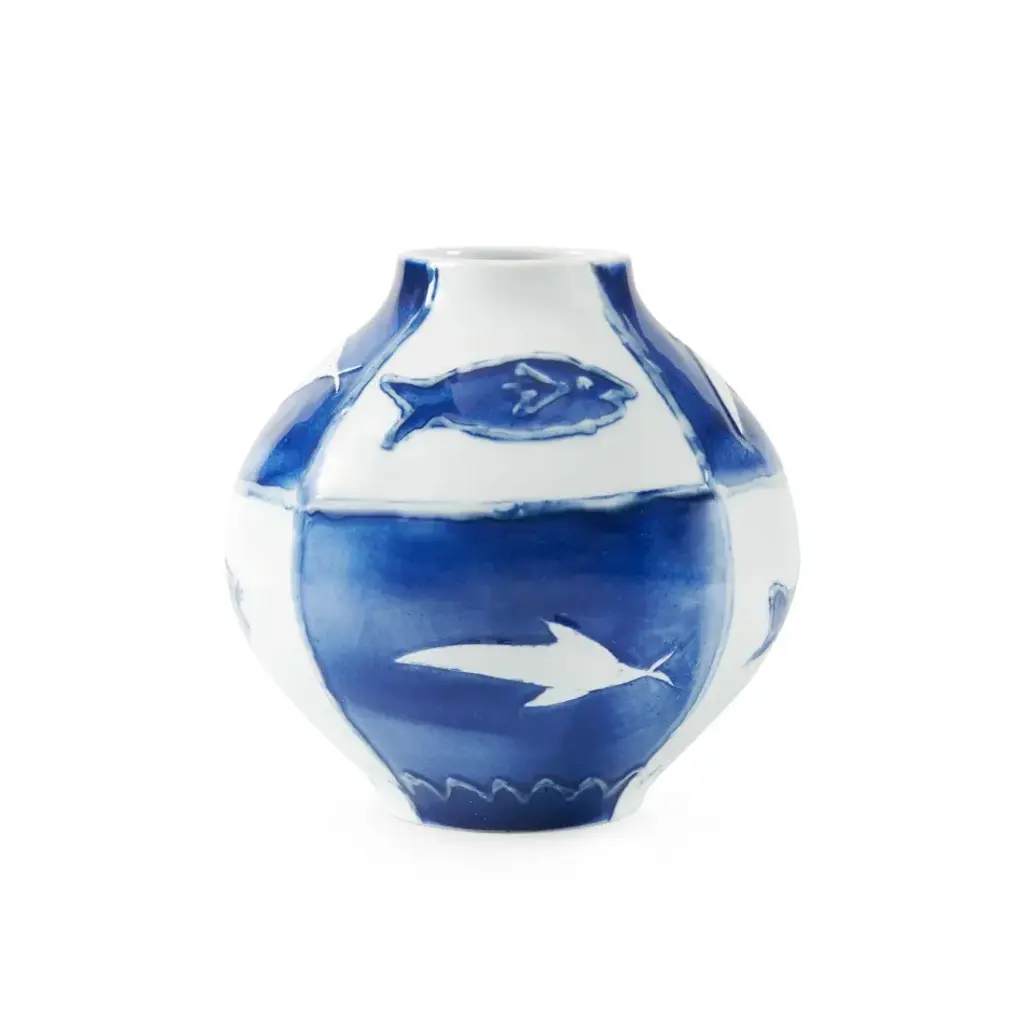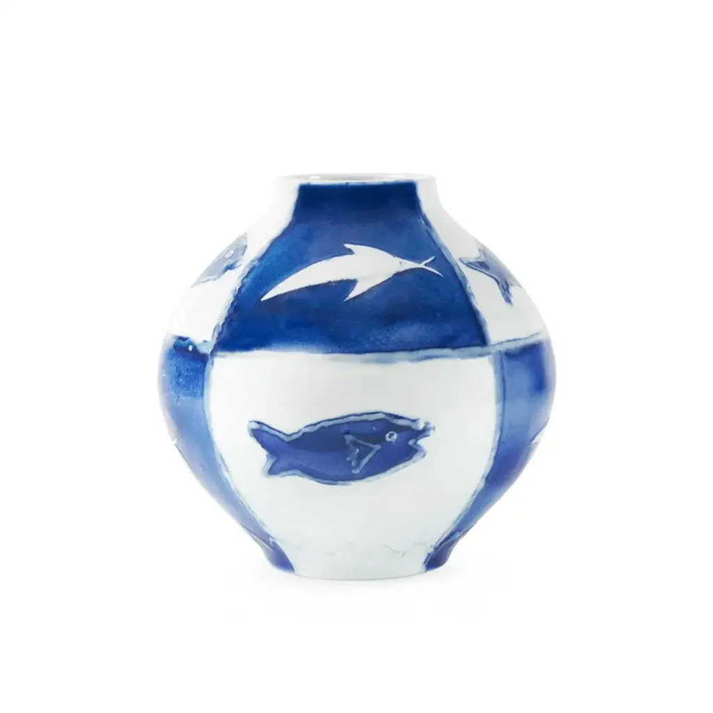 Nautical charm meets handmade whimsy in our Malaga Vase, a bright piece fit for coastal holiday homes, beachy cottages, or rooms that embrace a seaside theme. Crafted from beautiful porcelain with a shiny glazed finish, the Malaga puts a modern spin on the traditional blue and white colors of classic Chinaware. Our potters have hand-painted a vibrant grid and joyful depictions of underwater life in a relaxed, expressionist style, giving the vase plenty of unique personality. Fill it with fresh blooms or style it solo—it makes for a lovely display either way.