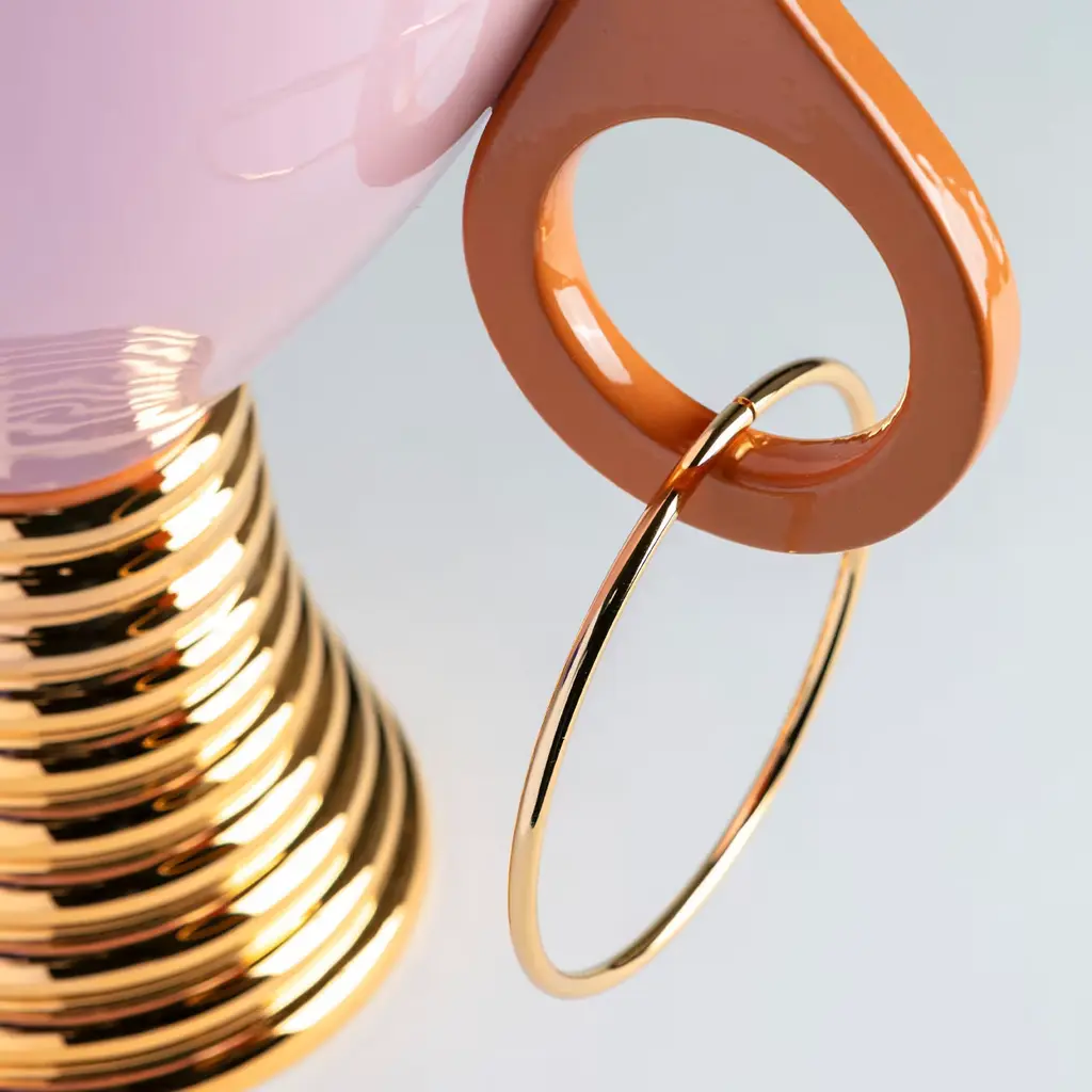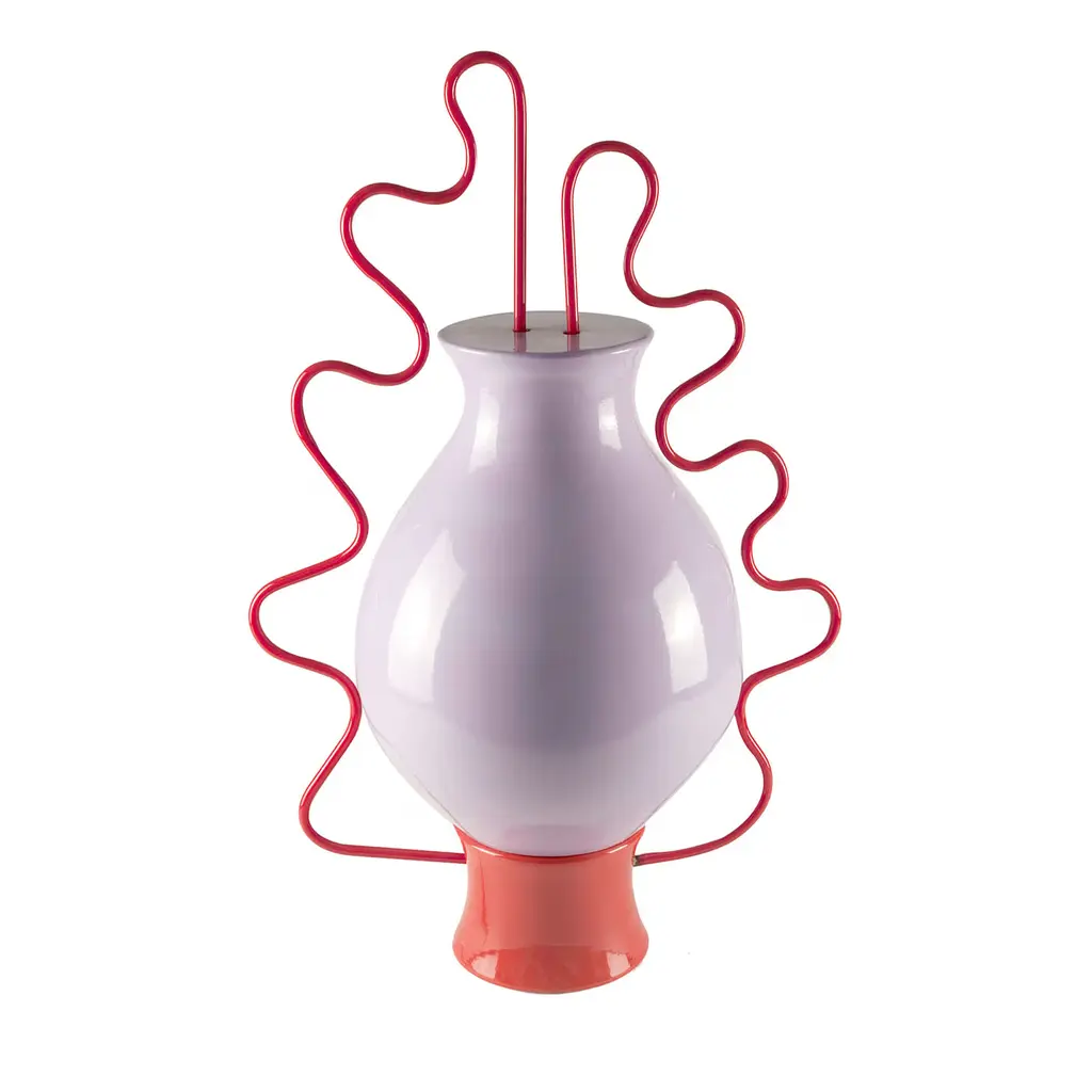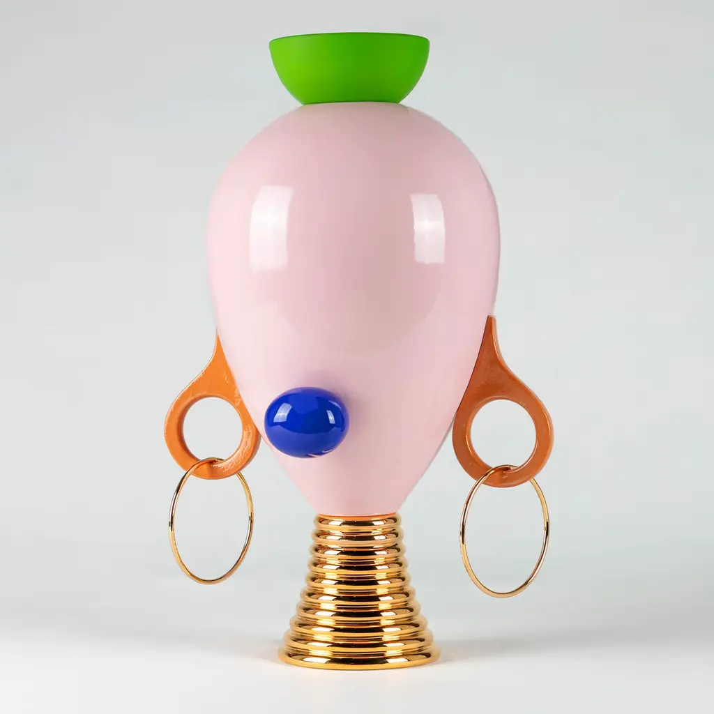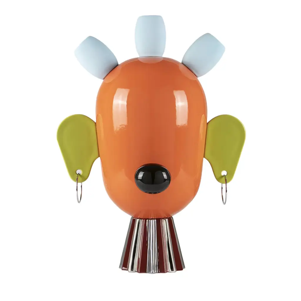 Inspired by the singular and striking aesthetic of tribal cultures, this magnificent vase depicts the archetypal figure of a mother, rendered in a superlative combination of bold tones and unconventional geometric lines. Handcrafted of ceramic and painted by hand, it is enhanced with glossy and matte finishes, chromed details, and a pair of shiny metal earrings.