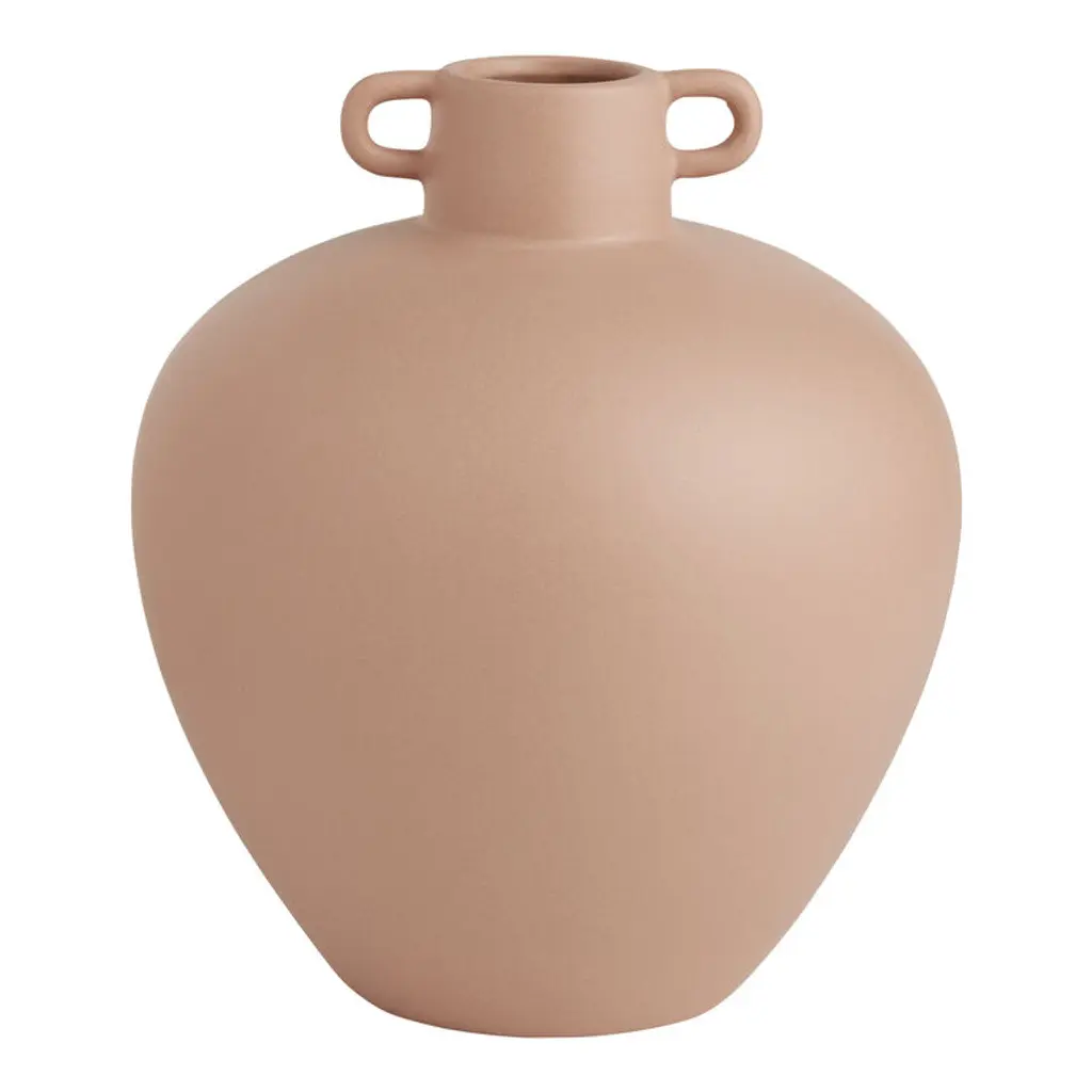 Refresh your decor with the curvy lines and warm, reddish-taupe hue of our Marcy vase, handcrafted of ceramic with a smooth satin finish. Topped with a narrow neck accented with little loop handles, this jug-shaped beauty brings easy elegance to any floral arrangement.