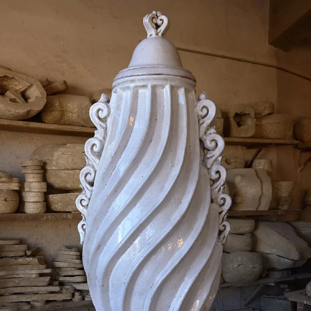 This tall, exquisite vase of iconic character will be a sublime accent piece for an outdoor garden. Handcrafted of ceramic according to traditional techniques, its elongated silhouette is topped with a precious lid and decorated with a spiral-like textured motif. A timeless addition to classic and modern decors, it is named after the Italian word for "storm surge".