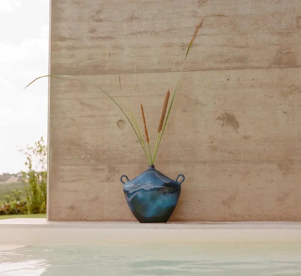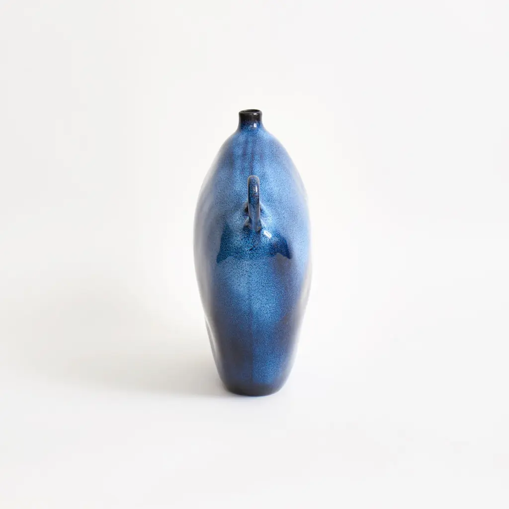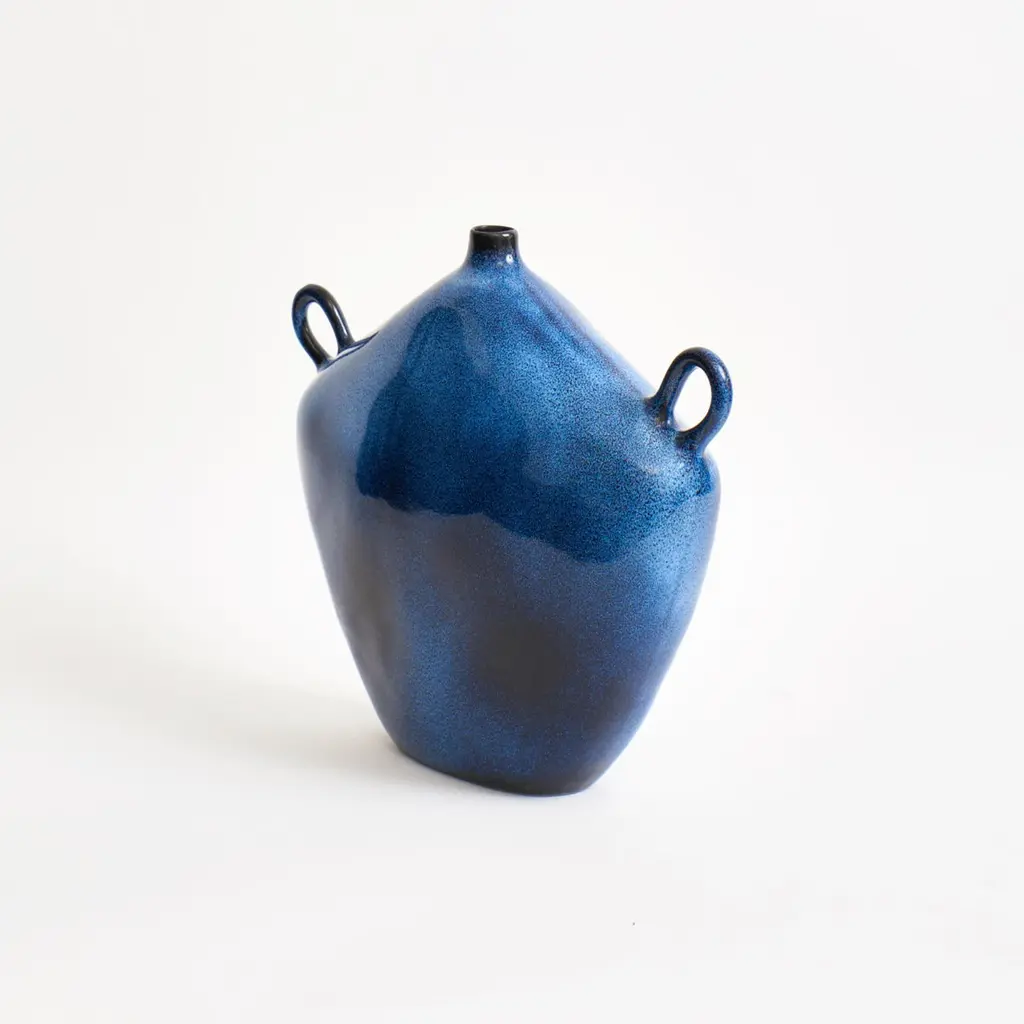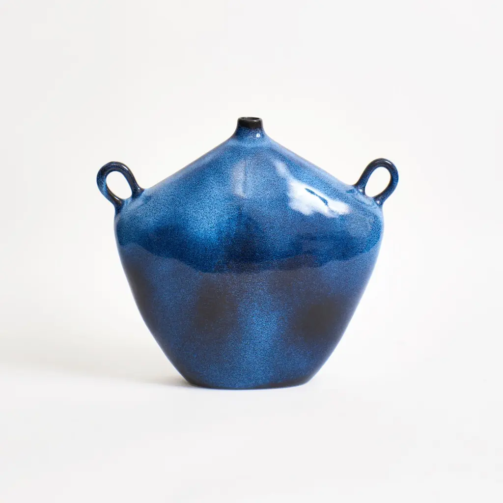 Maria Vessel in Midnight BlueDesigned by Project 213A in 2020Handmade StonewareThis vase is inspired by the Greco-Roman period, having a timeless appearance and finished with a contemporary textured shiny glaze. Each piece develops its own distinctive character with shades of black as it goes through the firing process. No two pieces will look alike. The handmade process gives it a subtle and intimate uneven touch. Hallmarked with a discreet P 213A embossed logo.colour : Shiny BlueHeight : 31,5 cmWidth : 34,5 cmDepth : 12 cmVolume : ca 4,8 LWaterproofThis is a fragile object - Do not lift or hold by the decorative handlesDeliveryWe provide complimentary free delivery for customers of the European Union on orders over 150EUR. For those purchasing outside of Europe shipping fees will be added at checkout.ReturnsYou have 14 days from receiving your order to arrange your return (see our return policy).