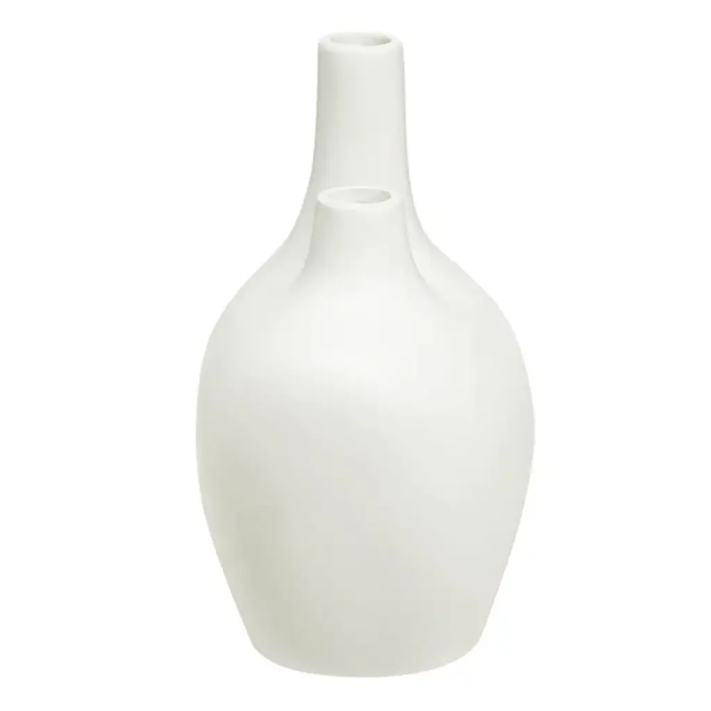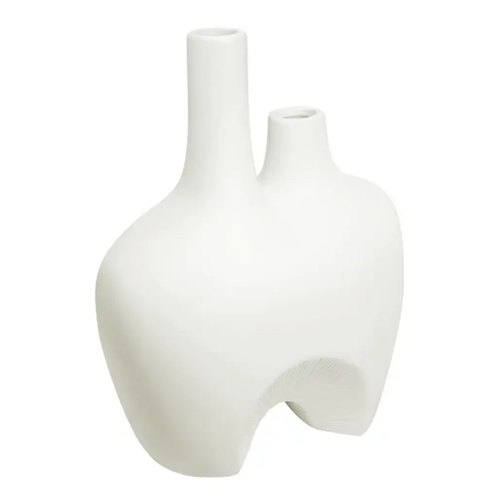 The Mariner Vase from Renwil shows off an eloquent, playful reimagining of the modern vase form. A curving ceramic construction with a textured inner base, it curves out and up to two necks of different heights, adding artistry and contrast to its surroundings; its non-watertight form means that it stands on its own as an abstract sculptural piece. The ceramic vase gets a modern makeover in this design. Eye-catching when simply set on a mantle or table alone, this piece never fails to make an impression. Well suited for the creative contemporary home, this vase can be paired with other vases of different structures or other decor elements in the home.