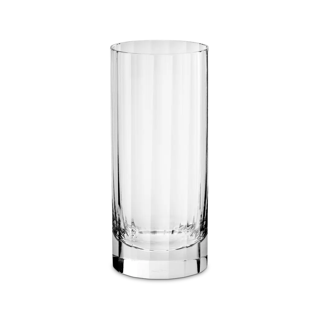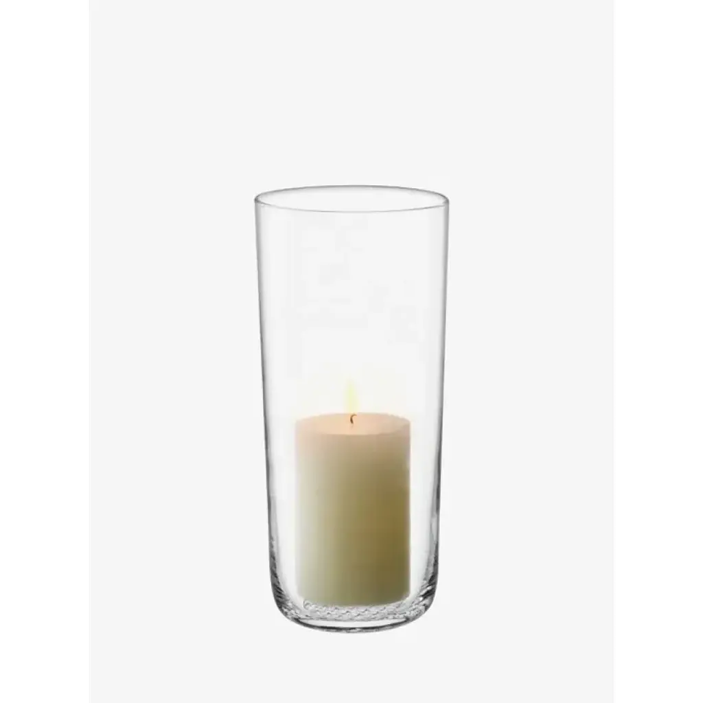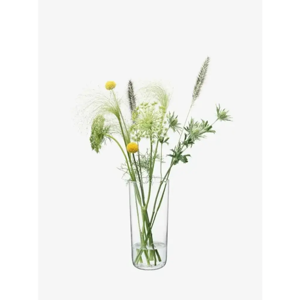 A clear mouth-blown glass vase with a textured base, inspired by the woven baskets taken to flower markets. The versatile tall tapered shape may be used for various cut flowers and foliage.