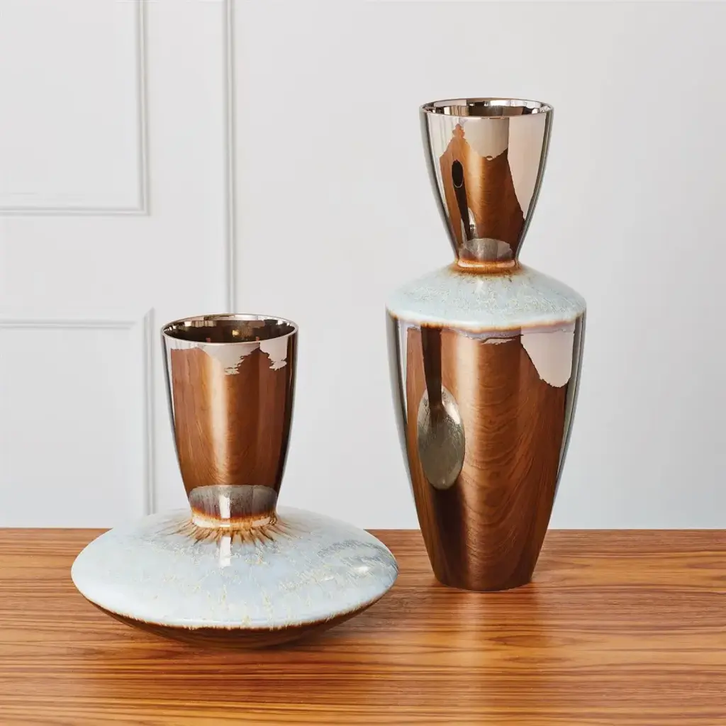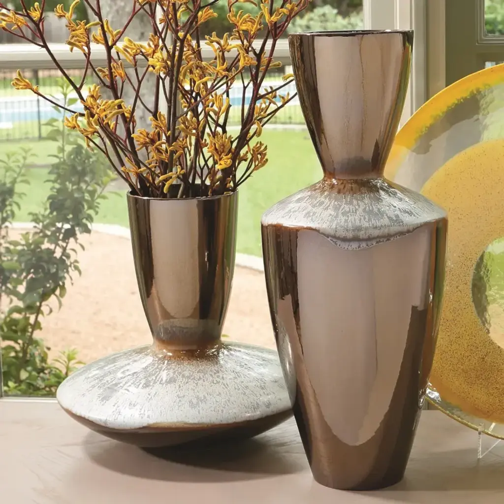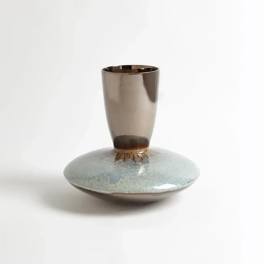A bold bronze glaze sparkles on Marta's Vase. The tall double conical shaped vase brings high shine luxe to your space. A soft blue reactive glaze accent at the base of the neck contrasts with the warm glow of the bronze. From a fashion forward perspective, Global Views offers accessories, furniture, statement lighting, and an assortment of rugs and mirrors to add beauty and joy to your home.