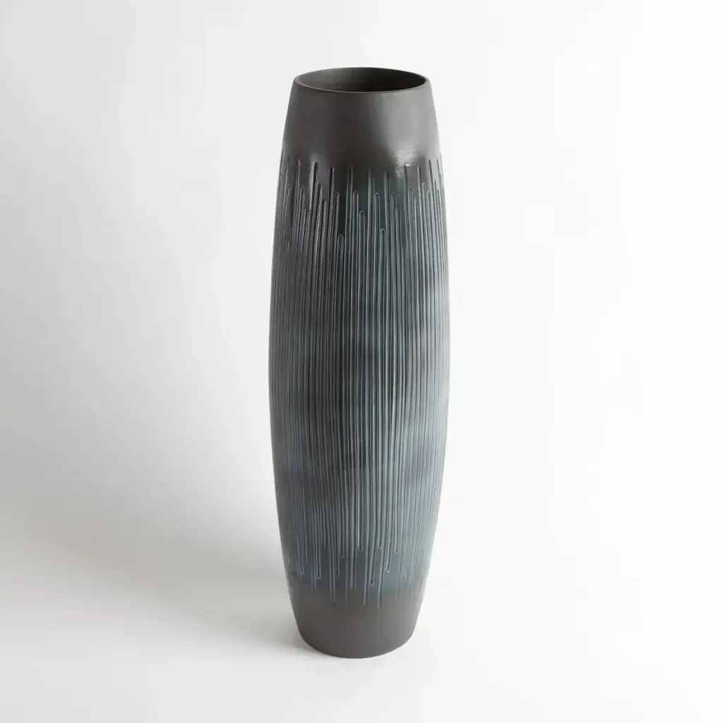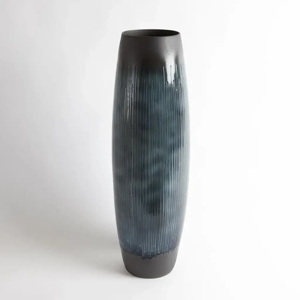 Ink blue reactive glaze over ribbed texture and black porcelain create an almost denim wrap effect on these vases. From a fashion forward perspective, Global Views offers accessories, furniture, statement lighting, and an assortment of rugs and mirrors to add beauty and joy to your home.