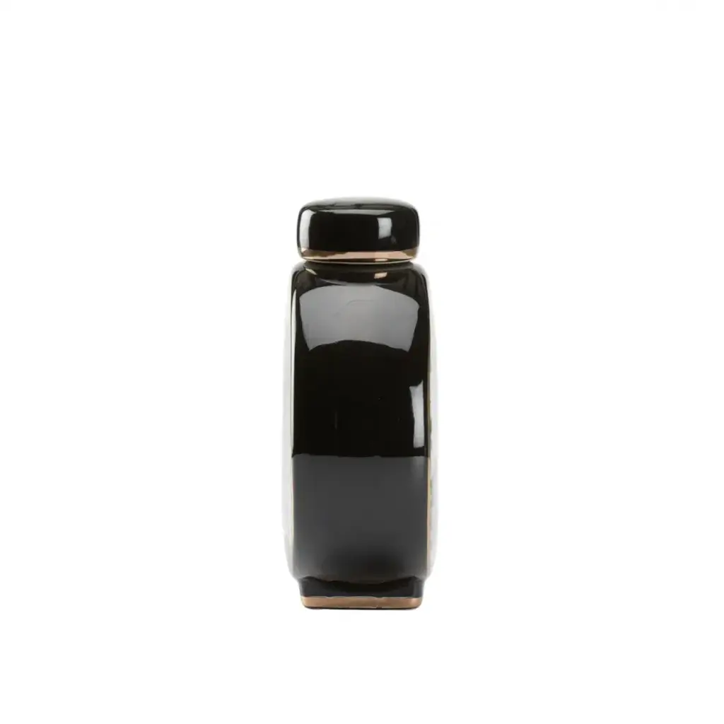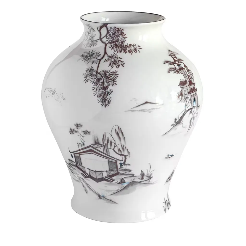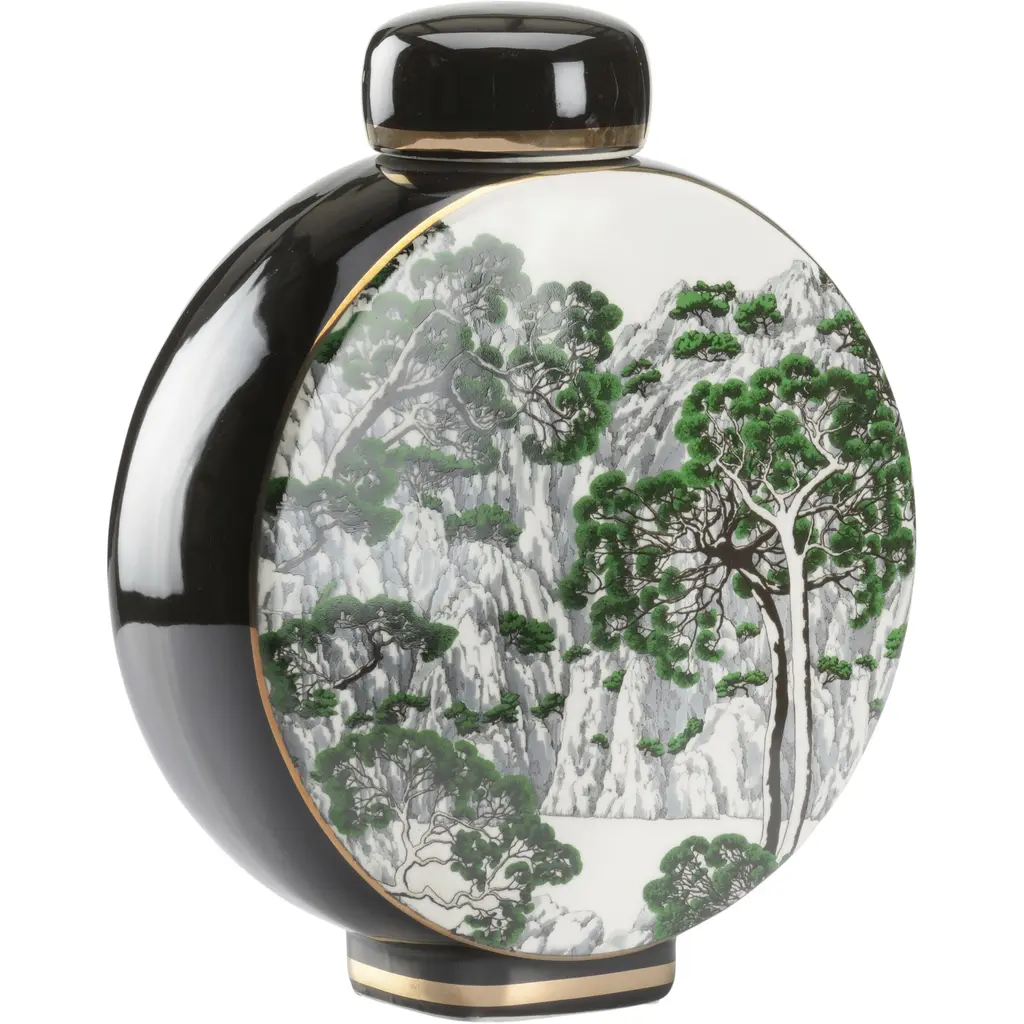 Perfect for tabletops and book shelves in any home, matsu vase brings a chinoiserie style to your decor. Featuring an exquisite green and white landscape motif decal, this decorative vase is made of ceramic with a removable lid.