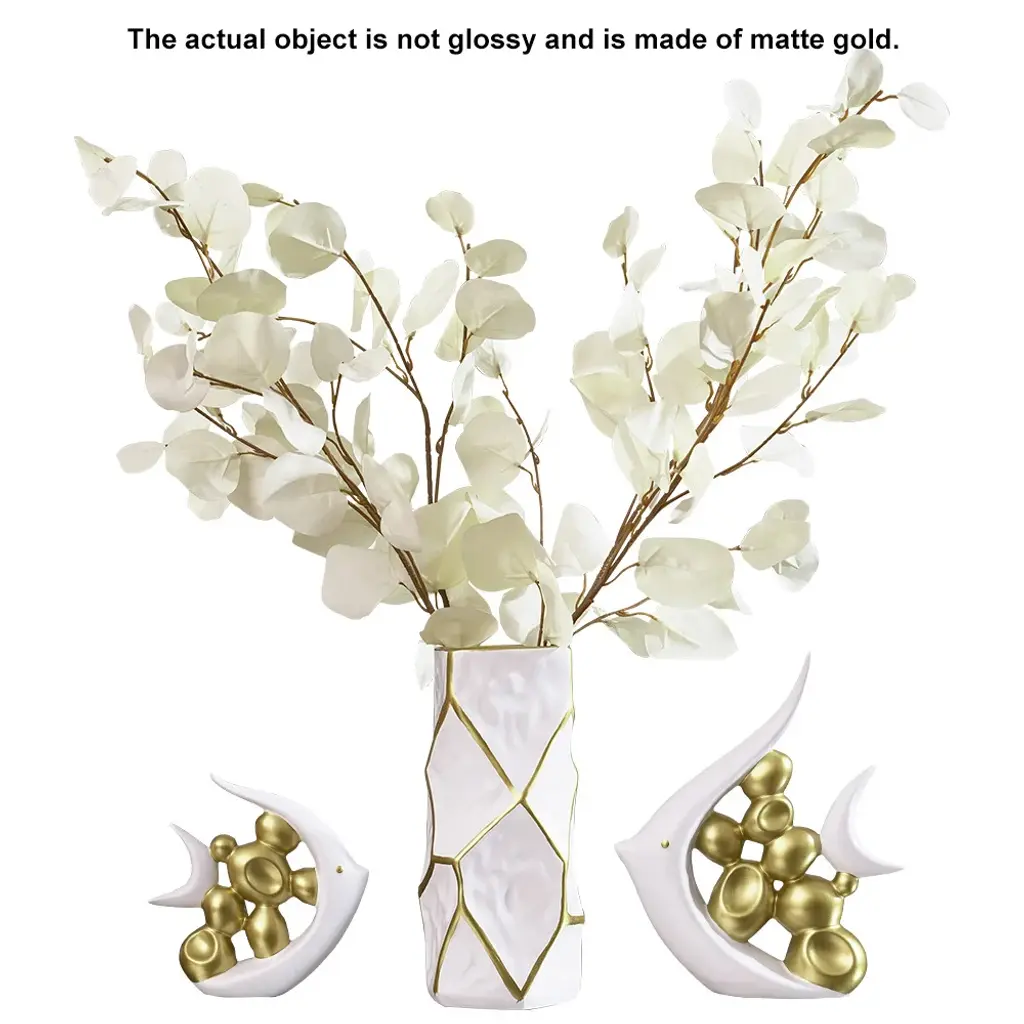 Matte Gold Pair Of Fish Resin Ornaments White Artificial Plant Arrangement In Gold Vase