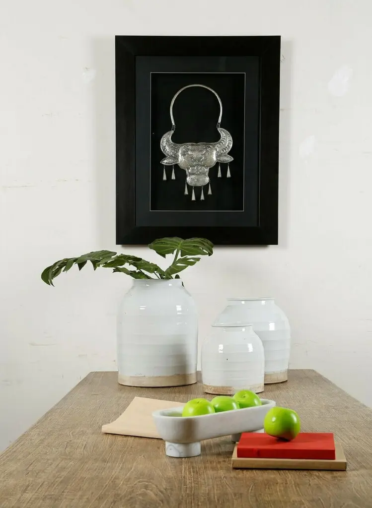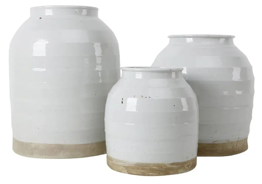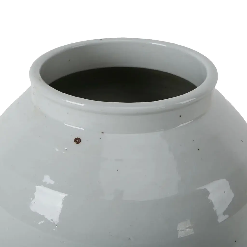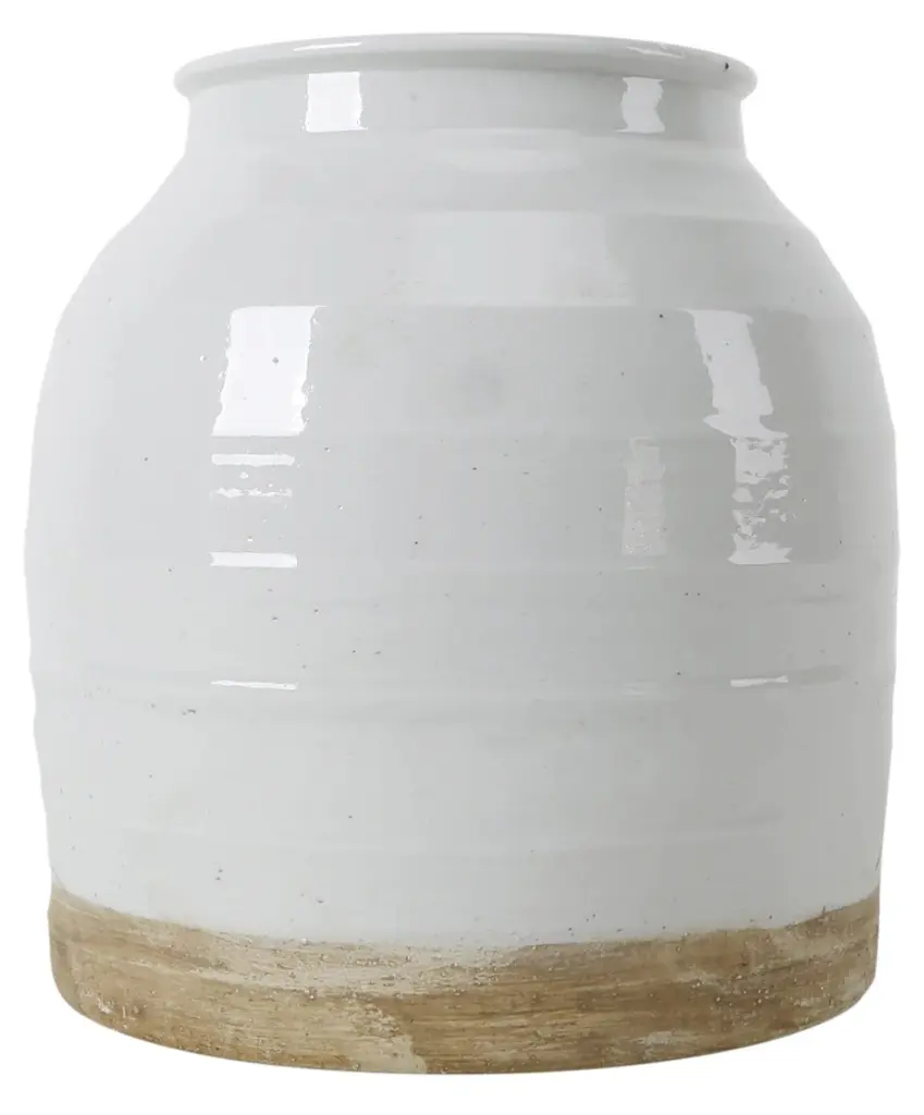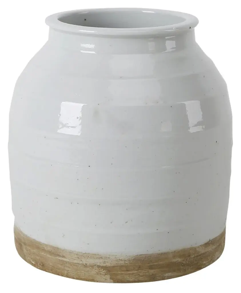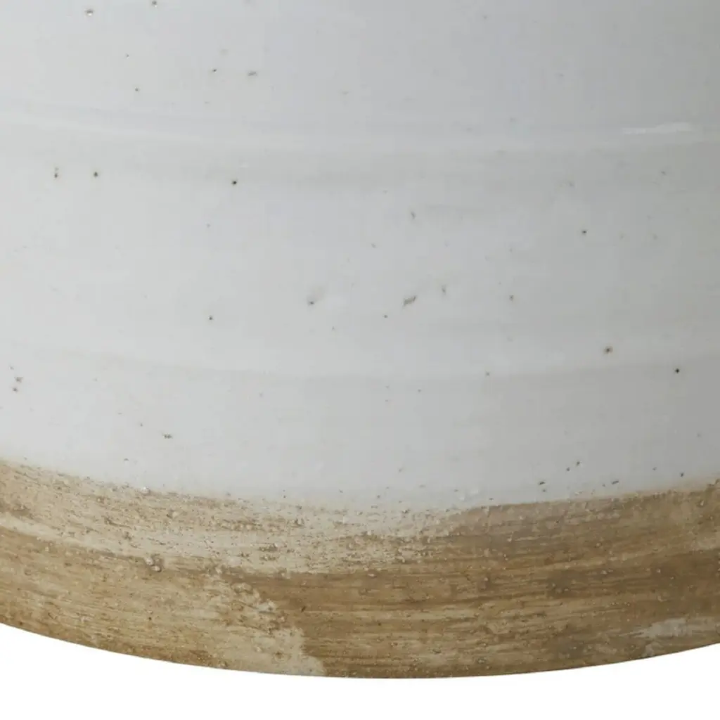 The contrast of the off-white glaze and the bare clay ceramic at the bottom adds to the allure of this handcrafted jar. Because of their artisanal nature, no two are exactly alike.