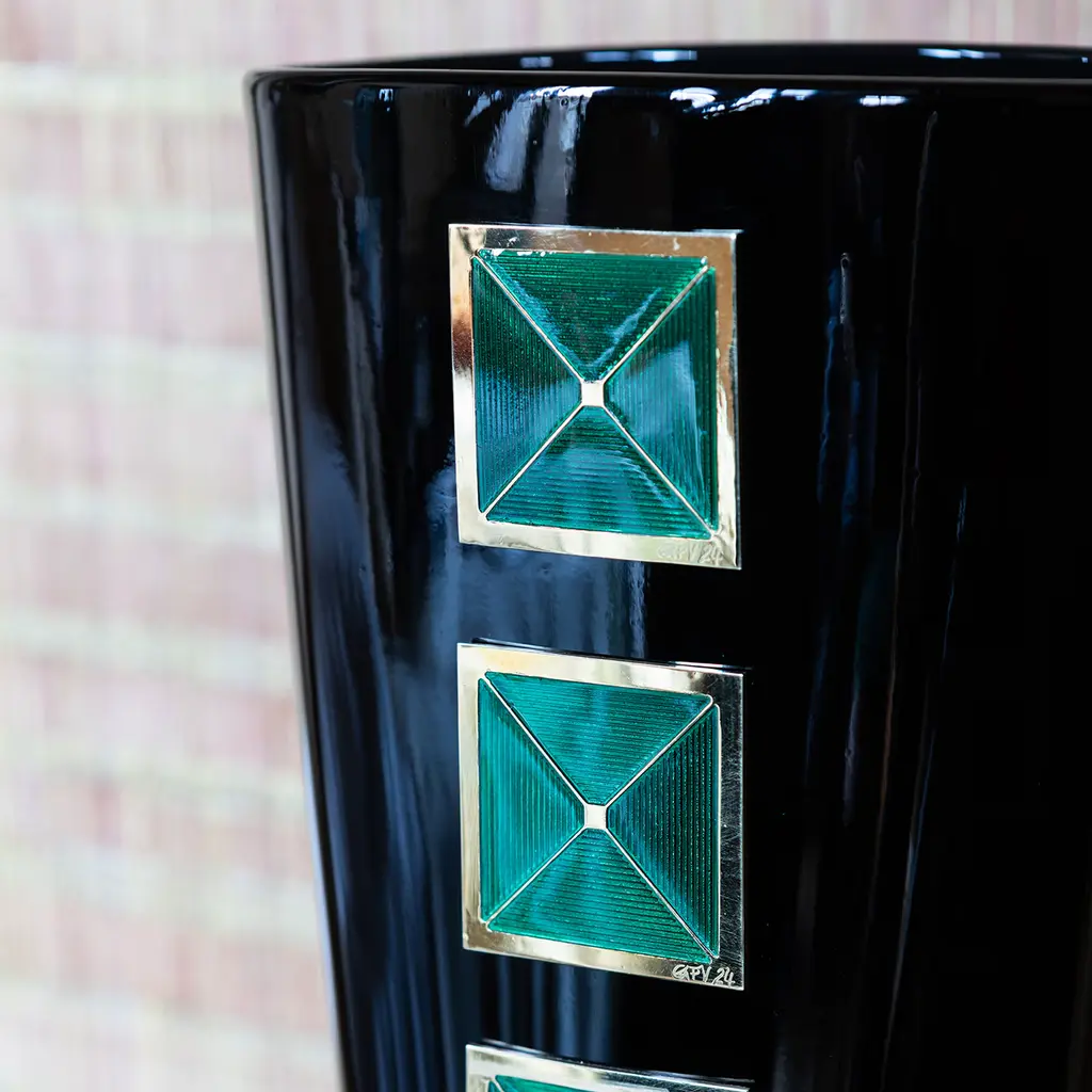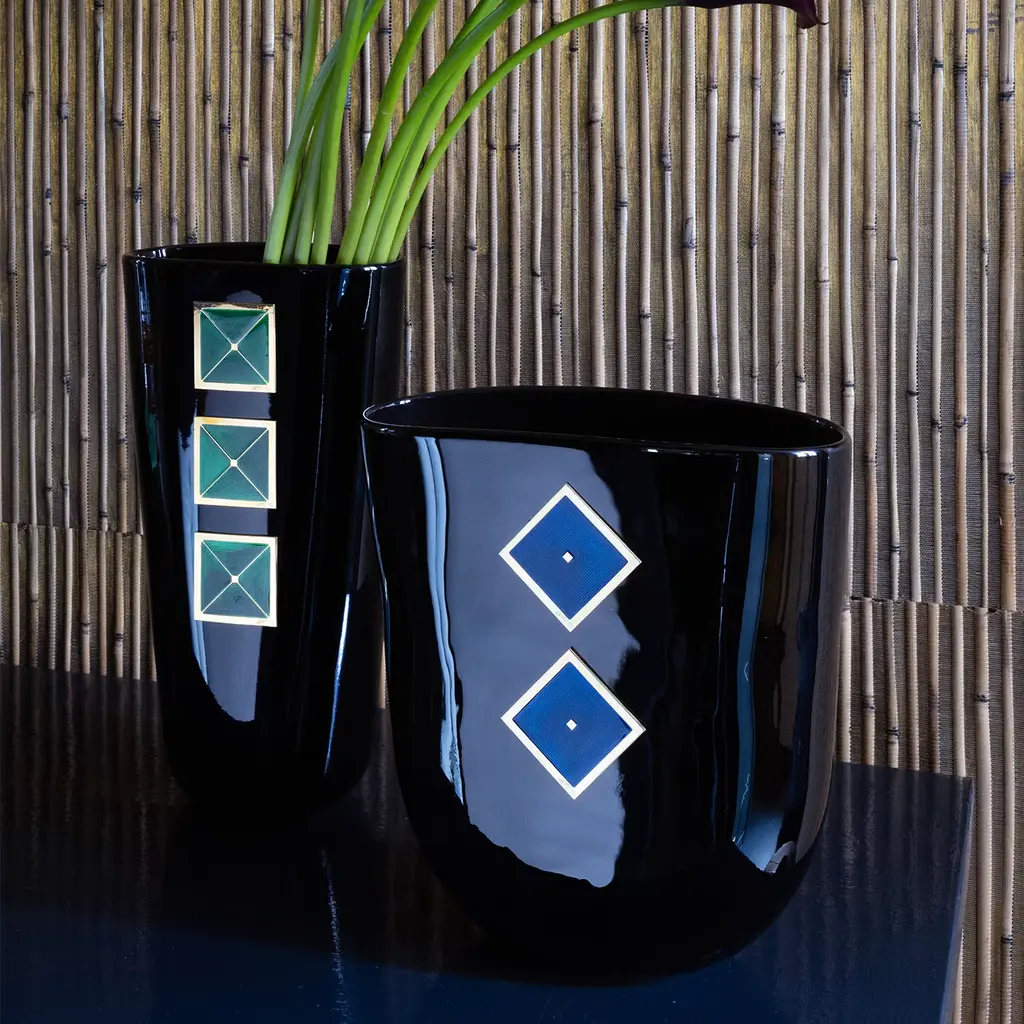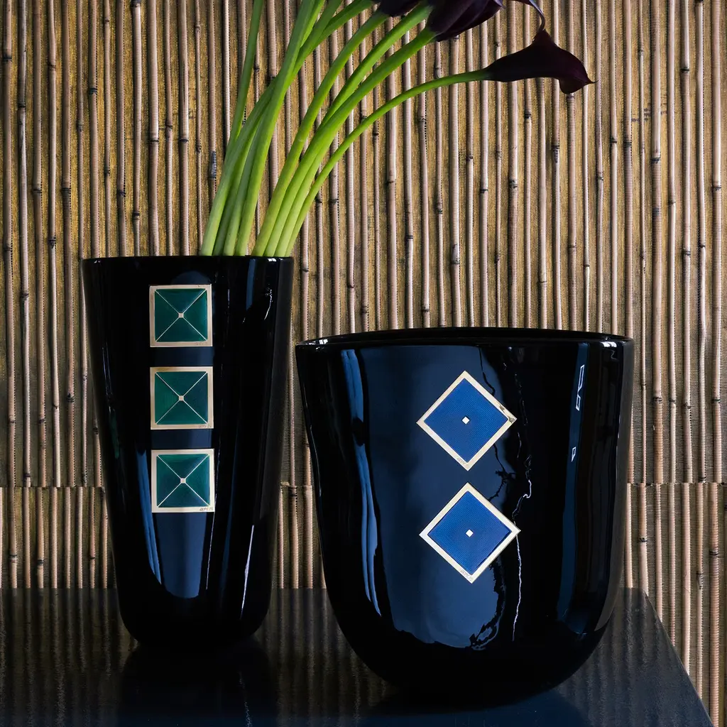 The Maxi Cloisonné Vase is a striking piece that effortlessly combines contemporary design with timeless elegance. Crafted in a historic Murano furnace, this vase features a stunning interplay of deep black blown glass and monochromatic cloisonné enamel, showcasing an extraordinary luster. Its design alludes to Art Deco influences while echoing the bold aesthetics of the 1980s, bringing a touch of irony and sophistication to any space. Ideal for elevating home décor, it serves as both a functional piece and an artistic statement, making it a perfect addition to diverse interior styles.