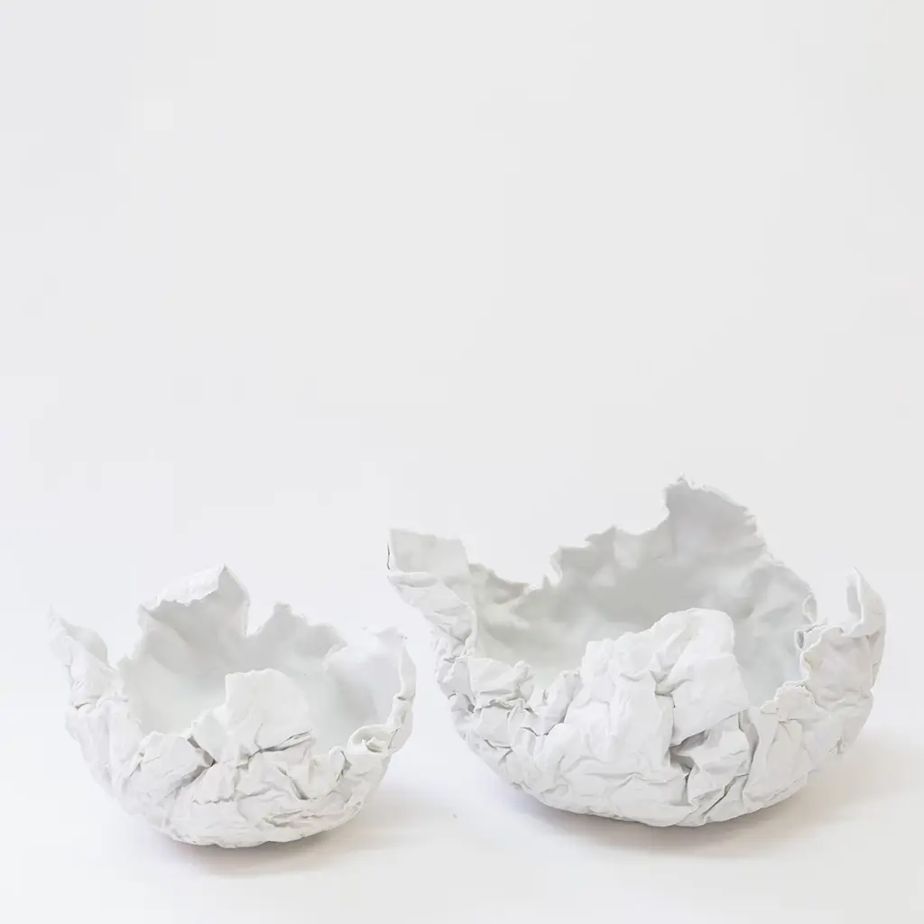 Fine paper-like vessel in sugary porcelain biscuit. The Come Carta series is characterized by an unglazed and sensual touch surface resembling a crumpled piece of paper. Which message was it carrying? Which story can still be written on it? A vessel that contains your emotions. The series comes in three different measures: 12 x h 10 cm, 20 x h 15 cm, 27 x h 20 cm approx. Each piece is unique, and due to handcrafting, slight changes may occur.