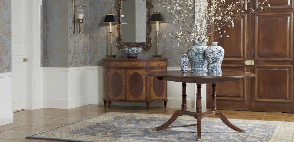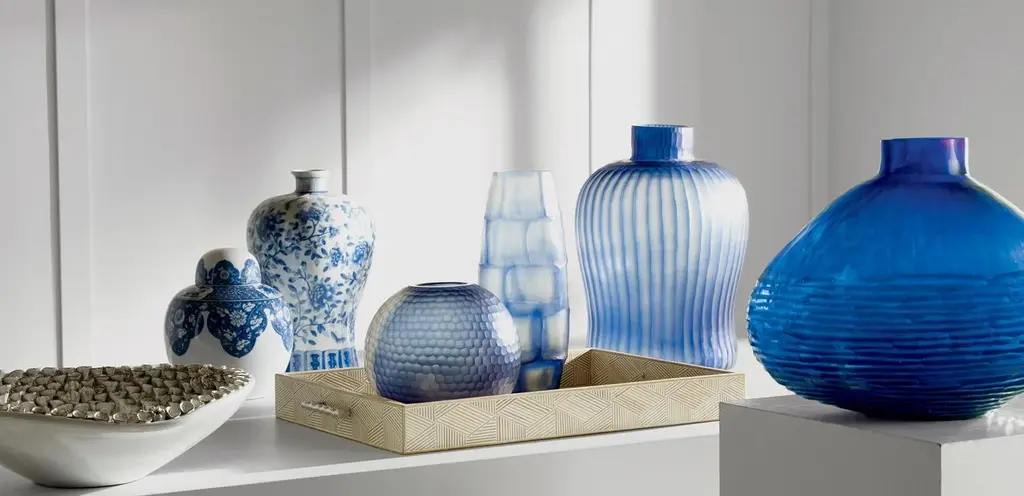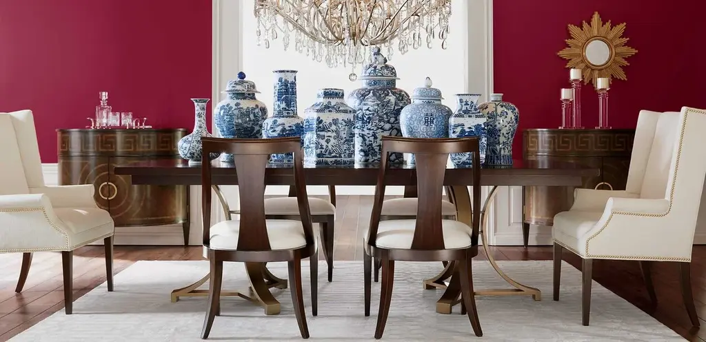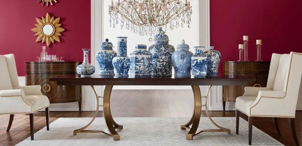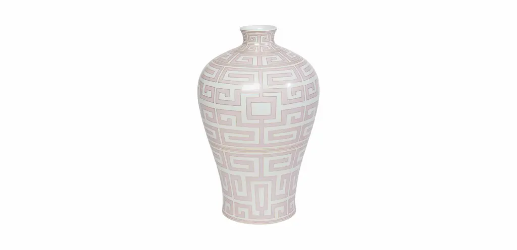 Classic export ware gets a stylish update when hand-painted botanical scenes are joined with abstract and Greek key patterns. The bulging curves together with the small scale neck make for an interesting silhouette, and while it is not meant for holding water, the design is a perfect accent on its own within an estate or country inspired space.