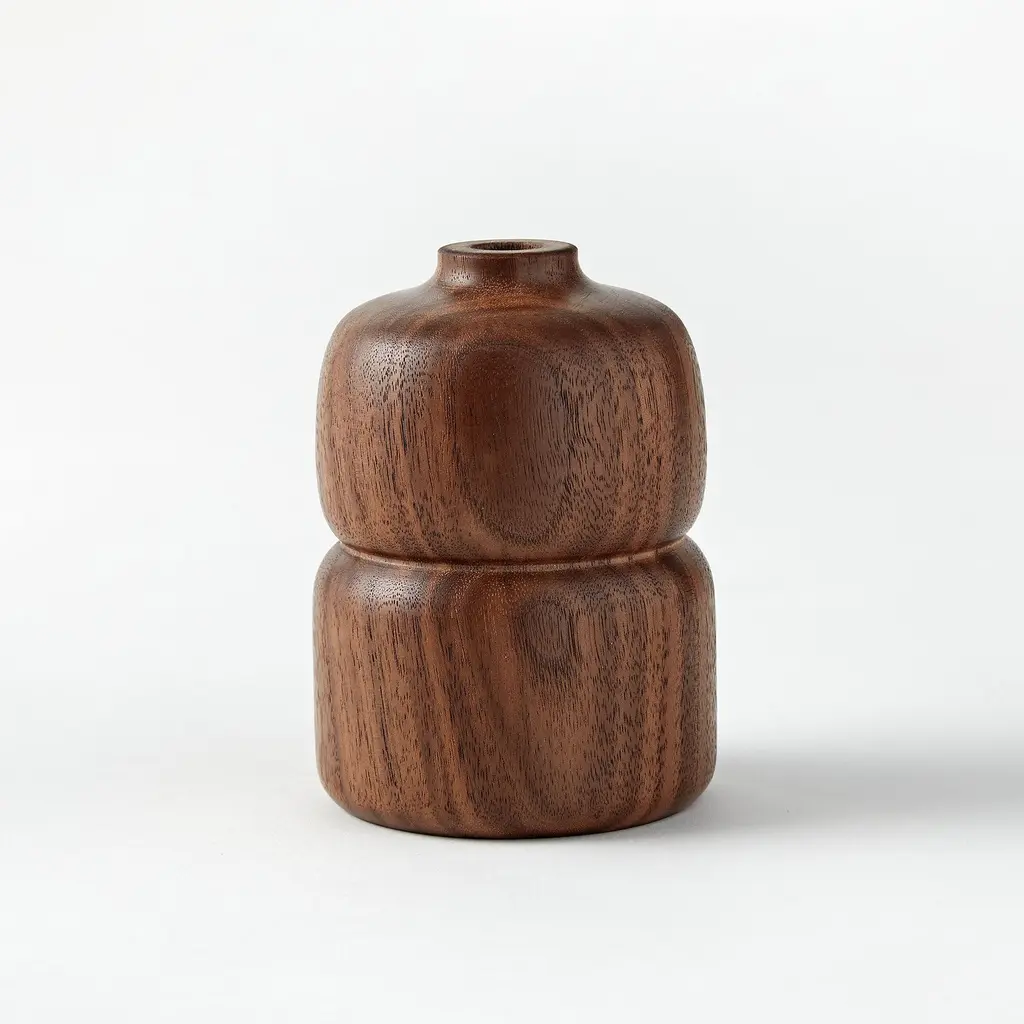 Its modern shape highlights the wood grains. Includes a glass vial for fresh flowers. Designed and hand finished in Oakland, CA.