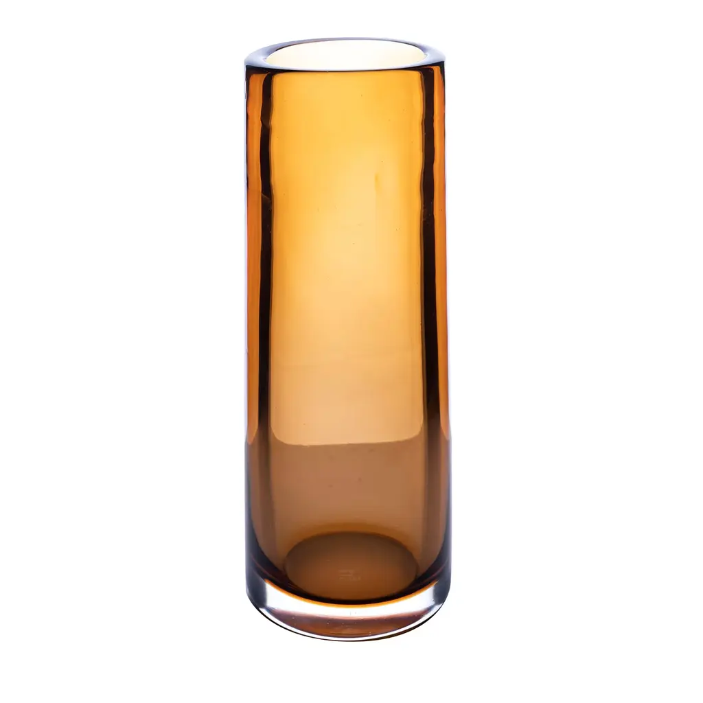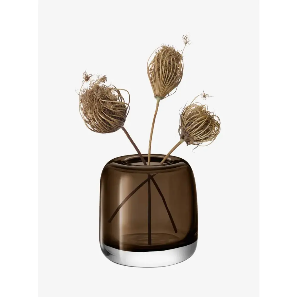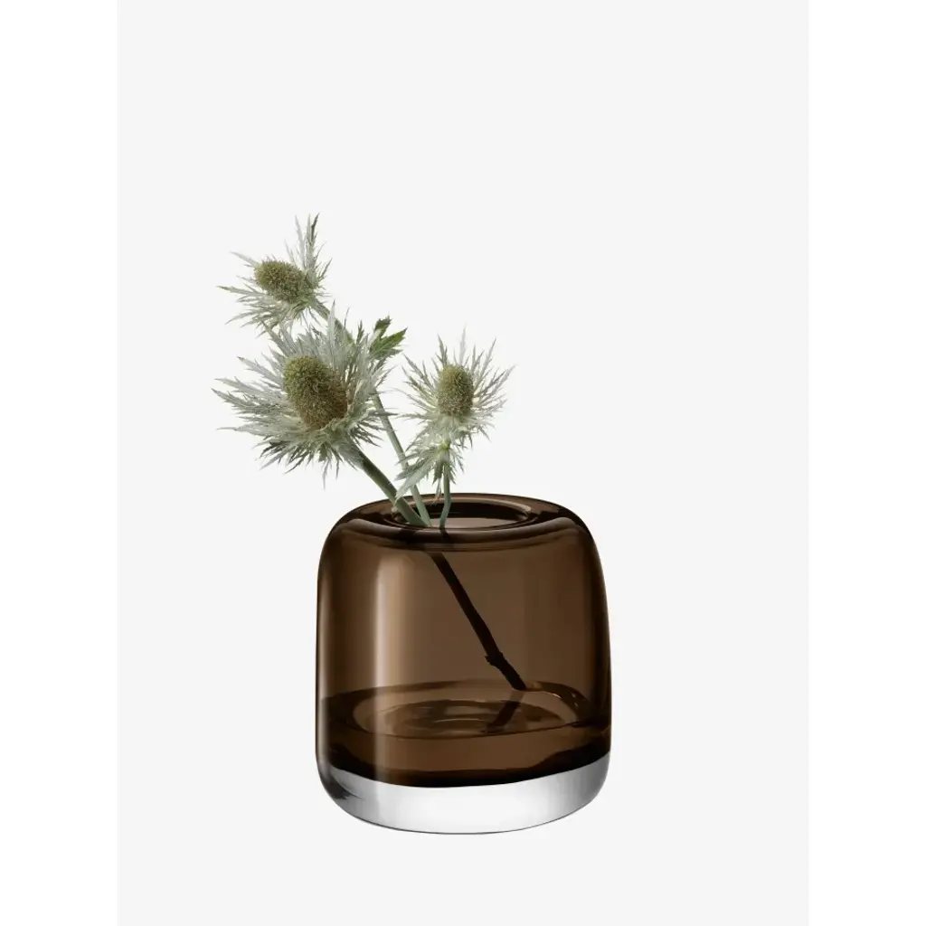 A low, heavy mouth-blown glass vase with soft cube shape.