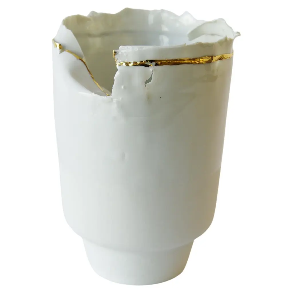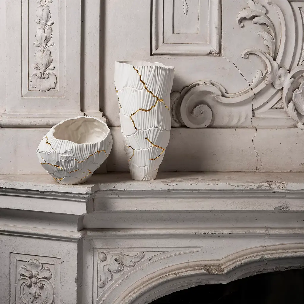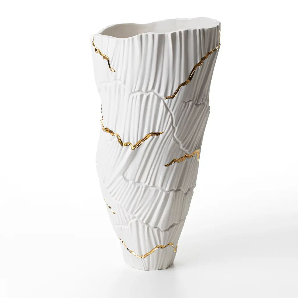 Meltemi is an elegant porcelain vase, part of the Anemos Collection. The soft curves of canals shaped by wind create a unique rhythm on the surface, interrupted by deep cracks, like a dry land that discloses a precious secret. The pure white of porcelain is emphasized by the alternation of lights and shadows, the signature style of FOS Ceramiche. Rocks dug by the weather and crossed by gold 23K craters, creating a sort of mineral kintsugi.