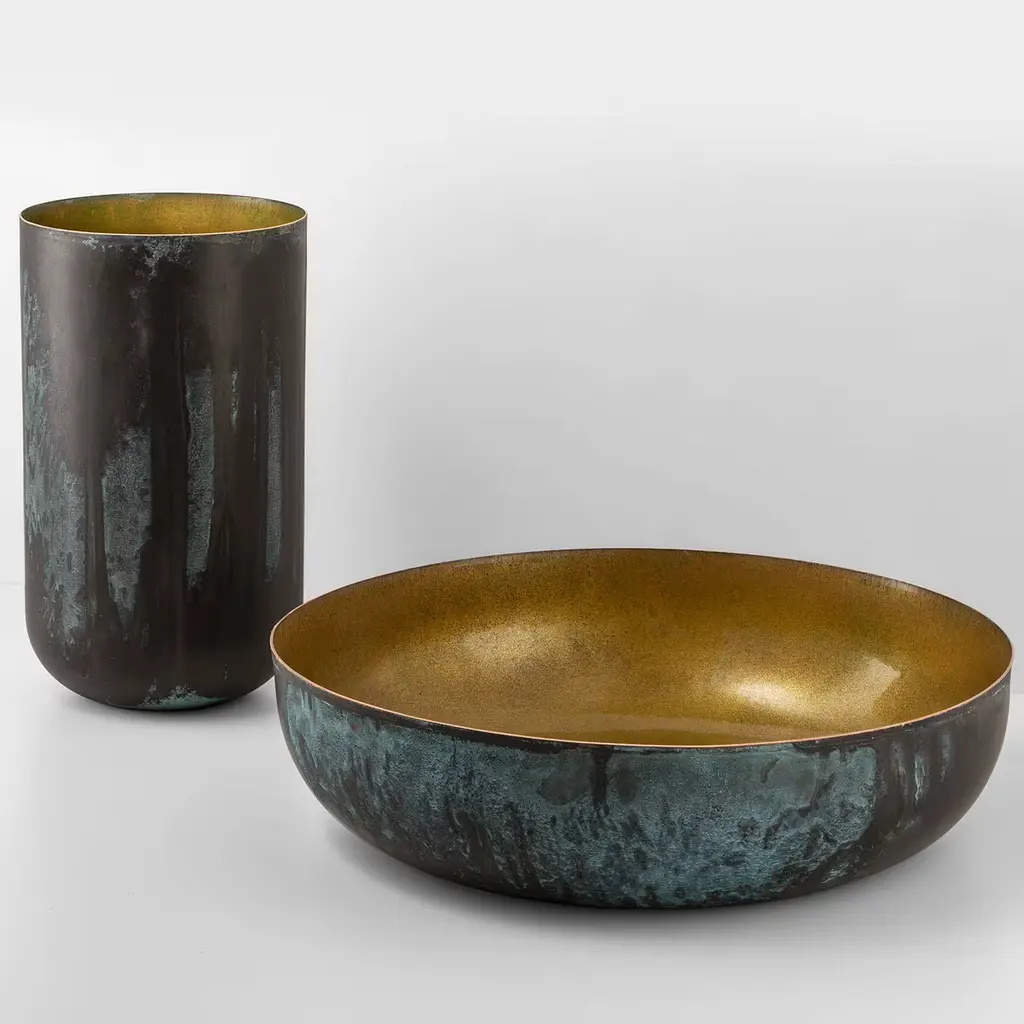 Collection of copper vases with enameled interior and burnished exterior. Unlike the Novae vases, the Mercurio vases are characterized by a rougher, more irregular appearance. Fire enameling on copper is a complex craft technique, dating back to the 1950s. Industrialized by only two companies in Italy, De Poli of Padua and Dal Campo of Milan, it was abandoned in the Seventies and is now being revived by Incalmi, which is rebuilding the tradition.