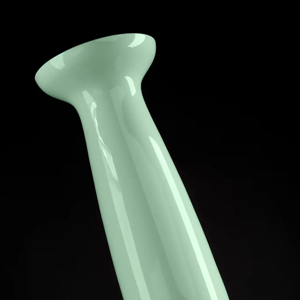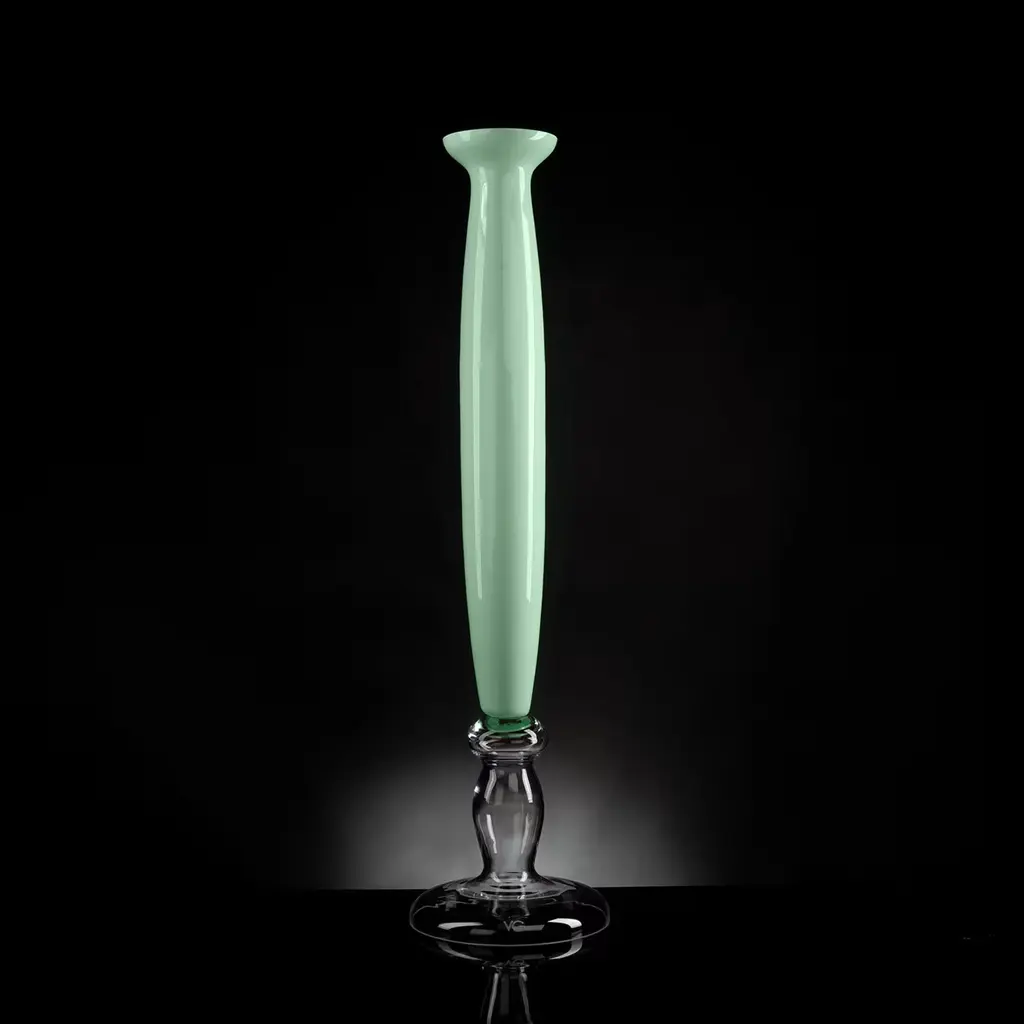 A striking piece of functional decor that combines traditional craftsmanship and modern flair, this vase will be a charming statement when showcased on an entryway, or living room corner. The piece flaunts a slender silhouette marked by a round clear base, and a thin and smooth body boasting a neo-mint hue.