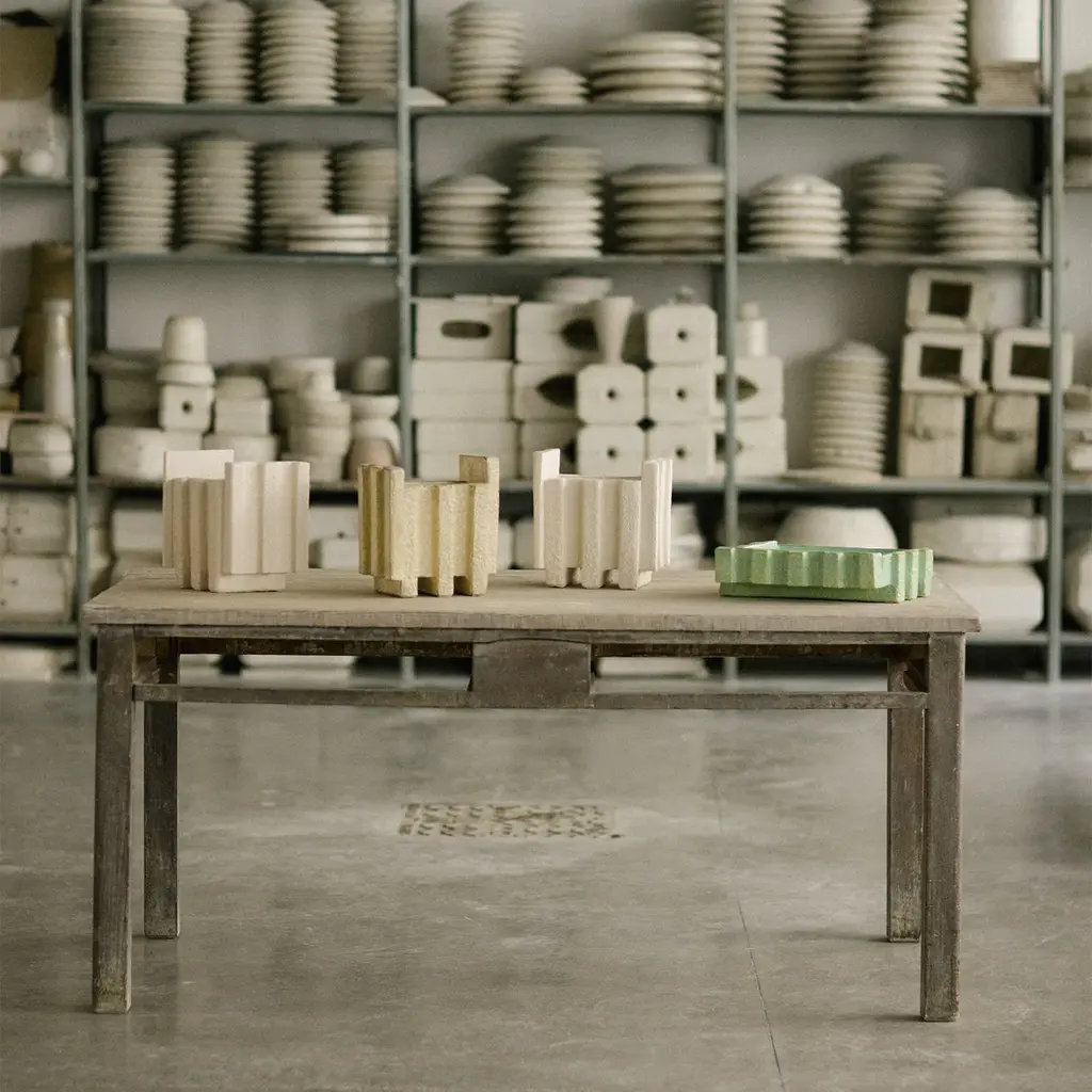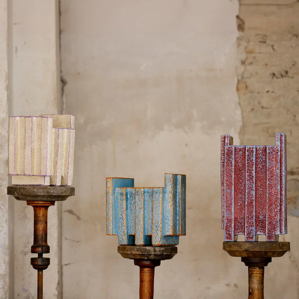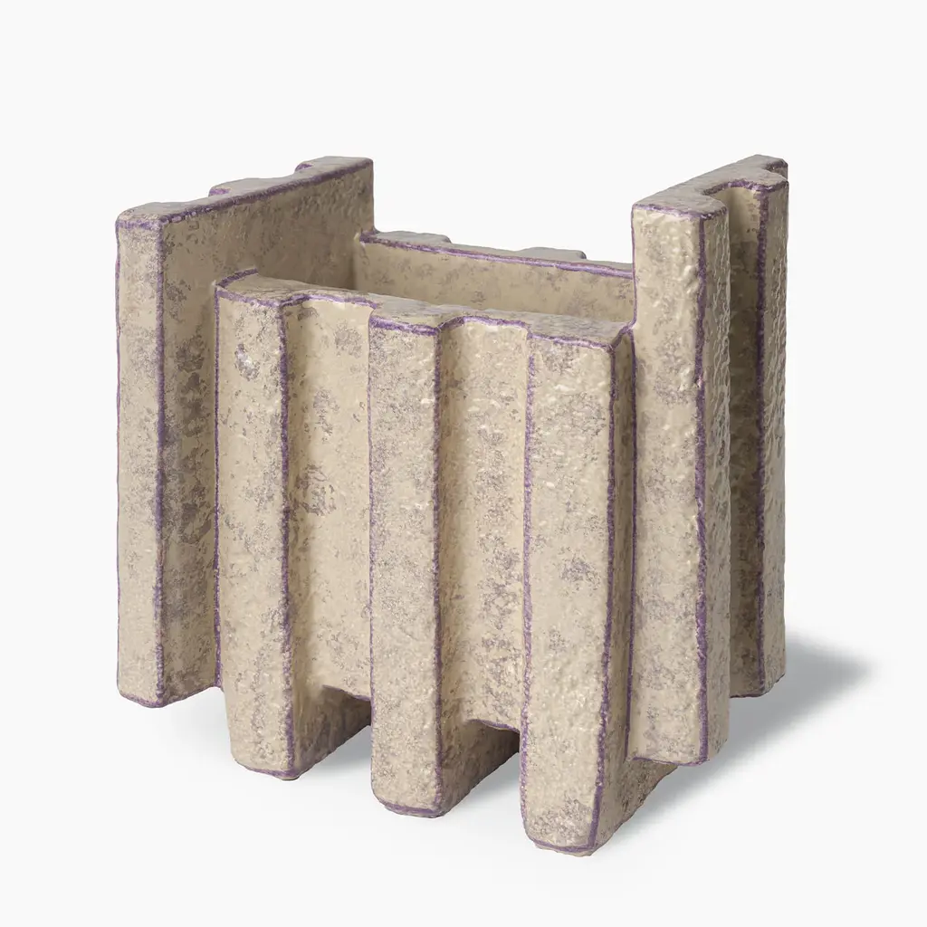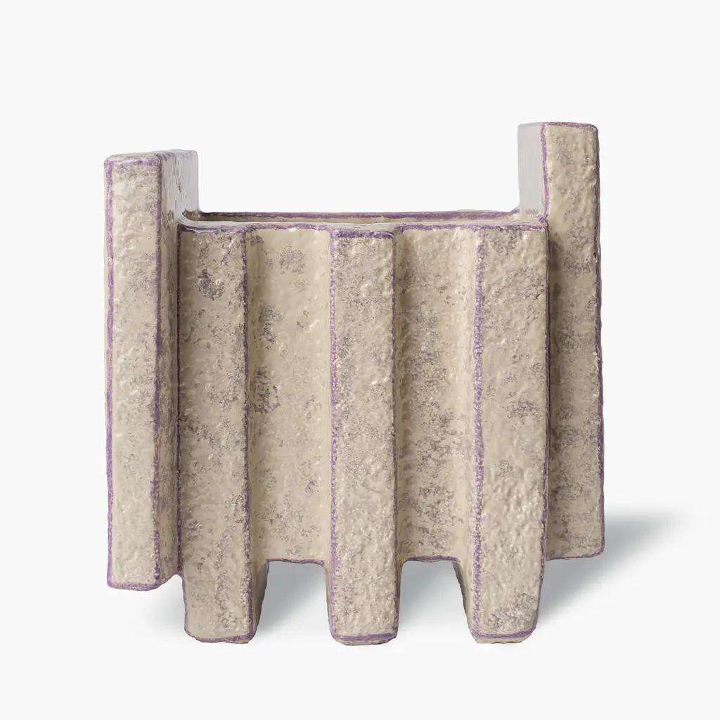 A harmonious chromatic interaction between cream beige and purple lends a subtle, glamorous appeal to this sculptural ceramic vase inspired by complex construction projects. Distinguishing traits are its crenelated sides, which, together with the extensive and deliberate uneven texture, further reinforce its architectural inspiration. An authentic objet d'art, each piece boasts unrepeatable details.