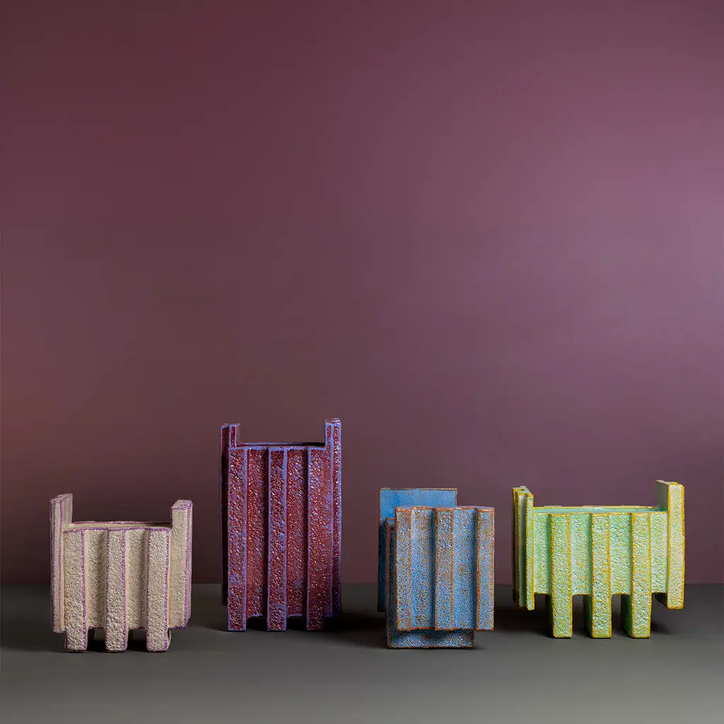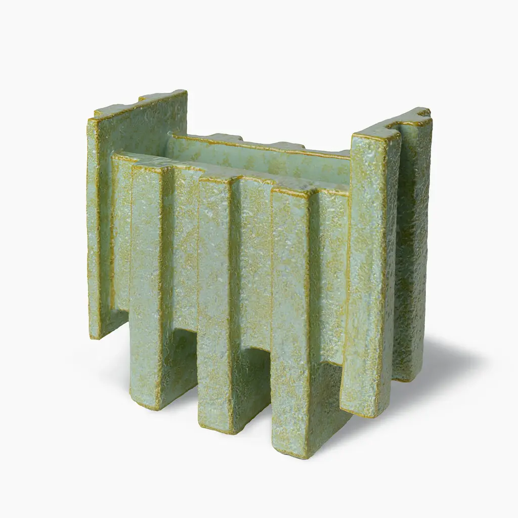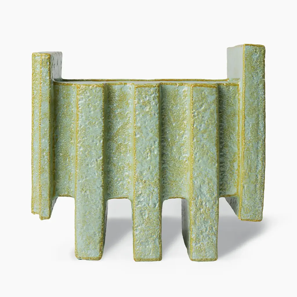 The intriguing complexity of architectural projects inspired Patricia Urquiola the eye-catching design of this ceramic vase, which immediately strikes with its distinctive crenelated silhouette. Featuring a deliberately uneven surface, the piece further echoes its inspiration, while the dynamic edges of its crenelated detailing are neatly emphasized by lemon-yellow brushstrokes.