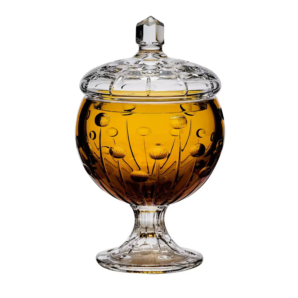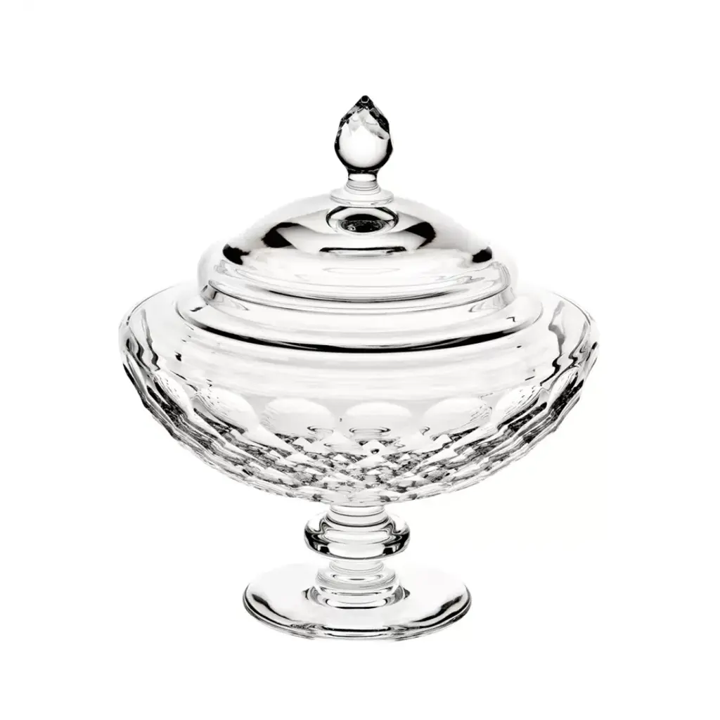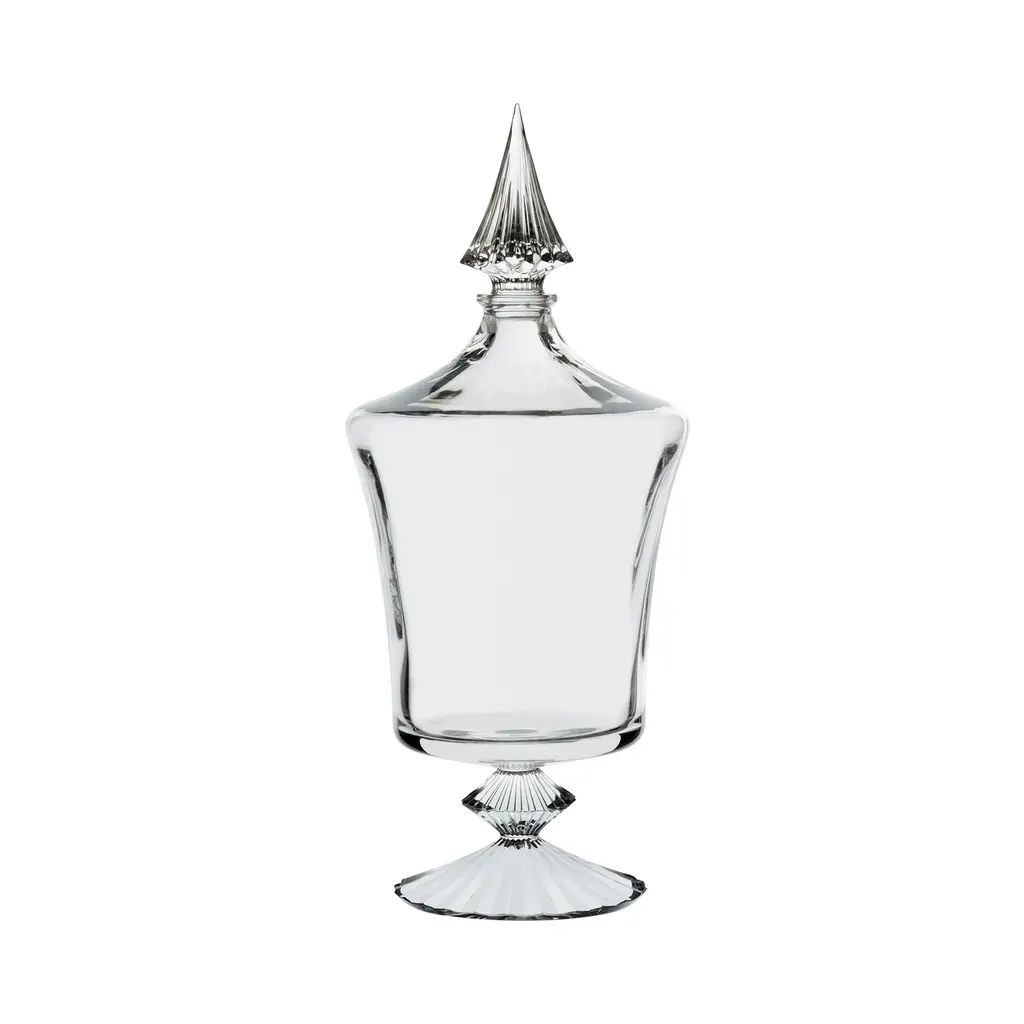 This stunning vase with lid is part of the Metà Morphosis collection. Crafted of transparent glass, this piece can be used as an elegant container in a kitchen, living room, or dining room, while also imbuing any home with the sophisticated allure of its harmonious volumes and striking decorations. Its surface is enlivened by a unique geometric pattern, accented both on the body and on the lid with a clear element that hints at the name of the series with its asymmetric shape. Dynamic and modern, this piece will make a statement in any room.