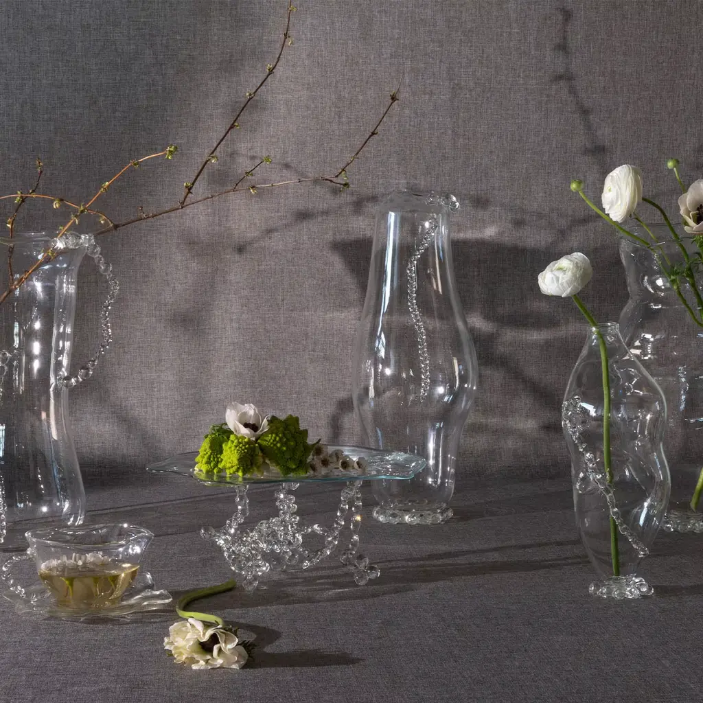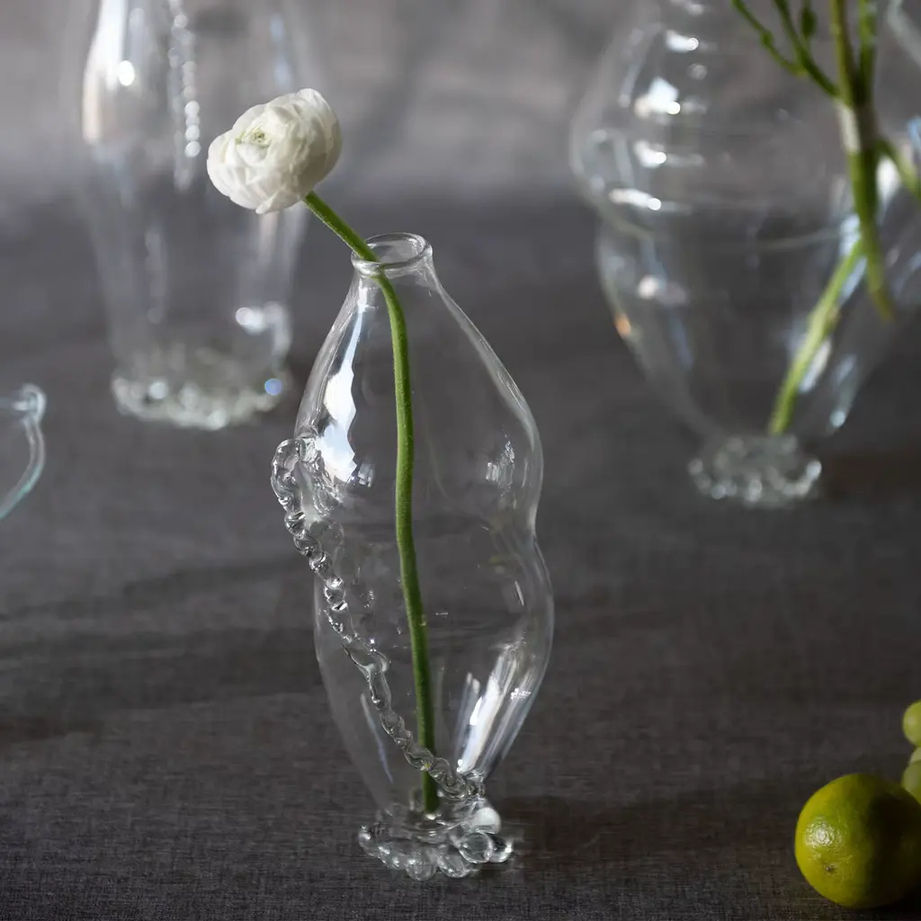 The Metamorphosis vase n.4 explores fluid organic forms inspired by natural transformations. Its sinuous silhouette appears suspended in motion, with a delicate spiral detail wrapping around the body, adding texture and depth. Transparent and airy, this vase plays with light and reflections, transforming space with its subtle complexity and elegant presence.