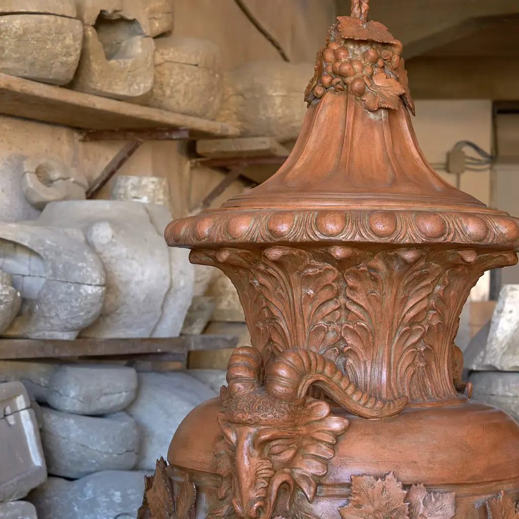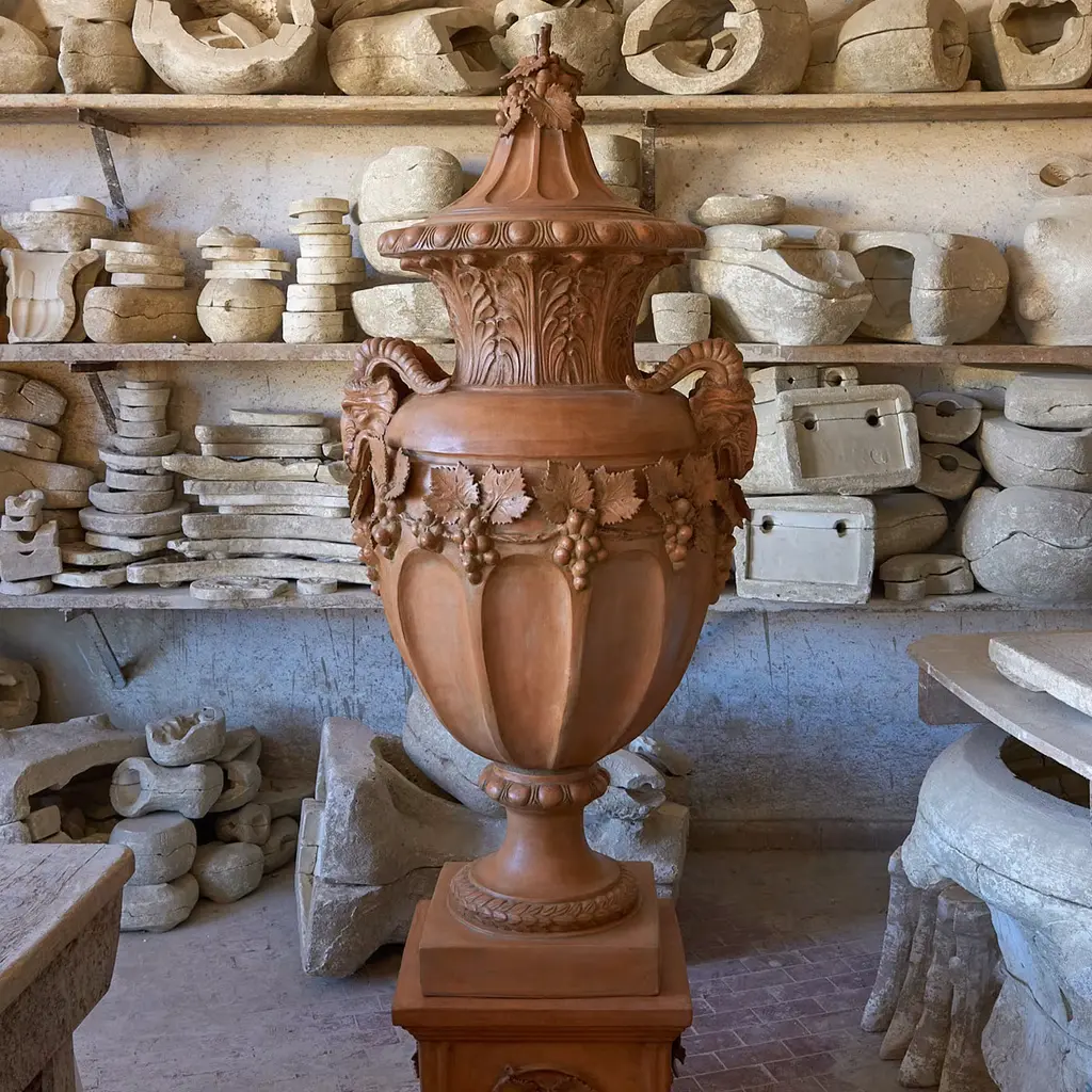 Named after the Italian words for "midsummer", this gorgeous, majestic vase exudes the warm and dreamy feeling of an August landscape. Decorated with grapes and ornamental designs, it is deftly handcrafted of earthenware and features a refined and inventive lid topping its amphora-like silhouette.