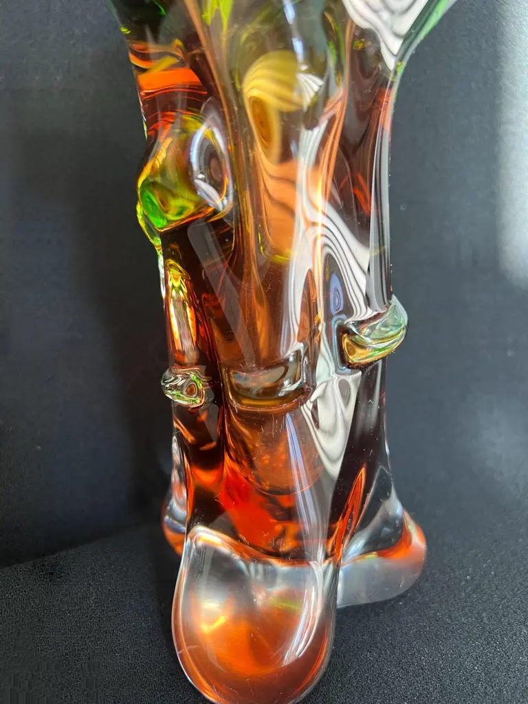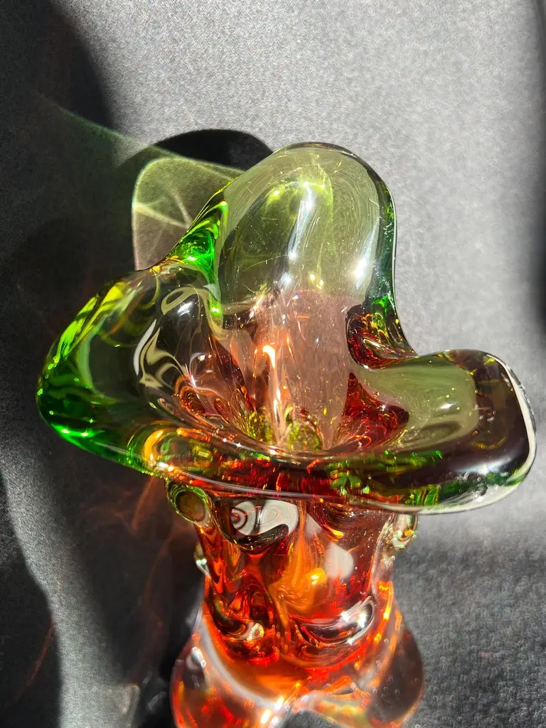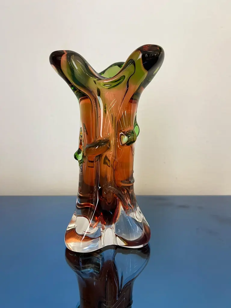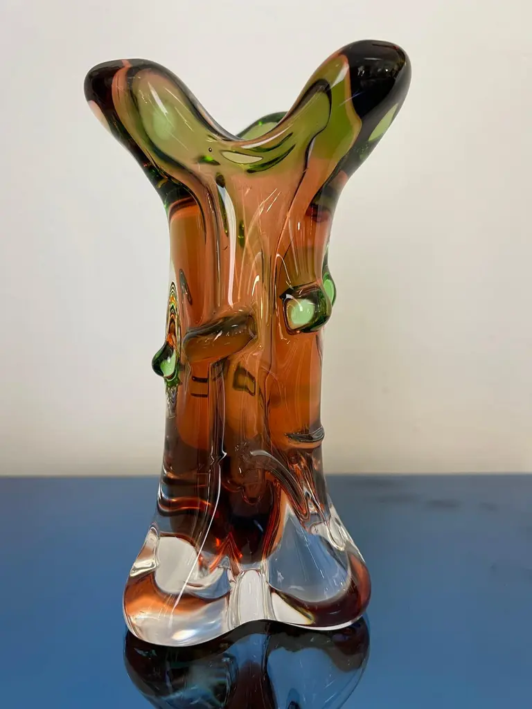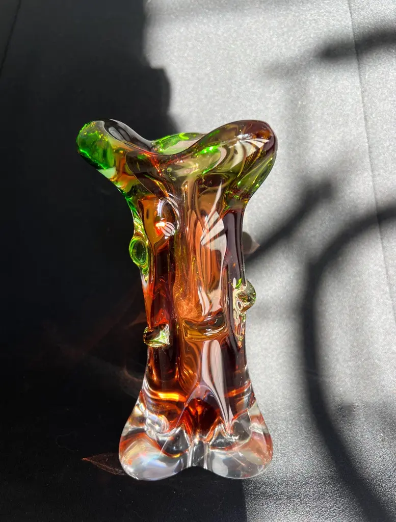 This exceptional vintage glass vase, designed by František Zemek for the renowned Glass Factory Mstisov in Czechoslovakia, Europe, dates back to the 1960s. Featuring a captivating blend of amber and green hues, the vase captures the essence of mid-century modern design with its sophisticated color interplay and expert craftsmanship. There is the possibility of getting a pair, as we currently have two in stock.Minor signs of use on the glass, with some light micro scratches. No chips or significant imperfections.