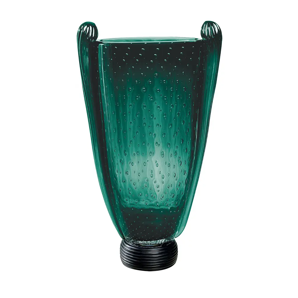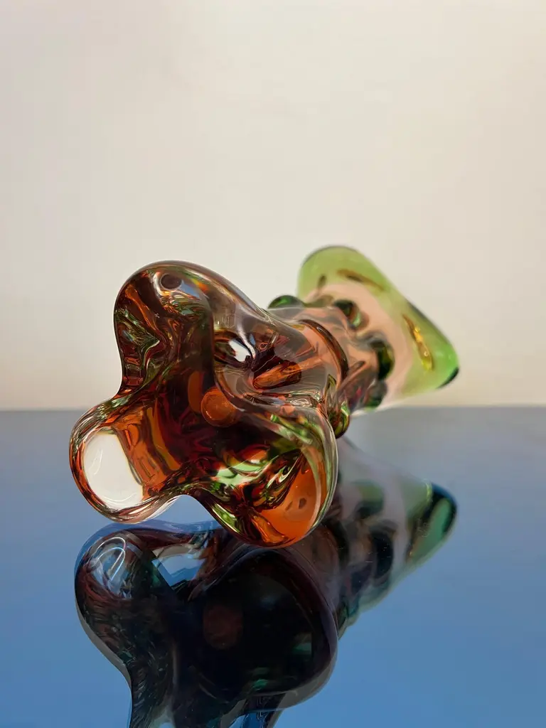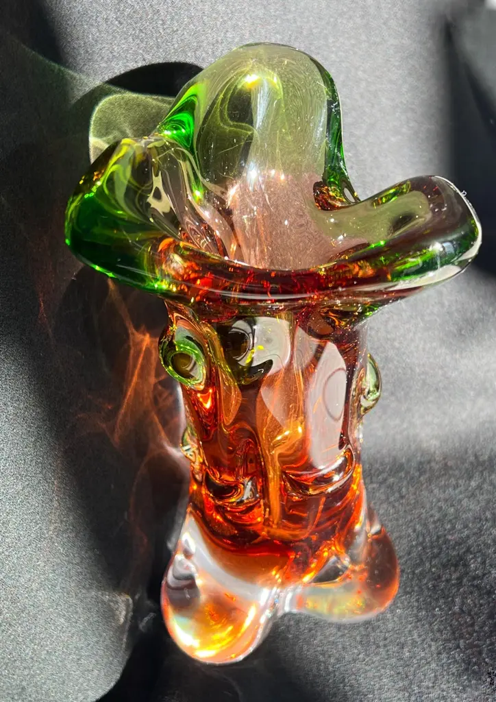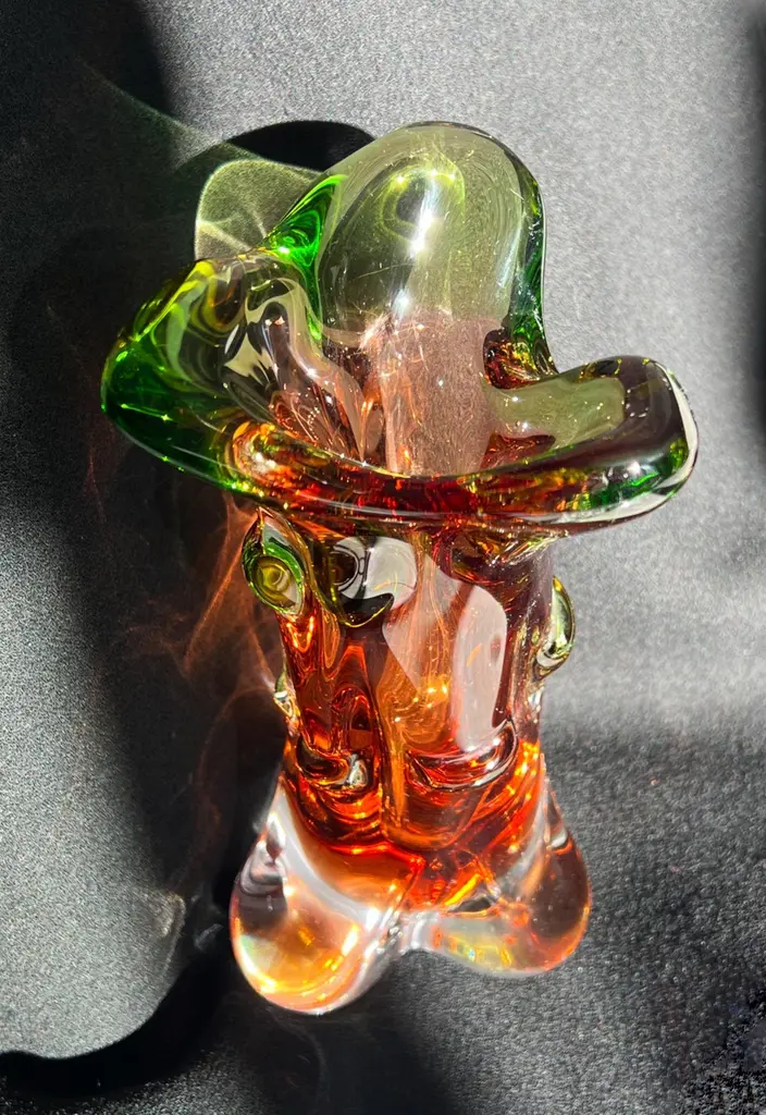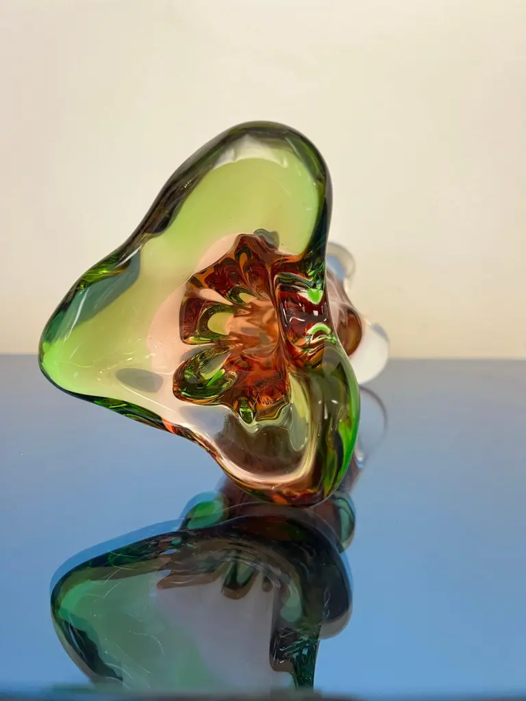 This exceptional vintage glass vase, designed by František Zemek for the renowned Glass Factory Mstisov in Czechoslovakia, Europe, dates back to the 1960s. Featuring a captivating blend of amber and green hues, the vase captures the essence of mid-century modern design with its sophisticated color interplay and expert craftsmanship. There is the possibility of getting a pair, as we currently have two in stock.Minor signs of use on the glass, with some light micro scratches. No chips or significant imperfections.