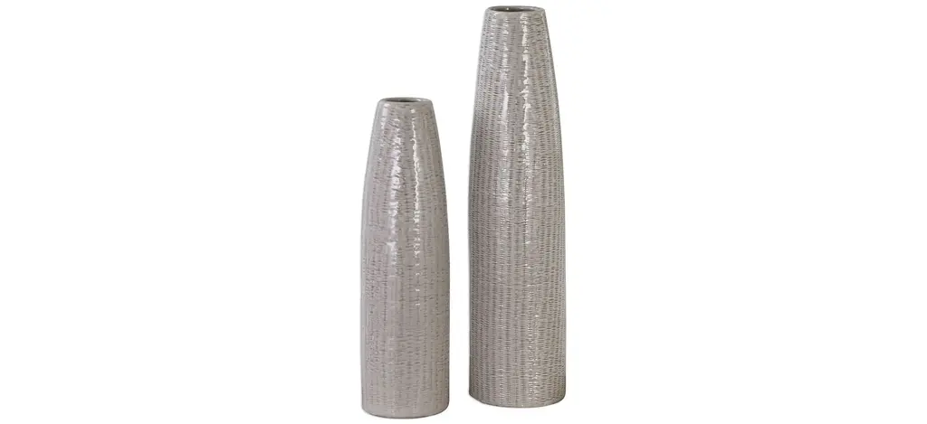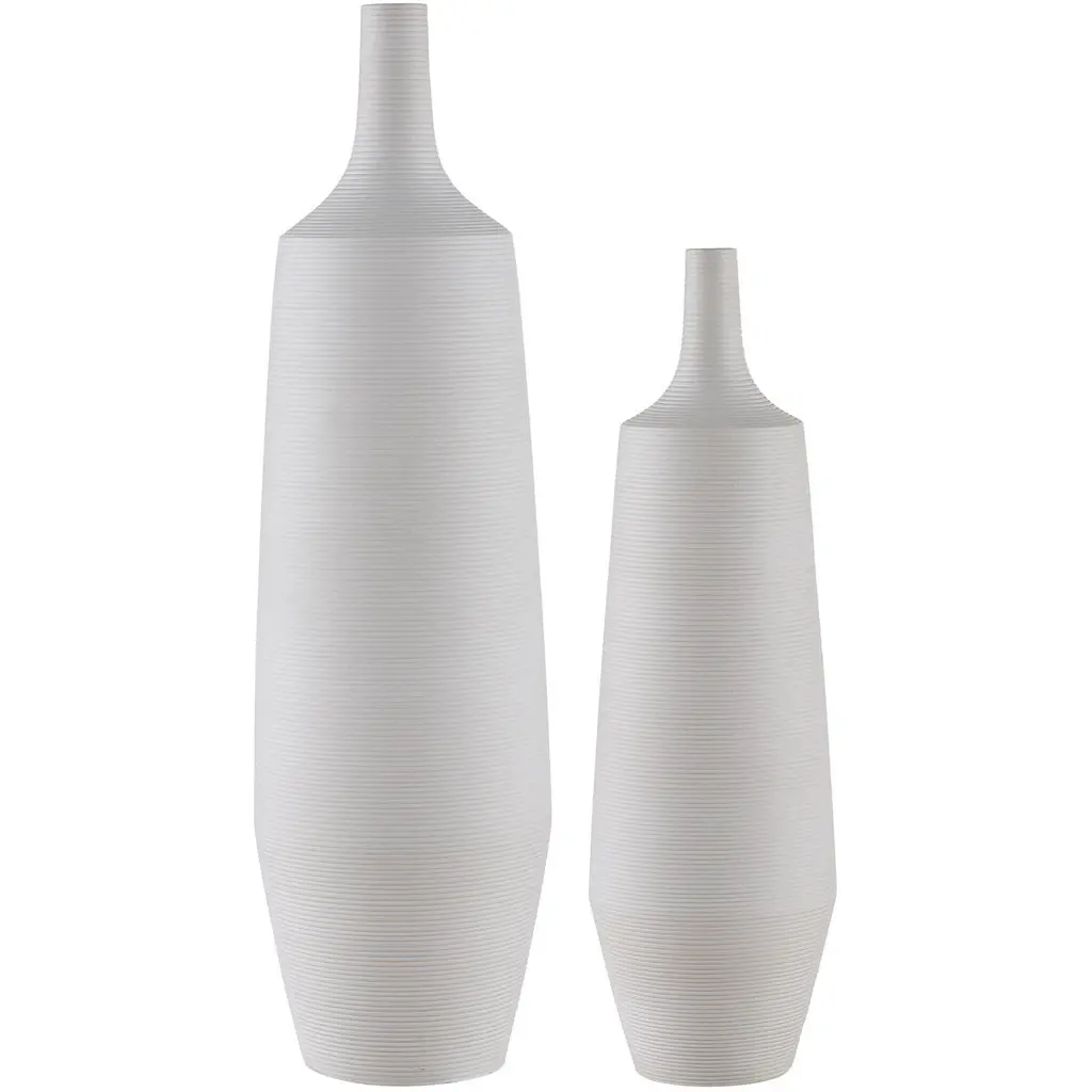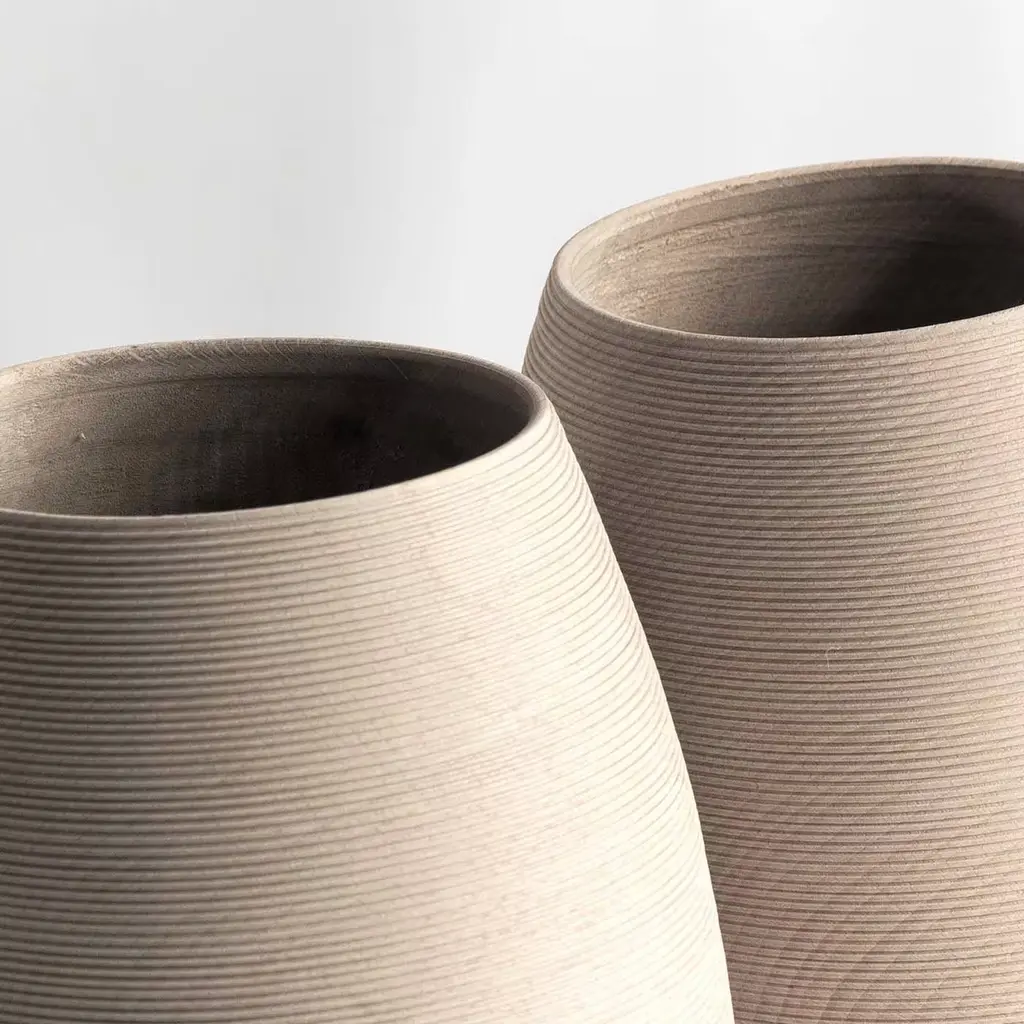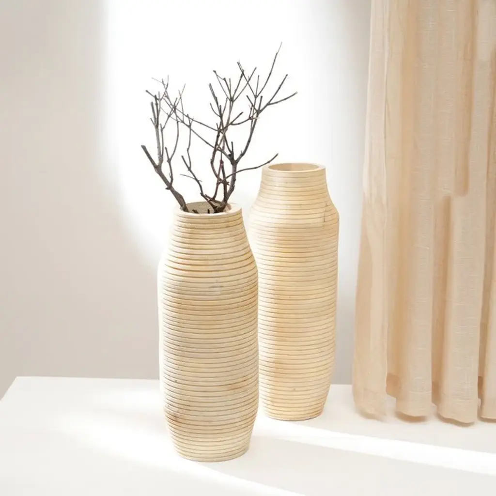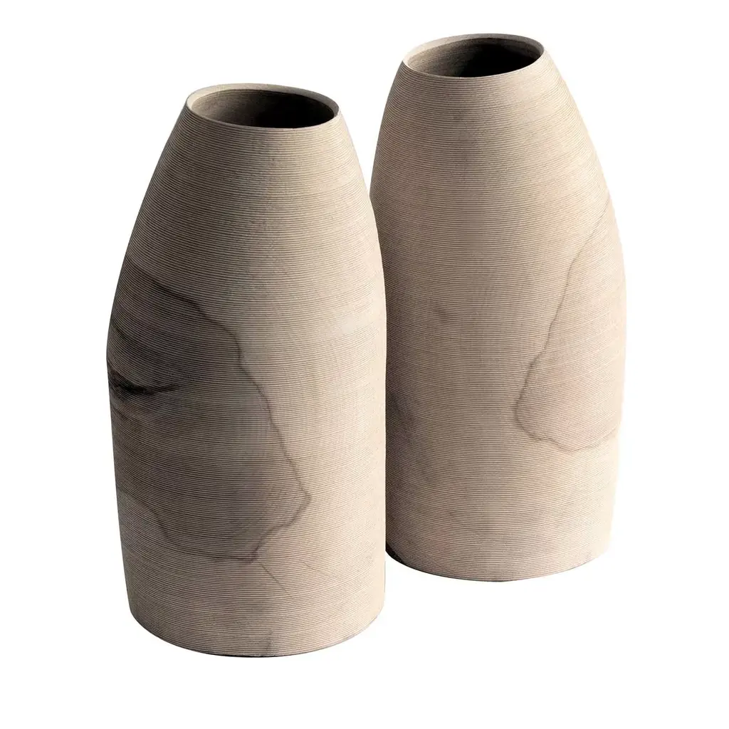 A stunning addition to an elegant and minimalist decor, this set of two vases can also be displayed as standout accent at the entrance of a beach house or as sideboard decoration in a rustic home. The two vases are part of the Millerighe collection, which means "a thousand lines" in Italian, referring to the striking parallel grain of the beechwood that becomes the one-of-a-kind decorative pattern of these pieces. The wood was worked from an entire block and worked to become hollow and extremely thin, with a natural, untreated finish.