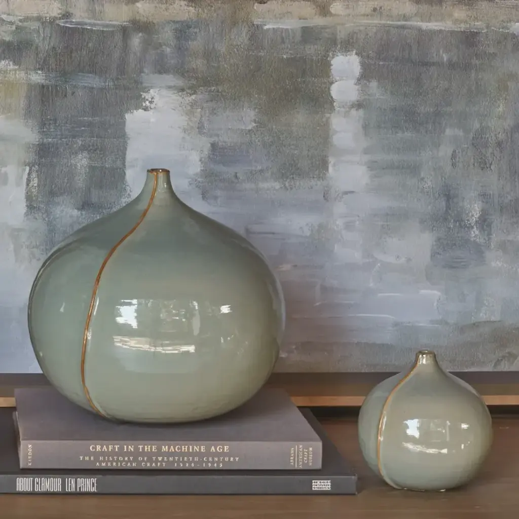 The vertical overlapping edge accentuates the curve of the bulbous Milo vase shapes. Available in four sizes. From a fashion forward perspective, Global Views offers accessories, furniture, statement lighting, and an assortment of rugs and mirrors to add beauty and joy to your home.