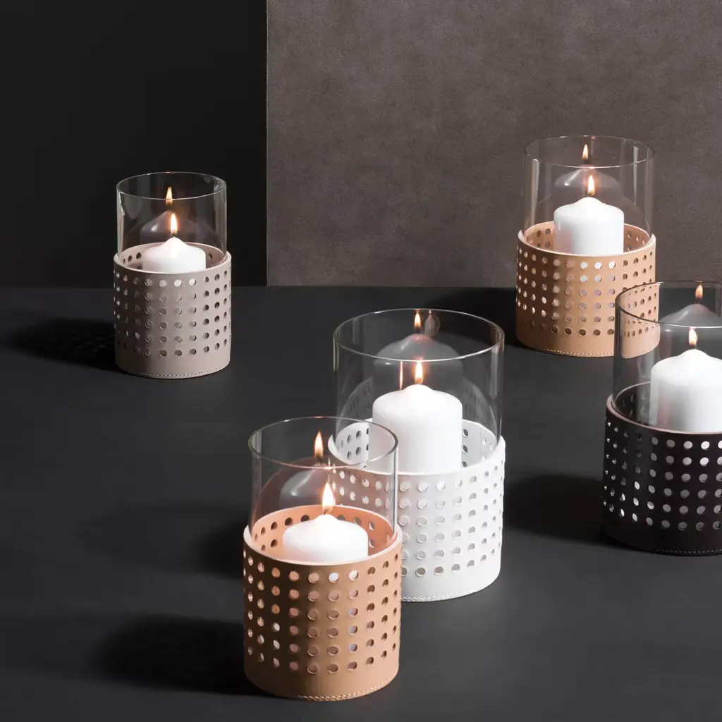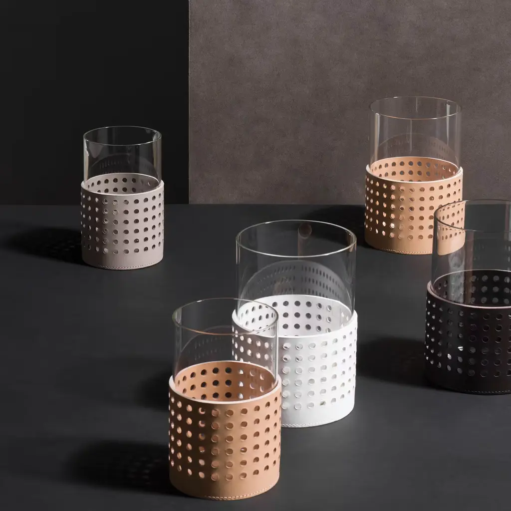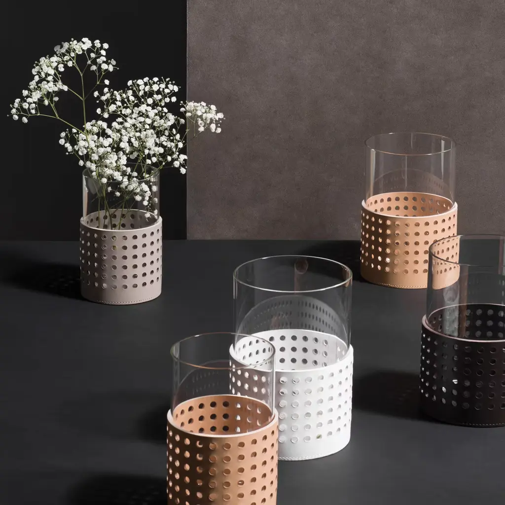 Perfect for displaying flower arrangements or small objects, and equally decorative when empty, this sleek vase combines the cold, smooth texture of the glass with the warm, rich quality of the natural saddle leather that embraces the tinted cylindrical element. The holes and the tonal stitching throughout this fine taupe leather vase give it an elegant, airy look that makes it suitable in any room, displayed solo or together with the large vase from the same collection.