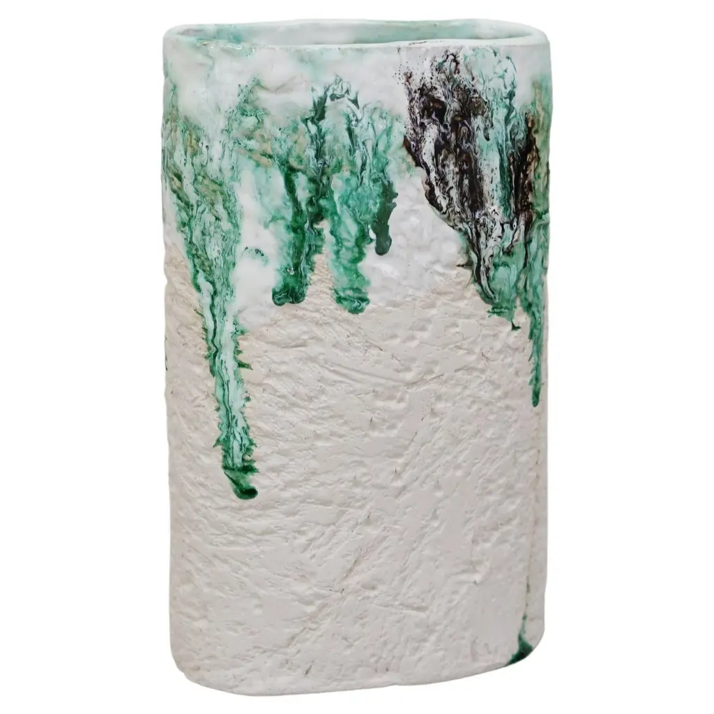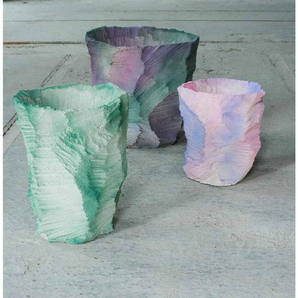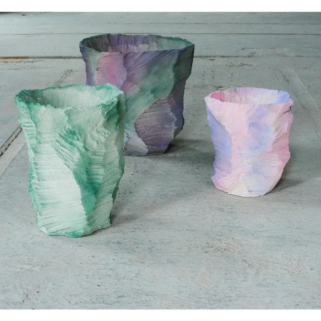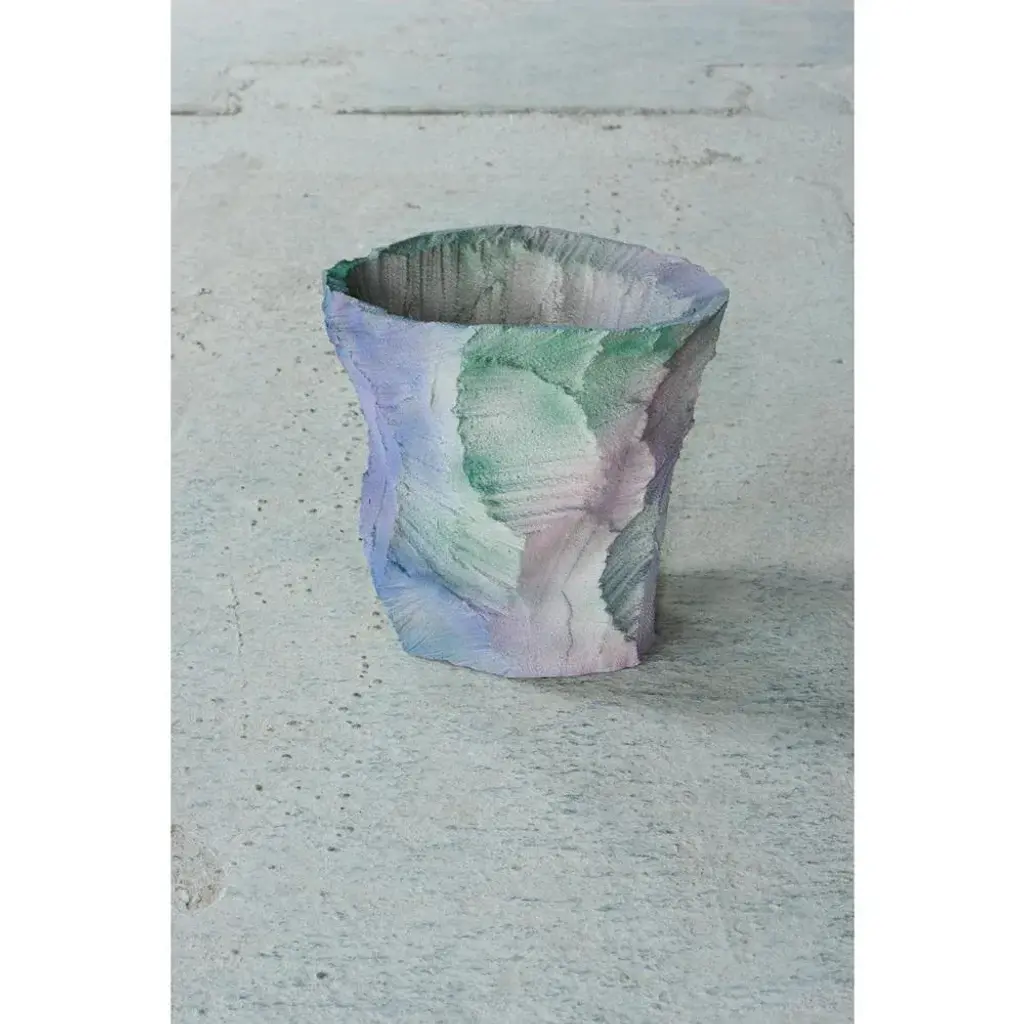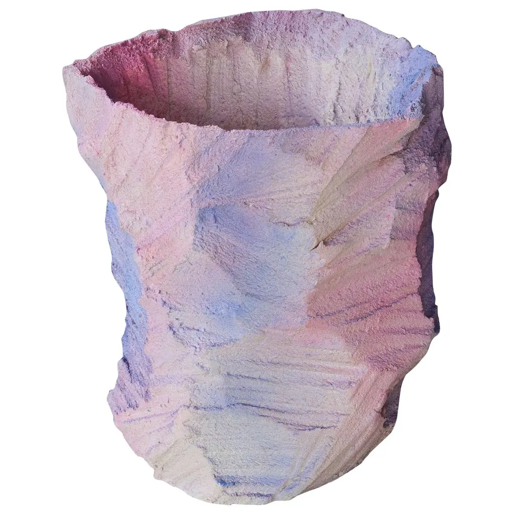 Mineral layer vase by Andredottir & Bobek Dimensions: W 60 x H 45 cm Materials: Reused foam/mattress and jesmontite hardner in color green, purple, pink fade. Artificial Nature is a collaboration between the artist and design duo Josephine Andredottir and Emilie Bobek Wall pieces there imitates landscapes with artificial materials. We create an artificial scene of nature because art and design often find common ground here. The natural colours of rock, stone and moss are what first comes to the eye when looking at the scene from far away, but when moving in between the shapes you slowly feel the transformation from natural to artificial within the objects. Sculptural function as well as physical function is not an aim in itself but is instead replaced with a diverse landscape where the object floats together as a whole. Here you are allowed to explore the materials and explore moss and stone in a new way. The many handcrafted shapes give a natural rough looking surface that allows the eyes to wander and find new places to investigate.