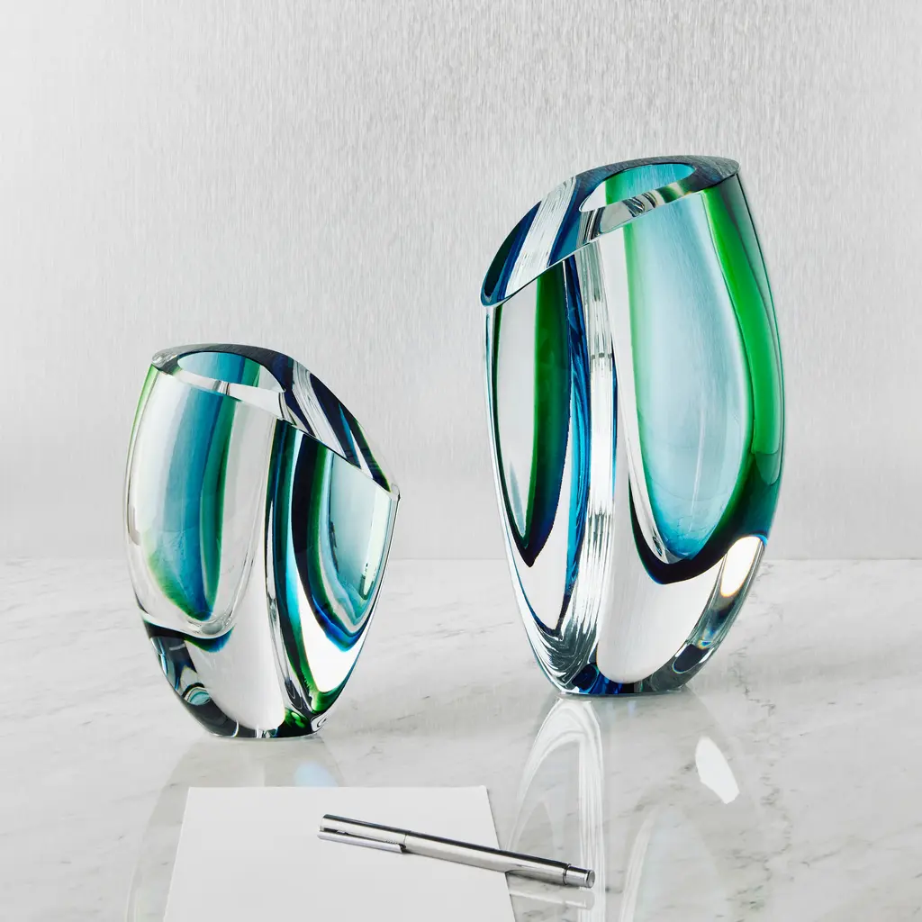 The Mirage Vase by Göran Wärff is a stunning decorative piece from the Kosta Boda Artist Collection. Mouth-blown at Kosta Glassworks using a unique angled pipe technique, its soft, curved form captures warm colors that shimmer like spectra. This elegant vase adds a refined touch of artistry and light to any interior. Highlights