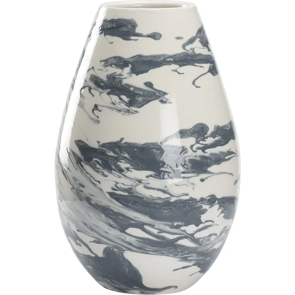 The Mistura Vase is a gorgeous accent piece with a stylish silhouette, displaying sophisticated tones elevated by a playful sense of motion. Featuring a subtle hourglass shape, this vase crafted from mouth-blown art glass showcases intermingling tones of white, gray, and black.